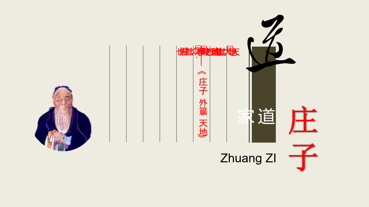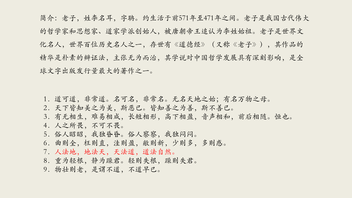 諸子百家道可道,非常道;名可名,非常名。無名,天地之始;有名,萬物之母。故常無欲,以觀其妙;常有欲,以觀其徼。此兩者同出而異名,同謂之玄。玄之又玄,眾妙之門。《道德經》简介:老子,姓李名耳,字聃。约生活于前571年至471年之间。老子是我国古代伟大的哲学家和思想家、道家学派创始人,被唐朝帝王追认为李姓始祖。老子是世界文化名人,世界百位历史名人之一,存世有《道德经》(又称《老子》),其作品的精华是朴素的辩证法,主张无为而治,其学说对中国哲学发展具有深刻影响,是全球文字出版发行量最大的著作之一。天地虽大,其化均也;万物虽多,其治一也;人卒虽众,其主君也。——《庄子·外篇·天地》简介:庄子,姓庄,名周,字子休(亦说子沐)。他是东周战国中期著名的思想家、哲学家和文学家。是继老子之后,道家学派的主要代表人物之一。庄周因崇尚自由而不应楚威王之聘,生平只做过宋国地方的漆园吏。史称“漆园傲吏”,被誉为地方官吏之楷模。他的代表作品为《庄子》,其中的名篇有《逍遥游》、《齐物论》等。与老子齐名,被称为老庄。简介:孔子(公元前551年9月28日―公元前478年4月11日),姓孔,名丘,字仲尼。中国著名的大思想家、大教育家。孔子开创了私人讲学的风气,是儒家学派的创始人。孔子曾受业于老子,带领部分弟子周游列国十四年,晚年修订六经,即《诗》《书》《礼》《乐》《易》《春秋》。相传他有弟子三千,其中七十二贤人。孔子去世后,其弟子及其再传弟子把孔子及其弟子的言行语录和思想记录下来,整理编成儒家经典《论语》。入國而不存其士,則亡國矣。見賢而不急,則緩其君矣。非賢無急,非士無與慮國,緩賢忘士,而能以其國存者,未曾有也。《墨家》简介:墨子,名翟(dí)。墨子是墨家学派的创始人,也是战国时期著名的思想家、教育家、科学家、军事家。墨子是中国历史上唯一一个农民出身的哲学家,他提出了“兼爱”、“非攻”、“尚贤”、“尚同”、“天志”、“明鬼”、“非命”、“非乐”、“节葬”、“节用”等观点。以兼爱为核心,以节用、尚贤为支点。墨子在战国时期创立了以几何学、物理学、光学为突出成就的一整套科学理论。其弟子根据墨子生平事迹的史料,收集其语录,完成了《墨子》一书传世。凡治天下必因人情。仁者謂其中心欣然愛人也目失鏡,則無以正鬚眉;身失道,則無以知迷惑立志難也,不在勝人,在自勝。小知不可使謀事,小忠不可使主法。《法經》简介:韩非(约公元前280--前233年),战国末期杰出的思想家、哲学家和散文家。韩非著有《韩非子》一书。在先秦诸子散文中独树一帜,呈现韩非极为重视唯物主义与效益主义思想,积极倡导君主专制主义理论,目的是为专制君主提供富国强兵的思想。韩非深爱自己的祖国韩国,但他的政治主张并不被韩王所重视,而秦王嬴政却为了得到韩非而出兵攻打韩国。李斯因嫉妒韩非的才能,将韩非害死在秦国。但是,韩非的法家思想却被秦王嬴政所重用,帮助秦国富国强兵,最终统一六国。SunWU简介:孙子(约公元前545年—约公元前470年),字长卿。中国春秋时期著名的军事家、政治家,尊称兵圣,被誉为“百世兵家之师”、“东方兵学的鼻祖”。他由齐至吴,经吴国重臣伍员(伍子胥)举荐,向吴王阖闾进呈所著兵法十三篇,受到重用为将。他曾率领吴国军队大败楚国军队,占领楚国都城郢城,几近覆亡楚国。其著有巨作《孙子兵法》十三篇,为后世兵法家所推崇,被誉为“兵学圣典”,置于《武经七书》之首,成为国际间最著名的兵学典范之书。BIANQUE
