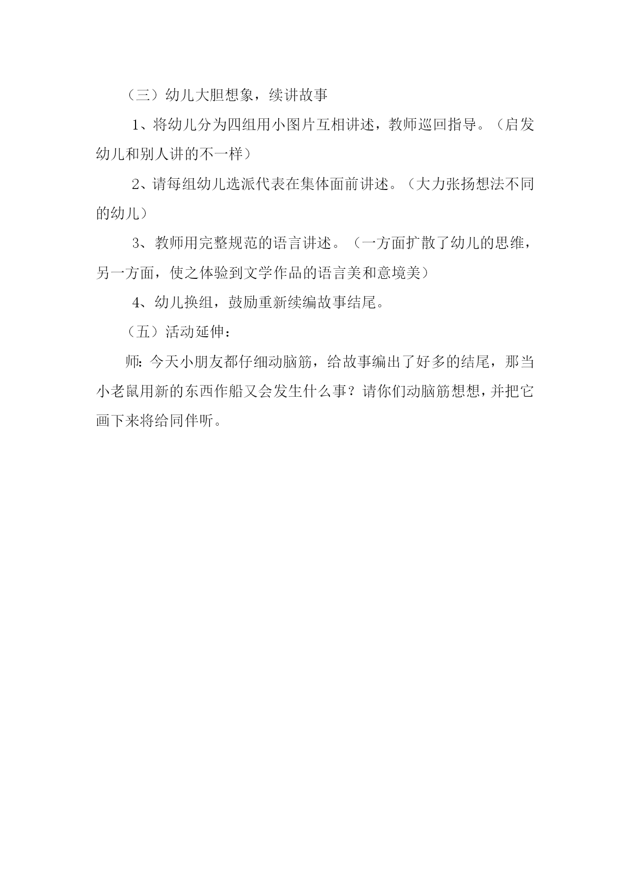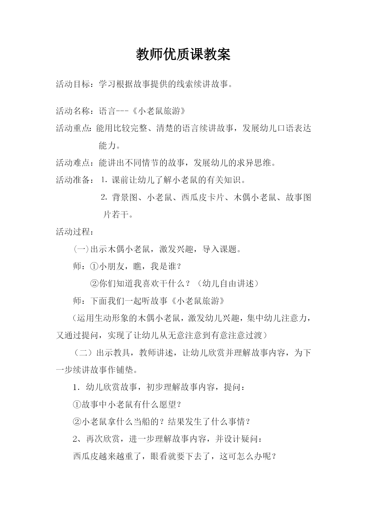 教师优质课教案 活动目标:学习根据故事提供的线索续讲故事。 活动名称:语言---《小老鼠旅游》 活动重点:能用比较完整、清楚的语言续讲故事,发展幼儿口语表达能力。 活动难点:能讲出不同情节的故事,发展幼儿的求异思维。 活动准备:⒈课前让幼儿了解小老鼠的有关知识。 ⒉背景图、小老鼠、西瓜皮卡片、木偶小老鼠、故事图片若干。 活动过程: (一)出示木偶小老鼠,激发兴趣,导入课题。 师:①小朋友,瞧,我是谁? ②你们知道我喜欢干什么?(幼儿自由讲述) 师:下面我们一起听故事《小老鼠旅游》 (运用生动形象的木偶小老鼠,激发幼儿兴趣,集中幼儿注意力,又通过提问,实现了让幼儿从无意注意到有意注意过渡) (二)出示教具,教师讲述,让幼儿欣赏并理解故事内容,为下一步续讲故事作铺垫。 1.幼儿欣赏故事,初步理解故事内容,提问: ①故事中小老鼠有什么愿望? ②小老鼠拿什么当船的?结果发生了什么事情? 2、再次欣赏,进一步理解故事内容,并设计疑问: 西瓜皮越来越重了,眼看就要下去了,这可怎么办呢? (三)幼儿大胆想象,续讲故事 1、将幼儿分为四组用小图片互相讲述,教师巡回指导。(启发幼儿和别人讲的不一样) 2、请每组幼儿选派代表在集体面前讲述。(大力张扬想法不同的幼儿) 3、教师用完整规范的语言讲述。(一方面扩散了幼儿的思维,另一方面,使之体验到文学作品的语言美和意境美) 4、幼儿换组,鼓励重新续编故事结尾。 (五)活动延伸: 师:今天小朋友都仔细动脑筋,给故事编出了好多的结尾,那当小老鼠用新的东西作船又会发生什么事?请你们动脑筋想想,并把它画下来将给同伴听。