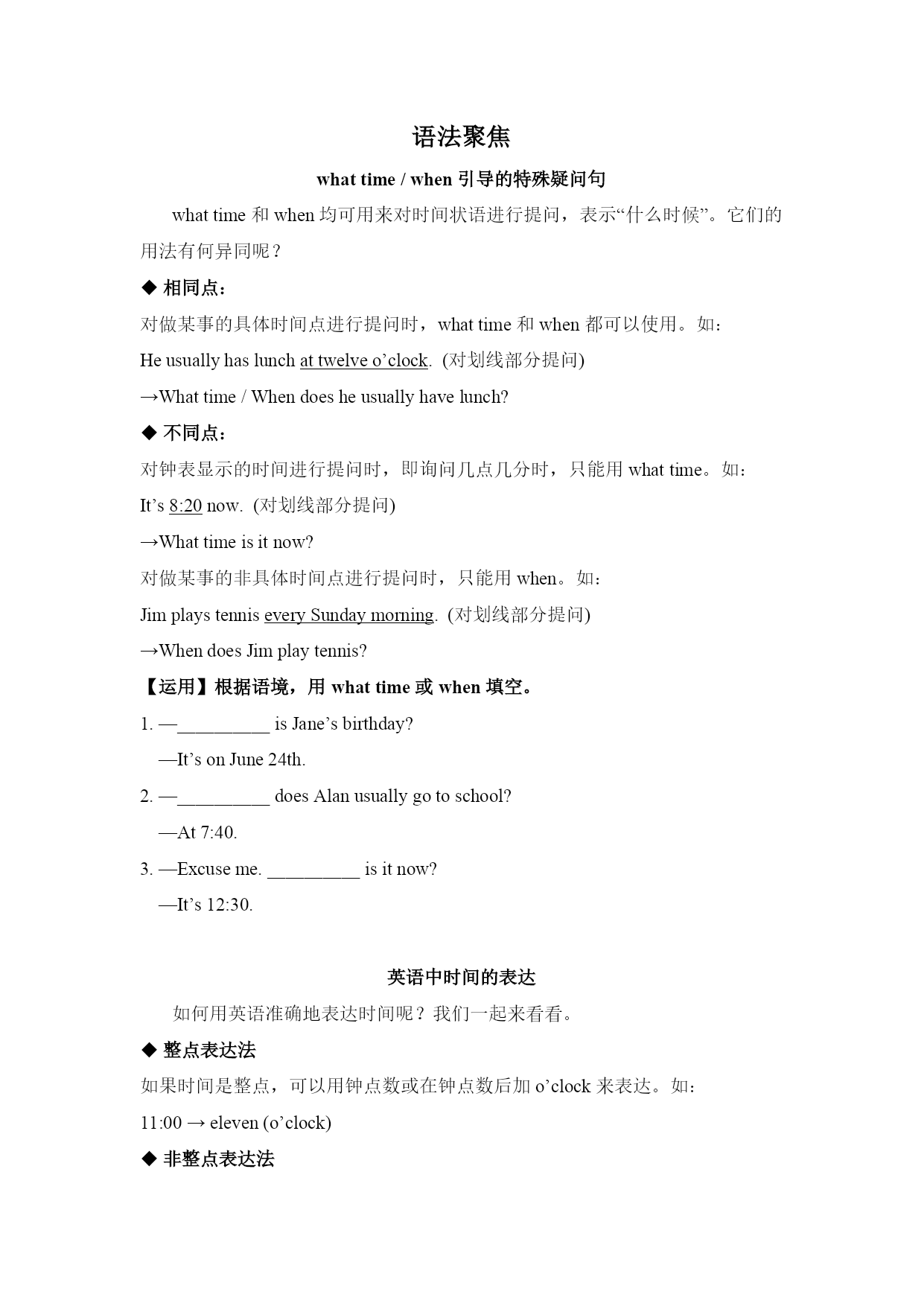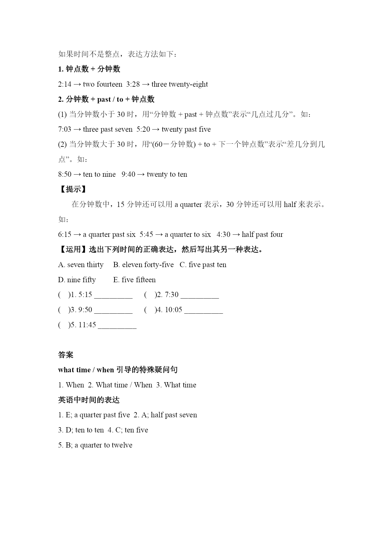 语法聚焦 whattime/when引导的特殊疑问句 whattime和when均可用来对时间状语进行提问,表示“什么时候”。它们的用法有何异同呢? ◆相同点: 对做某事的具体时间点进行提问时,whattime和when都可以使用。如: Heusuallyhaslunchattwelveo’clock.(对划线部分提问) →Whattime/Whendoesheusuallyhavelunch? ◆不同点: 对钟表显示的时间进行提问时,即询问几点几分时,只能用whattime。如: It’s8:20now.(对划线部分提问) →Whattimeisitnow? 对做某事的非具体时间点进行提问时,只能用when。如: JimplaystenniseverySundaymorning.(对划线部分提问) →WhendoesJimplaytennis? 【运用】根据语境,用whattime或when填空。 1.—__________isJane’sbirthday? —It’sonJune24th. 2.—__________doesAlanusuallygotoschool? —At7:40. 3.—Excuseme.__________isitnow? —It’s12:30. 英语中时间的表达 如何用英语准确地表达时间呢?我们一起来看看。 ◆整点表达法 如果时间是整点,可以用钟点数或在钟点数后加o’clock来表达。如: 11:00→eleven(o’clock) ◆非整点表达法 如果时间不是整点,表达方法如下: 1.钟点数+分钟数 2:14→twofourteen3:28→threetwenty-eight 2.分钟数+past/to+钟点数 (1)当分钟数小于30时,用“分钟数+past+钟点数”表示“几点过几分”。如: 7:03→threepastseven5:20→twentypastfive (2)当分钟数大于30时,用“(60-分钟数)+to+下一个钟点数”表示“差几分到几点”。如: 8:50→tentonine9:40→twentytoten 【提示】 在分钟数中,15分钟还可以用aquarter表示,30分钟还可以用half来表示。如: 6:15→aquarterpastsix5:45→aquartertosix4:30→halfpastfour 【运用】选出下列时间的正确表达,然后写出其另一种表达。 A.seventhirtyB.elevenforty-fiveC.fivepastten D.ninefiftyE.fivefifteen ()1.5:15__________()2.7:30__________ ()3.9:50__________()4.10:05__________ ()5.11:45__________ 答案 whattime/when引导的特殊疑问句 1.When2.Whattime/When3.Whattime 英语中时间的表达 1.E;aquarterpastfive2.A;halfpastseven 3.D;tentoten4.C;tenfive 5.B;aquartertotwelve