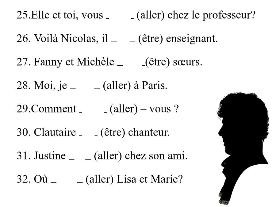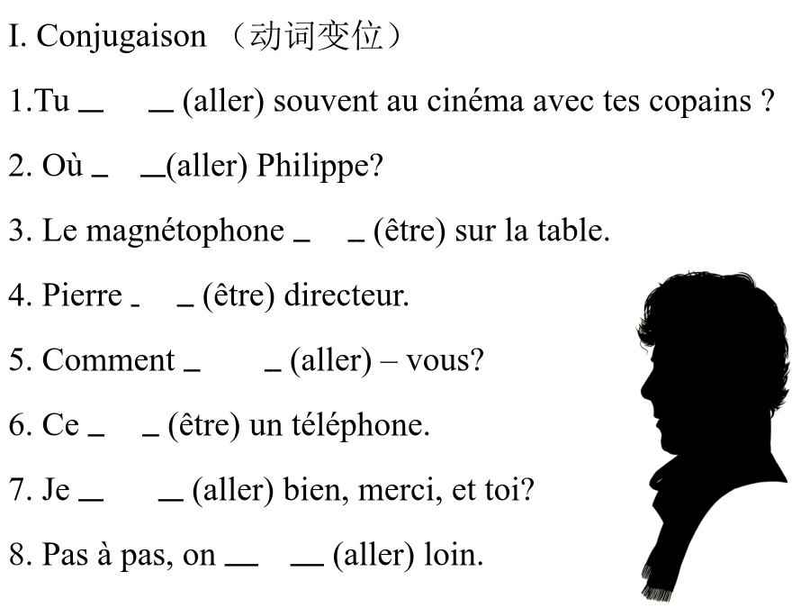 LesexercicesdegrammairesI.Conjugaison(动词变位) 1.Tuvas(aller)souventaucinémaavectescopains? 2.Oùva(aller)Philippe? 3.Lemagnétophoneest(être)surlatable. 4.Pierreest(être)directeur. 5.Commentallez(aller)–vous? 6.Ceest(être)untéléphone. 7.Jevais(aller)bien,merci,ettoi? 8.Pasàpas,onva(aller)loin. 9.Nousallons(aller)bien,merci. 10.Pierreest(être)stylisteàBeijing. 11.Philippeva(aller)chezLemat. 12.Yvesva(aller)chezMarie. 13.Cesont(être)deschemisespourvous. 14.MarieetBenoîtvont(aller)àlamesse. 15.Quiest(être)–ce? 16.Fannyva(aller)bien. 17.Jacquesetmoi,nousallons(aller)àLille. 18.Nathalieest(être)chanteuse. 19.Moi,jesuis(être)élèvedulycée. 20.LyceetMoniquevont(aller)àShanghai. 21.22.Ilssont(être)artistes etilsvont(aller)àVenise. 23.Pascal,tuvas(aller)àBeijing? 24.Ceest(être)unartiste. 25.Elleettoi,vousallez(aller)chezleprofesseur? 26.VoilàNicolas,ilest(être)enseignant. 27.FannyetMichèlesont(être)sœurs. 28.Moi,jevais(aller)àParis. 29.Commentallez(aller)–vous? 30.Clautaireest(être)chanteur. 31.Justineva(aller)chezsonami. 32.Oùvont(aller)LisaetMarie? 33.Moi,jevaisbien. 34.Et,toi,tuestàNiceaussi? 35.Pierre?Ilestartiste. 36.Catherineetmoi,noussommesàLille. 37.Salut,Philippe!Tuvasbien? 38.MonsieurLamy,vousallezbien? 39.Çavabien.Merci! 40.ToietAnne,vousallezbien? 41.FannyetMichèlesontsœurs,ellessontàTaiyuan. 42.Ettoi,commentvas-tu? 43.LisaetMarie,oùvont-elles? 44.JesuischezLemat. 45.Claireetmoi,nousallonsàMarseille. 46.Est-cetonlivre?Oui,c’estmonlivre. 47.Est-cequevousallezbienMonsieurLemat? 48.Maintenantjevaischezmonamie.49.AnnieetPierresontartiste,ilssontàParis. 50.Nathalieestartiste,elletravailleàLyon. II.Masculinouféminin(阴阳性) 51.Francaisen.f 52.cousinn.m 53.enseignanten.f 54.directeurn.m 55.chanteusen.f 56.artisten. 57.chemisen.f 58.paquetn.m 59.porten.f 60.voituren.f 61.magnétophonen.m 62.coqn.m 63.valisen.f 64.ordinateurn.m 65.téléphonen.m 66.appareilphotographiquen.m 67.classen.f 68.arbren.m 69.fenêtren.f 70.livren.m 71.auton.f 72.miraclen.m 73.amien.f 74.murn.m 75.poulen.f
