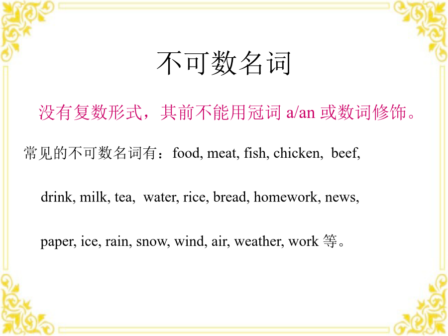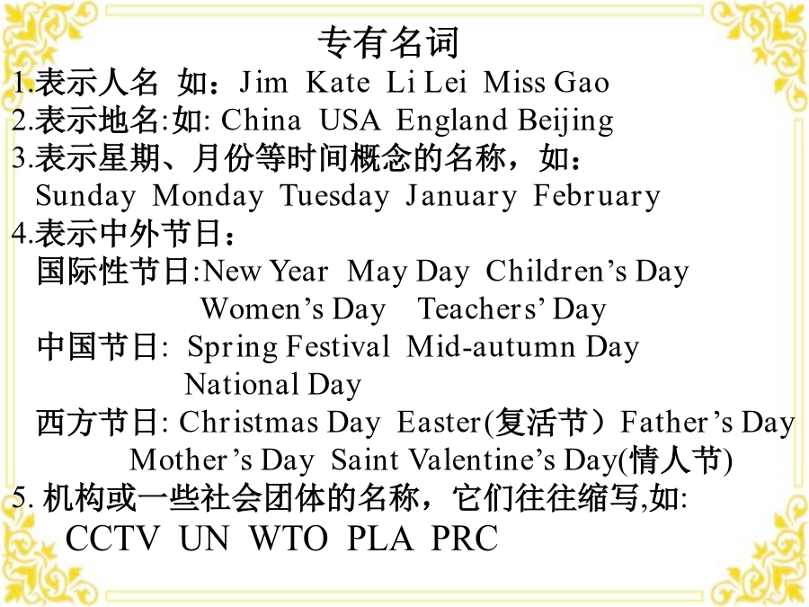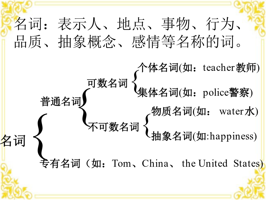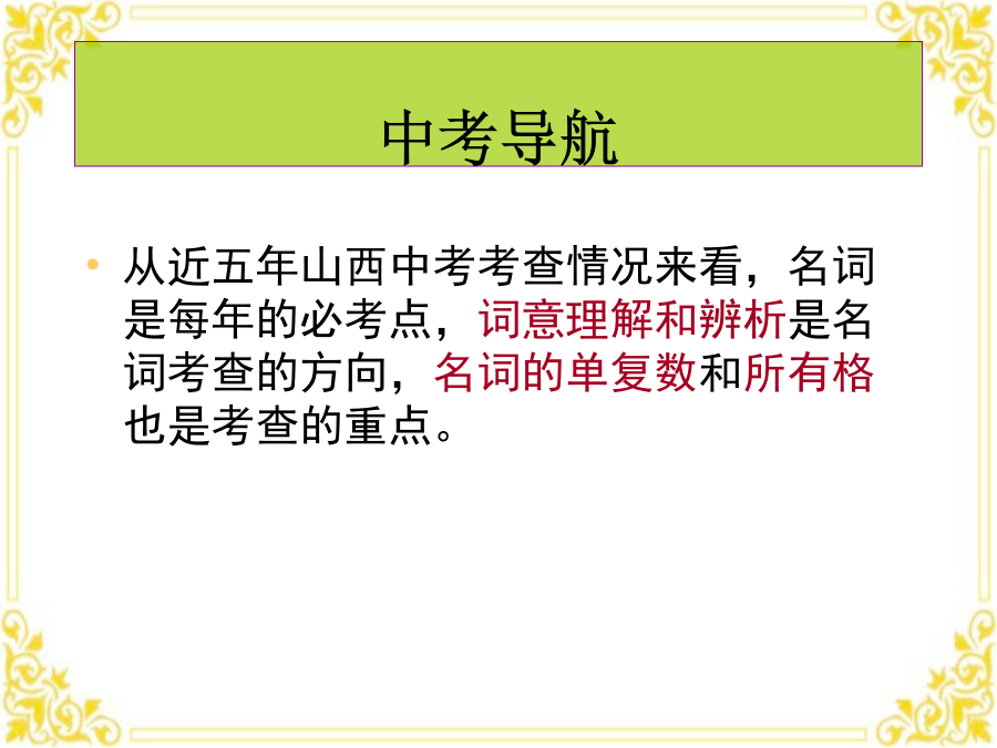 名词从近五年山西中考考查情况来看,名词是每年的必考点,词意理解和辨析是名词考查的方向,名词的单复数和所有格也是考查的重点。名词{ 专有名词(如:Tom、China、theUnitedStates)专有名词 1.表示人名如:JimKateLiLeiMissGao 2.表示地名:如:ChinaUSAEnglandBeijing 3.表示星期、月份等时间概念的名称,如: SundayMondayTuesdayJanuaryFebruary 4.表示中外节日: 国际性节日:NewYearMayDayChildren’sDay Women’sDayTeachers’Day 中国节日:SpringFestivalMid-autumnDay NationalDay 西方节日:ChristmasDayEaster(复活节)Father’sDay Mother’sDaySaintValentine’sDay(情人节) 5.机构或一些社会团体的名称,它们往往缩写,如: CCTVUNWTOPLAPRC不可数名词不可数名词数量的表达法: 通过改变量词形式的方法来表示不可数名词的量既可做不可数名词,又可做可数名词的:cap---capsdesk-desks PKtimeIPKtimeIE.以-f或-fe结尾的可数名词,先将f或fe变成v再加-esF.字母+o结尾的名词 无生命的-s photospianoszoosradiosPKtimeⅡ不规则变化3.表示“某国人”的名词,其变化有三种情况5.复合名词的复数形式四、名词的所有格Mike’sbagthelegsofthechair四、名词的所有格四、名词的所有格2.表示某人的家、店铺、诊所时,常省略所有格后面的名词myteacher’soffice7山西的省会 8教室的门 9我父亲的一个朋友 10他的两个兄弟 11他弟弟的一张照片(照片属于他弟弟) 12他弟弟的一张照片(照片里的人是他弟)主谓一致3.像goods,chopsticks,shoes,glasses,clothestrousers等表示复数含义的词,动词用复数。police,people(人们),youth(青年们)只有单数形式,但表示复数意义,动词用复数。–Arethereany_____onthehill? –Yes,therearesome. A.houseB.sheepC.animalD.horse 2.Youcanputyourschoolbagson___desk. A.LilyandLucyB.Lily’sandLucy C.LilyandLucy’sD.Lily’sandLucy’s 3.___isalwaysonDecember25everyyear. A.AprilFool’stimeB.TreePlantingDay C.ChristmasDayD.NewYear’sDay 4.Wehaven’tany___inthefridge.Let’sgoandbuysomecokeandorangejuice. A.vegetablesB.fruitC.drinkD.food 5.–Whatalwaysgoesupbutnevercomesdown? --_____. A.AgeB.WaterC.AirD.TemperatureLook!Thosethree__________(Englishman)aretalkingwiththree__________(German). Wecanseealotof_________(sheep)atthefootofthehill,butwecan’tseeany__________(people)there. Nowwecangetmuch_____________(information)throughtheInternet.4.–Where’syourbrother? --At____________(Mr.Smith). 5.Those_______________(womanteacher)areallverypopularinthatschool. 6.Intheflood(洪水)manychildrenlosttheir________(life). 7.September10this_________(teacher)Day. 8.LucyandLilyaregoodfriendsof__________(her).