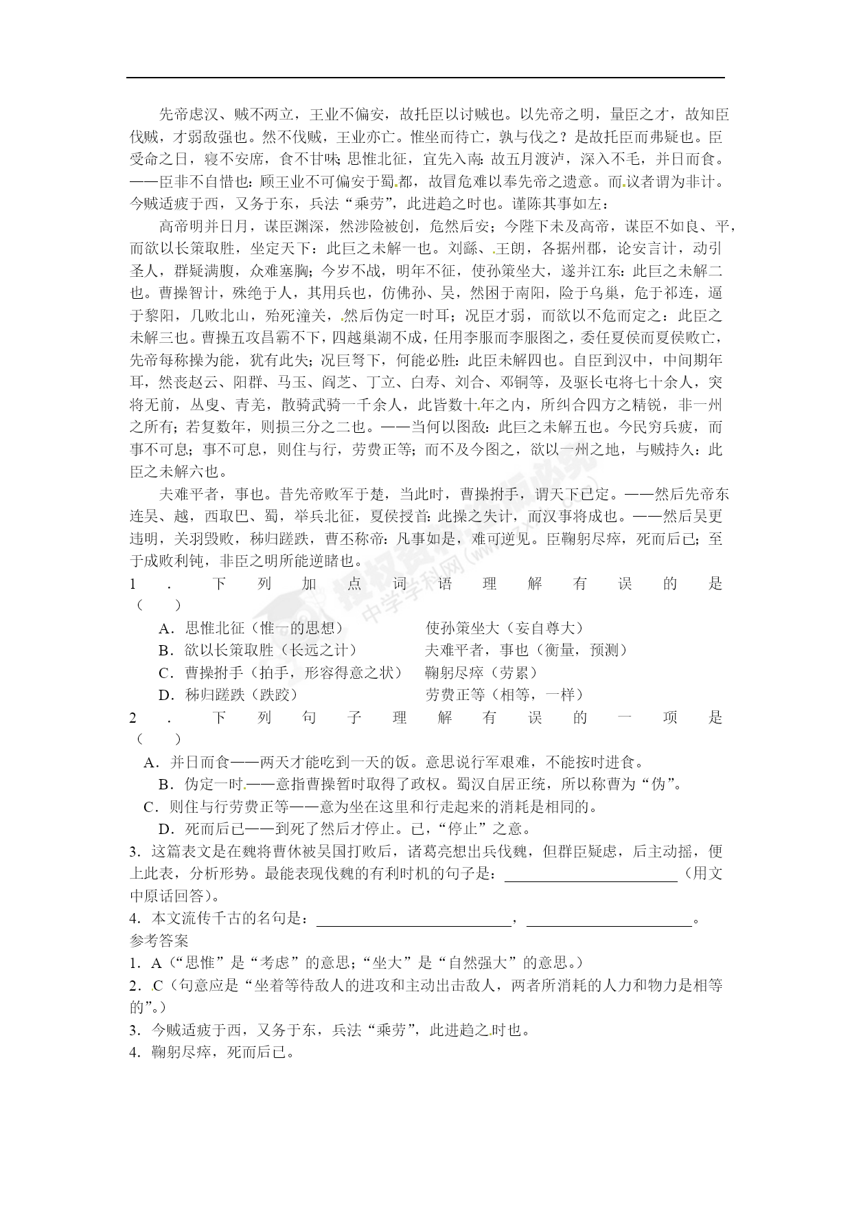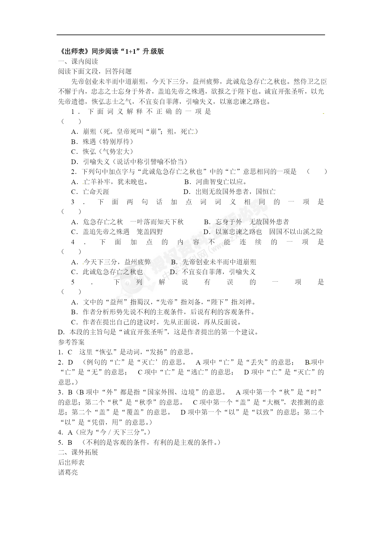 《出师表》同步阅读“1+1”升级版 一、课内阅读 阅读下面文段,回答问题 先帝创业未半而中道崩殂,今天下三分,益州疲弊,此诚危急存亡之秋也。然侍卫之臣不懈于内,忠志之士忘身于外者,盖追先帝之殊遇,欲报之于陛下也。诚宜开张圣听,以光先帝遗德,恢弘志士之气,不宜妄自菲薄,引喻失义,以塞忠谏之路也。 1.下面词义解释不正确的一项是() A.崩殂(死。皇帝死叫“崩”;殂,死亡) B.殊遇(特别厚待) C.恢弘(气势宏大) D.引喻失义(说话中称引譬喻不恰当) 2.下列句中加点字与“此诚危急存亡之秋也”中的“亡”意思相同的一项是() A.亡羊补牢,犹未晚也。B.河曲智叟亡以应。 C.亡命天涯D.出则无敌国外患者,国恒亡 3.下面两句话加点词词义相同的一项是() A.危急存亡之秋一叶落而知天下秋B.忘身于外无敌国外患者 C.盖追先帝之殊遇笼盖四野D.以塞忠谏之路也固国不以山溪之险 4.下面加点的内容不能连续的一项是()[来源:学科网] A.今天下三分,益州疲弊B.先帝创业未半而中道崩殂 C.此诚危急存亡之秋也D.不宜妄自菲薄,引喻失义 5.下列解说有误的一项是() A.文中的“益州”指蜀汉,“先帝”指刘备,“陛下”指刘禅。 B.作者分析形势先说不利的主观条件,后说有利的客观条件。 C.作者在提出自己的建议时,先从正面说,再从反面说。 D.本段的主旨句是“诚宜开张圣听”,这是作者提出的第一个建议。 参考答案 1.C这里“恢弘”是动词,“发扬”的意思。 2.D(例句的“亡”是“灭亡’的意思。A项中“亡”是“丢失”的意思;B项中“亡”是“无”的意思;C项中“亡”是“逃亡”的意思;D项中“亡”是“灭亡”的意思。)[来源:Zxxk.Com] 3.B(B项中“外”都是指“国家外围、边境”的意思。A项中第一个“秋”是“时”的意思;第二个“秋”是“秋季”的意思。C项中第一个“盖”是“大概”,表推测的意思;第二个“盖”是“覆盖”的意思。D项中第一个“以”是“以致”的意思;第二个“以”是“凭借,用”的意思。) 4.A(应为“今/天下三分”。) 5.B(不利的是客观的条件,有利的是主观的条件。) 二、课外拓展 后出师表 诸葛亮 先帝虑汉、贼不两立,王业不偏安,故托臣以讨贼也。以先帝之明,量臣之才,故知臣伐贼,才弱敌强也。然不伐贼,王业亦亡。惟坐而待亡,孰与伐之?是故托臣而弗疑也。臣受命之日,寝不安席,食不甘味;思惟北征,宜先入南:故五月渡泸,深入不毛,并日而食。——臣非不自惜也:顾王业不可偏安于蜀都,故冒危难以奉先帝之遗意。而议者谓为非计。今贼适疲于西,又务于东,兵法“乘劳”,此进趋之时也。谨陈其事如左: 高帝明并日月,谋臣渊深,然涉险被创,危然后安;今陛下未及高帝,谋臣不如良、平,而欲以长策取胜,坐定天下:此巨之未解一也。刘繇、王朗,各据州郡,论安言计,动引圣人,群疑满腹,众难塞胸;今岁不战,明年不征,使孙策坐大,遂并江东:此巨之未解二也。曹操智计,殊绝于人,其用兵也,仿佛孙、吴,然困于南阳,险于乌巢,危于祁连,逼于黎阳,几败北山,殆死潼关,然后伪定一时耳;况臣才弱,而欲以不危而定之:此臣之未解三也。曹操五攻昌霸不下,四越巢湖不成,任用李服而李服图之,委任夏侯而夏侯败亡,先帝每称操为能,犹有此失;况巨弩下,何能必胜:此臣未解四也。自臣到汉中,中间期年耳,然丧赵云、阳群、马玉、阎芝、丁立、白寿、刘合、邓铜等,及驱长屯将七十余人,突将无前,丛叟、青羌,散骑武骑一千余人,此皆数十年之内,所纠合四方之精锐,非一州之所有;若复数年,则损三分之二也。——当何以图敌:此巨之未解五也。今民穷兵疲,而事不可息;事不可息,则住与行,劳费正等;而不及今图之,欲以一州之地,与贼持久:此臣之未解六也。 夫难平者,事也。昔先帝败军于楚,当此时,曹操拊手,谓天下已定。——然后先帝东连吴、越,西取巴、蜀,举兵北征,夏侯授首:此操之失计,而汉事将成也。——然后吴更违明,关羽毁败,秭归蹉跌,曹丕称帝:凡事如是,难可逆见。臣鞠躬尽瘁,死而后已;至于成败利钝,非臣之明所能逆睹也。 1.下列加点词语理解有误的是()[来源:学科网] A.思惟北征(惟一的思想)使孙策坐大(妄自尊大) B.欲以长策取胜(长远之计)夫难平者,事也(衡量,预测)[来源:学科网ZXXK] C.曹操拊手(拍手,形容得意之状)鞠躬尽瘁(劳累) D.秭归蹉跌(跌跤)劳费正等(相等,一样) 2.下列句子理解有误的一项是() A.并日而食——两天才能吃到一天的饭。意思说行军艰难,不能按时进食。 B.伪定一时——意指曹操暂时取得了政权。蜀汉自居正统,所以称曹为“伪”。[来源:学&科&网] C.则住与行劳费正等——意为坐在这里和行走起来的消耗是相同的。 D.死而后已——到死了然后才停止。已,“停止”之意。 3.这篇表文是在魏将