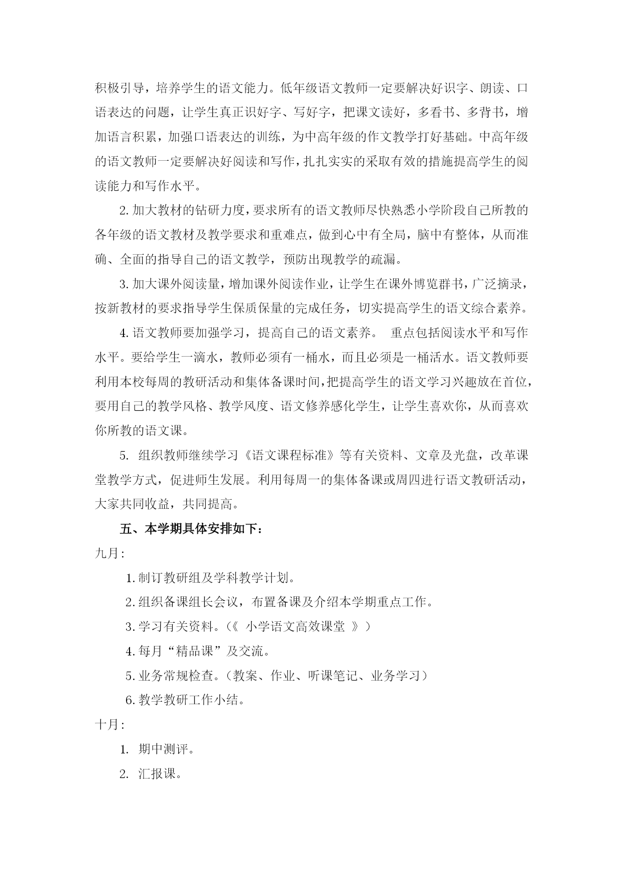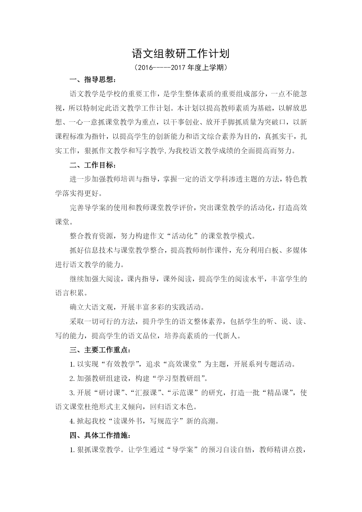 语文组教研工作计划 (2016-----2017年度上学期) 一、指导思想: 语文教学是学校的重要工作,是学生整体素质的重要组成部分,一点不能忽视,所以特制定此语文教学工作计划。本计划以提高教师素质为基础,以解放思想、一心一意抓课堂教学为重点,以干事创业、放开手脚抓质量为突破口,以新课程标准为指针,以提高学生的创新能力和语文综合素养为目的,真抓实干,扎实工作,狠抓作文教学和写字教学,为我校语文教学成绩的全面提高而努力。 二、工作目标: 进一步加强教师培训与指导,掌握一定的语文学科渗透主题的方法,特色教学落实得更好。 完善导学案的使用和教师课堂教学评价,突出课堂教学的活动化,打造高效课堂。 整合教育资源,努力构建作文“活动化”的课堂教学模式。 抓好信息技术与课堂教学整合,提高教师制作课件,充分利用白板、多媒体进行语文教学的能力。 继续加强大阅读,课内指导,课外阅读,提高学生的阅读水平,丰富学生的语言积累。 确立大语文观,开展丰富多彩的实践活动。 采取一切可行的方法,提升学生的语文整体素养,包括学生的听、说、读、写的能力,提高学生的语文品位,培养高素质的一代新人。 三、主要工作重点: 1.以实现“有效教学”,追求“高效课堂”为主题,开展系列专题活动。 2.加强教研组建设,构建“学习型教研组”。 3.开展“研讨课”、“汇报课”、“示范课”的研究,打造一批“精品课”,使语文课堂杜绝形式主义倾向,回归语文本色。 4.掀起我校“读课外书,写规范字”新的高潮。 四、具体工作措施: 1.狠抓课堂教学。让学生通过“导学案”的预习自读自悟,教师精讲点拨,积极引导,培养学生的语文能力。低年级语文教师一定要解决好识字、朗读、口语表达的问题,让学生真正识好字、写好字,把课文读好,多看书、多背书,增加语言积累,加强口语表达的训练,为中高年级的作文教学打好基础。中高年级的语文教师一定要解决好阅读和写作,扎扎实实的采取有效的措施提高学生的阅读能力和写作水平。 2.加大教材的钻研力度,要求所有的语文教师尽快熟悉小学阶段自己所教的各年级的语文教材及教学要求和重难点,做到心中有全局,脑中有整体,从而准确、全面的指导自己的语文教学,预防出现教学的疏漏。 3.加大课外阅读量,增加课外阅读作业,让学生在课外博览群书,广泛摘录,按新教材的要求指导学生保质保量的完成任务,切实提高学生的语文综合素养。 4.语文教师要加强学习,提高自己的语文素养。重点包括阅读水平和写作水平。要给学生一滴水,教师必须有一桶水,而且必须是一桶活水。语文教师要利用本校每周的教研活动和集体备课时间,把提高学生的语文学习兴趣放在首位,要用自己的教学风格、教学风度、语文修养感化学生,让学生喜欢你,从而喜欢你所教的语文课。 5.组织教师继续学习《语文课程标准》等有关资料、文章及光盘,改革课堂教学方式,促进师生发展。利用每周一的集体备课或周四进行语文教研活动,大家共同收益,共同提高。 五、本学期具体安排如下: 九月: 1.制订教研组及学科教学计划。 2.组织备课组长会议,布置备课及介绍本学期重点工作。 3.学习有关资料。(《小学语文高效课堂》) 4.每月“精品课”及交流。 5.业务常规检查。(教案、作业、听课笔记、业务学习) 6.教学教研工作小结。 十月: 1.期中测评。 2.汇报课。 3.每月“精品课”及交流。 4.各年段课外读书交流展示。 5.经验交流。(培养学生习作兴趣和习作能力) 6.业务常规检查。(教案、作业、听课笔记、业务学习) 7.教学教研工作小结。 十一月: 1.各年级作业展评。 2.理论学习。 3.每月“精品课”及交流。 4.经验交流。(培养学生听、说、读等语文能力的点滴做法。) 5.业务常规检查。(教案、作业、听课笔记、业务学习、集体备课) 6.教学教研工作小结。 十二月: 1.理论学习。 2.制定复习计划。 3.组织语文复习研讨课。 4.优秀教案展评。 5.经验交流。(如何上好复习课) 6.整理各种归档材料。