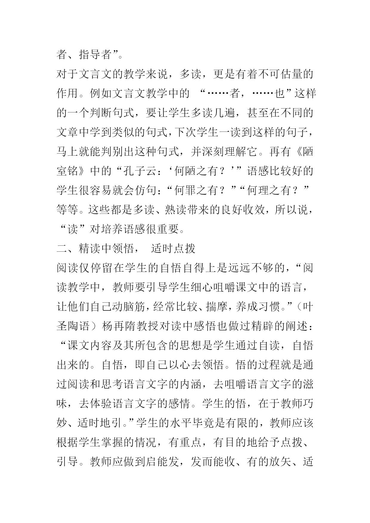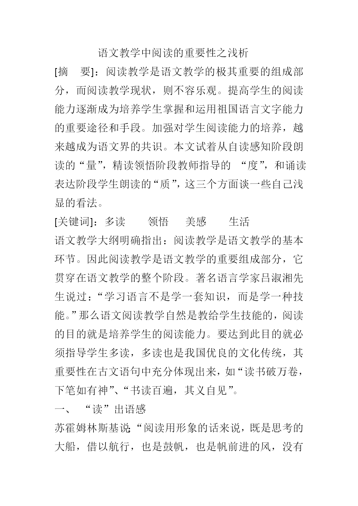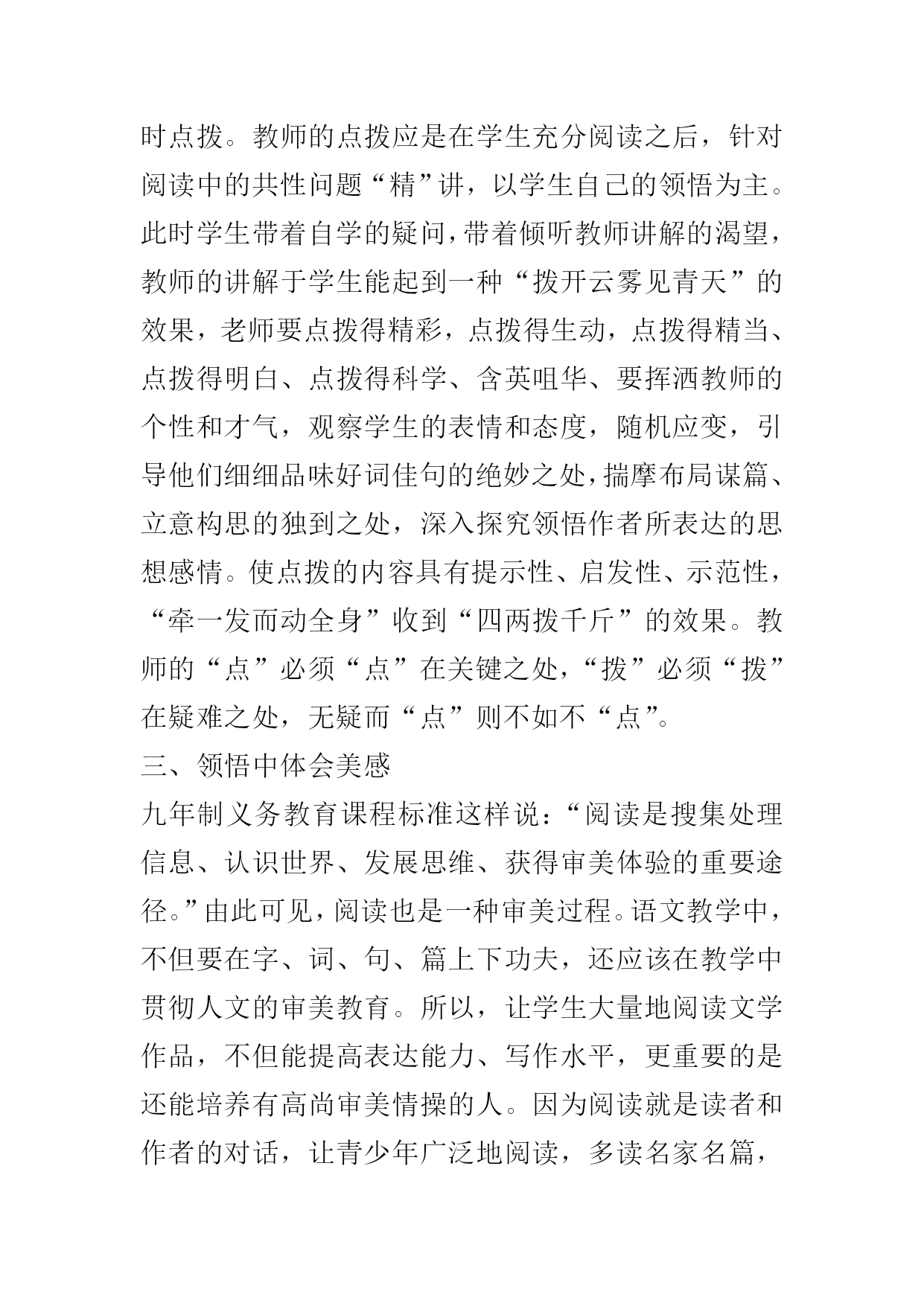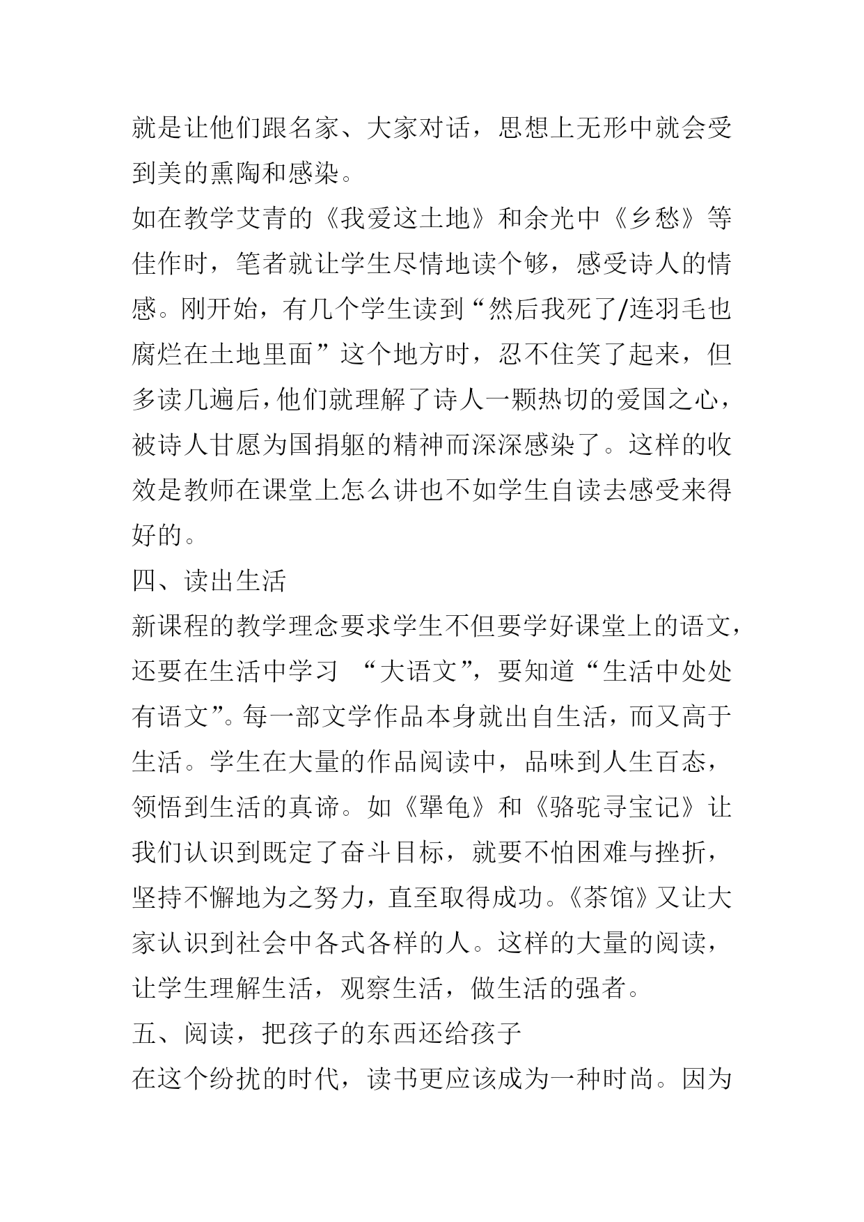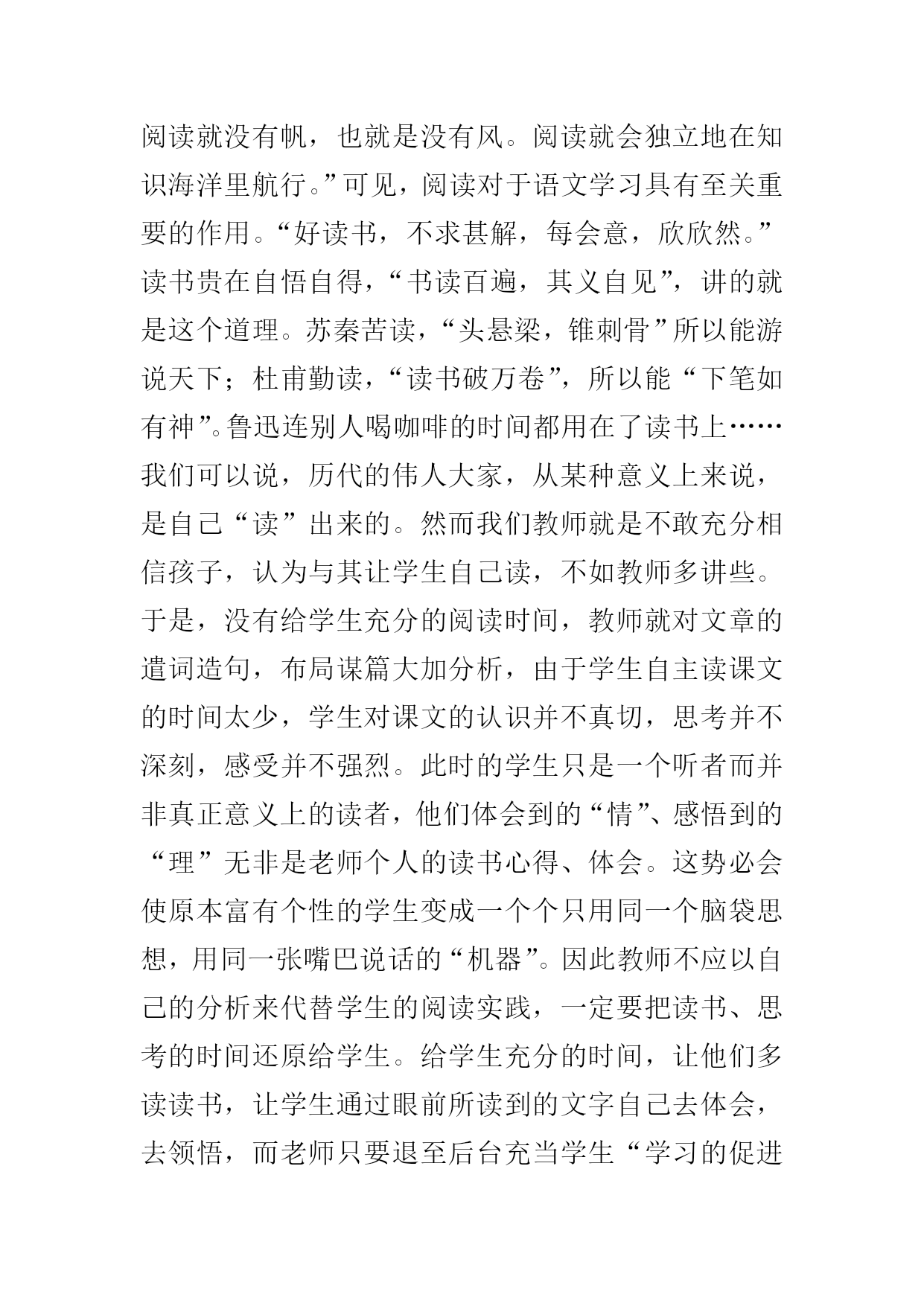 语文教学中阅读的重要性之浅析 [摘要]:阅读教学是语文教学的极其重要的组成部分,而阅读教学现状,则不容乐观。提高学生的阅读能力逐渐成为培养学生掌握和运用祖国语言文字能力的重要途径和手段。加强对学生阅读能力的培养,越来越成为语文界的共识。本文试着从自读感知阶段朗读的“量”,精读领悟阶段教师指导的“度”,和诵读表达阶段学生朗读的“质”,这三个方面谈一些自己浅显的看法。 [关键词]:多读领悟美感生活 语文教学大纲明确指出:阅读教学是语文教学的基本环节。因此阅读教学是语文教学的重要组成部分,它贯穿在语文教学的整个阶段。著名语言学家吕淑湘先生说过:“学习语言不是学一套知识,而是学一种技能。”那么语文阅读教学自然是教给学生技能的,阅读的目的就是培养学生的阅读能力。要达到此目的就必须指导学生多读,多读也是我国优良的文化传统,其重要性在古文语句中充分体现出来,如“读书破万卷,下笔如有神”、“书读百遍,其义自见”。 一、“读”出语感 苏霍姆林斯基说;“阅读用形象的话来说,既是思考的大船,借以航行,也是鼓帆,也是帆前进的风,没有阅读就没有帆,也就是没有风。阅读就会独立地在知识海洋里航行。”可见,阅读对于语文学习具有至关重要的作用。“好读书,不求甚解,每会意,欣欣然。”读书贵在自悟自得,“书读百遍,其义自见”,讲的就是这个道理。苏秦苦读,“头悬梁,锥刺骨”所以能游说天下;杜甫勤读,“读书破万卷”,所以能“下笔如有神”。鲁迅连别人喝咖啡的时间都用在了读书上……我们可以说,历代的伟人大家,从某种意义上来说,是自己“读”出来的。然而我们教师就是不敢充分相信孩子,认为与其让学生自己读,不如教师多讲些。于是,没有给学生充分的阅读时间,教师就对文章的遣词造句,布局谋篇大加分析,由于学生自主读课文的时间太少,学生对课文的认识并不真切,思考并不深刻,感受并不强烈。此时的学生只是一个听者而并非真正意义上的读者,他们体会到的“情”、感悟到的“理”无非是老师个人的读书心得、体会。这势必会使原本富有个性的学生变成一个个只用同一个脑袋思想,用同一张嘴巴说话的“机器”。因此教师不应以自己的分析来代替学生的阅读实践,一定要把读书、思考的时间还原给学生。给学生充分的时间,让他们多读读书,让学生通过眼前所读到的文字自己去体会,去领悟,而老师只要退至后台充当学生“学习的促进者、指导者”。 对于文言文的教学来说,多读,更是有着不可估量的作用。例如文言文教学中的“……者,……也”这样的一个判断句式,要让学生多读几遍,甚至在不同的文章中学到类似的句式,下次学生一读到这样的句子,马上就能判别出这种句式,并深刻理解它。再有《陋室铭》中的“孔子云:‘何陋之有?’”语感比较好的学生很容易就会仿句:“何罪之有?”“何理之有?”等等。这些都是多读、熟读带来的良好收效,所以说,“读”对培养语感很重要。 二、精读中领悟,适时点拨 阅读仅停留在学生的自悟自得上是远远不够的,“阅读教学中,教师要引导学生细心咀嚼课文中的语言,让他们自己动脑筋,经常比较、揣摩,养成习惯。”(叶圣陶语)杨再隋教授对读中感悟也做过精辟的阐述:“课文内容及其所包含的思想是学生通过自读,自悟出来的。自悟,即自己以心去领悟。悟的过程就是通过阅读和思考语言文字的内涵,去咀嚼语言文字的滋味,去体验语言文字的感情。学生的悟,在于教师巧妙、适时地引。”学生的水平毕竟是有限的,教师应该根据学生掌握的情况,有重点,有目的地给予点拨、引导。教师应做到启能发,发而能收、有的放矢、适时点拨。教师的点拨应是在学生充分阅读之后,针对阅读中的共性问题“精”讲,以学生自己的领悟为主。此时学生带着自学的疑问,带着倾听教师讲解的渴望,教师的讲解于学生能起到一种“拨开云雾见青天”的效果,老师要点拨得精彩,点拨得生动,点拨得精当、点拨得明白、点拨得科学、含英咀华、要挥洒教师的个性和才气,观察学生的表情和态度,随机应变,引导他们细细品味好词佳句的绝妙之处,揣摩布局谋篇、立意构思的独到之处,深入探究领悟作者所表达的思想感情。使点拨的内容具有提示性、启发性、示范性,“牵一发而动全身”收到“四两拨千斤”的效果。教师的“点”必须“点”在关键之处,“拨”必须“拨”在疑难之处,无疑而“点”则不如不“点”。 三、领悟中体会美感 九年制义务教育课程标准这样说:“阅读是搜集处理信息、认识世界、发展思维、获得审美体验的重要途径。”由此可见,阅读也是一种审美过程。语文教学中,不但要在字、词、句、篇上下功夫,还应该在教学中贯彻人文的审美教育。所以,让学生大量地阅读文学作品,不但能提高表达能力、写作水平,更重要的是还能培养有高尚审美情操的人。因为阅读就是读者和作者的对话,让青少年广泛地阅读,多读名家名篇,就是让他们跟名家、大家对话,思想上无形中就会受到美的熏陶和感染。 如在教学艾青的《我爱这土地》和