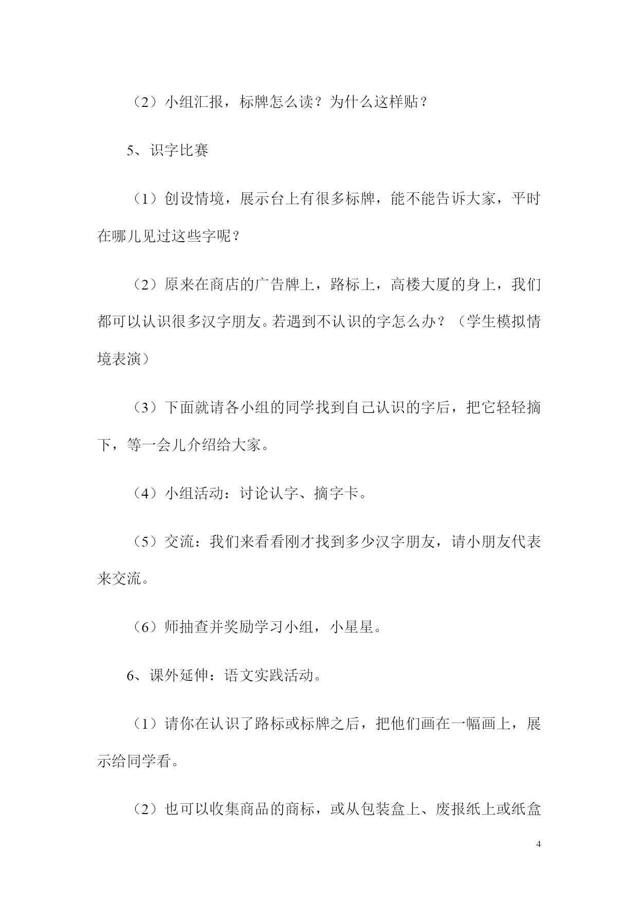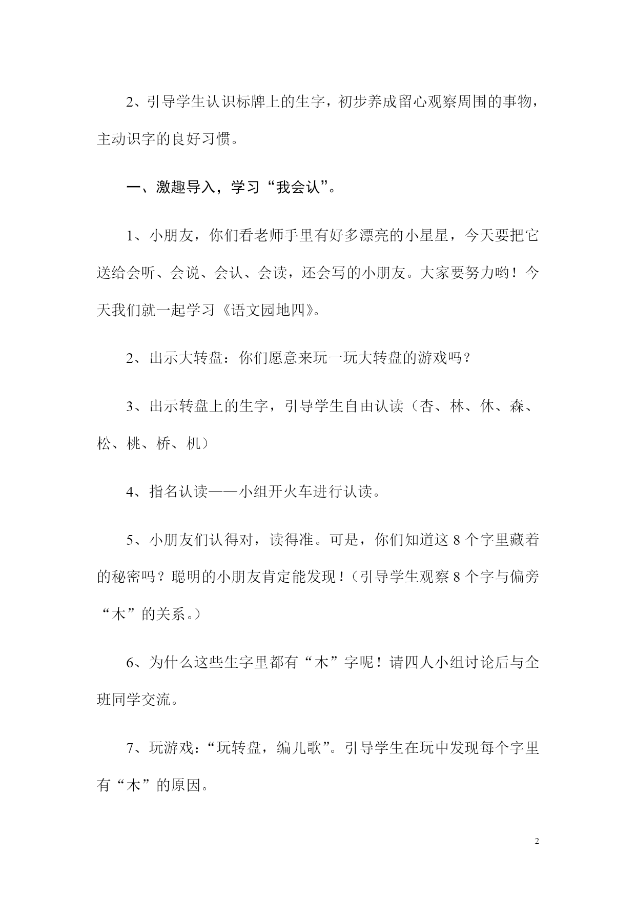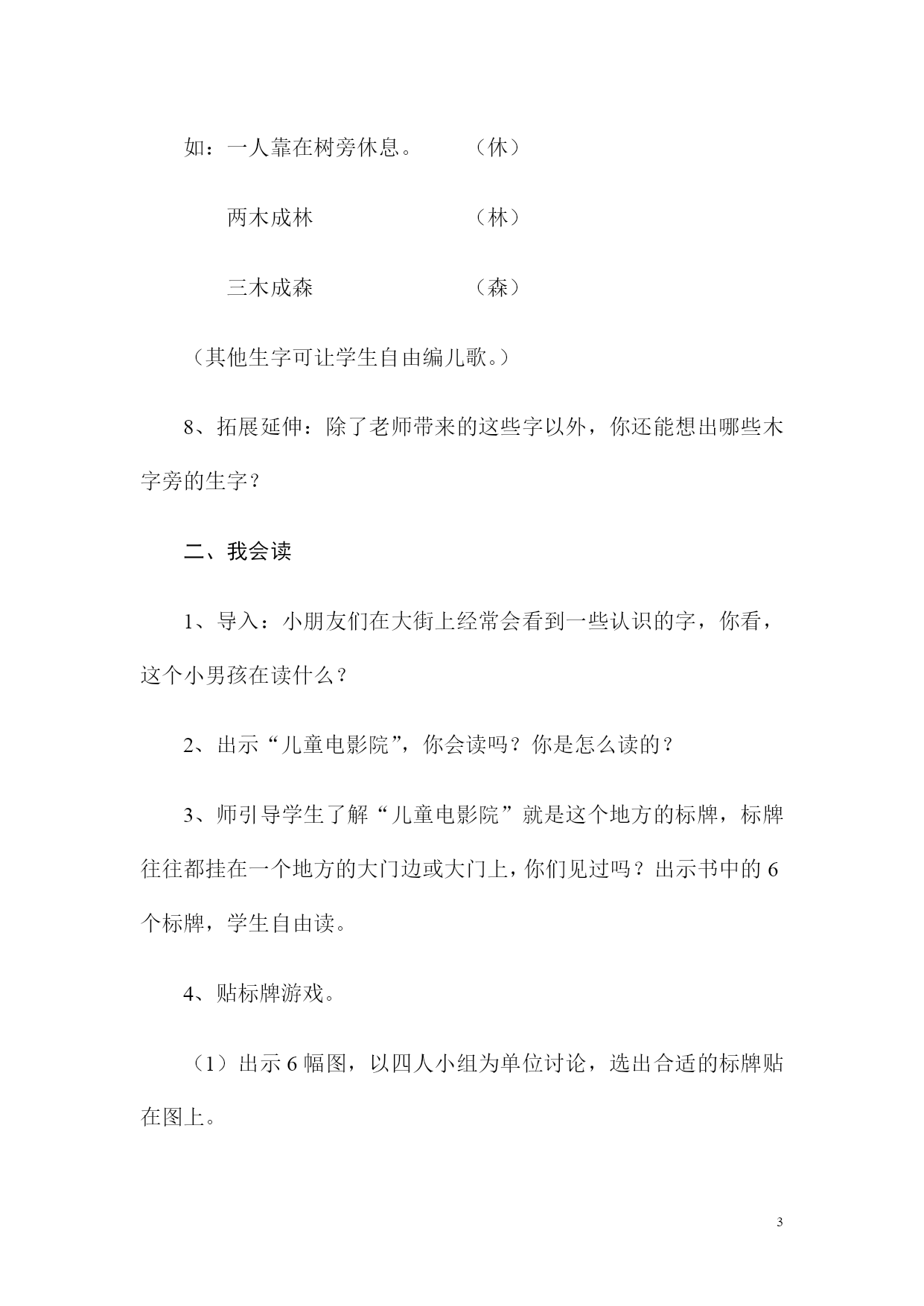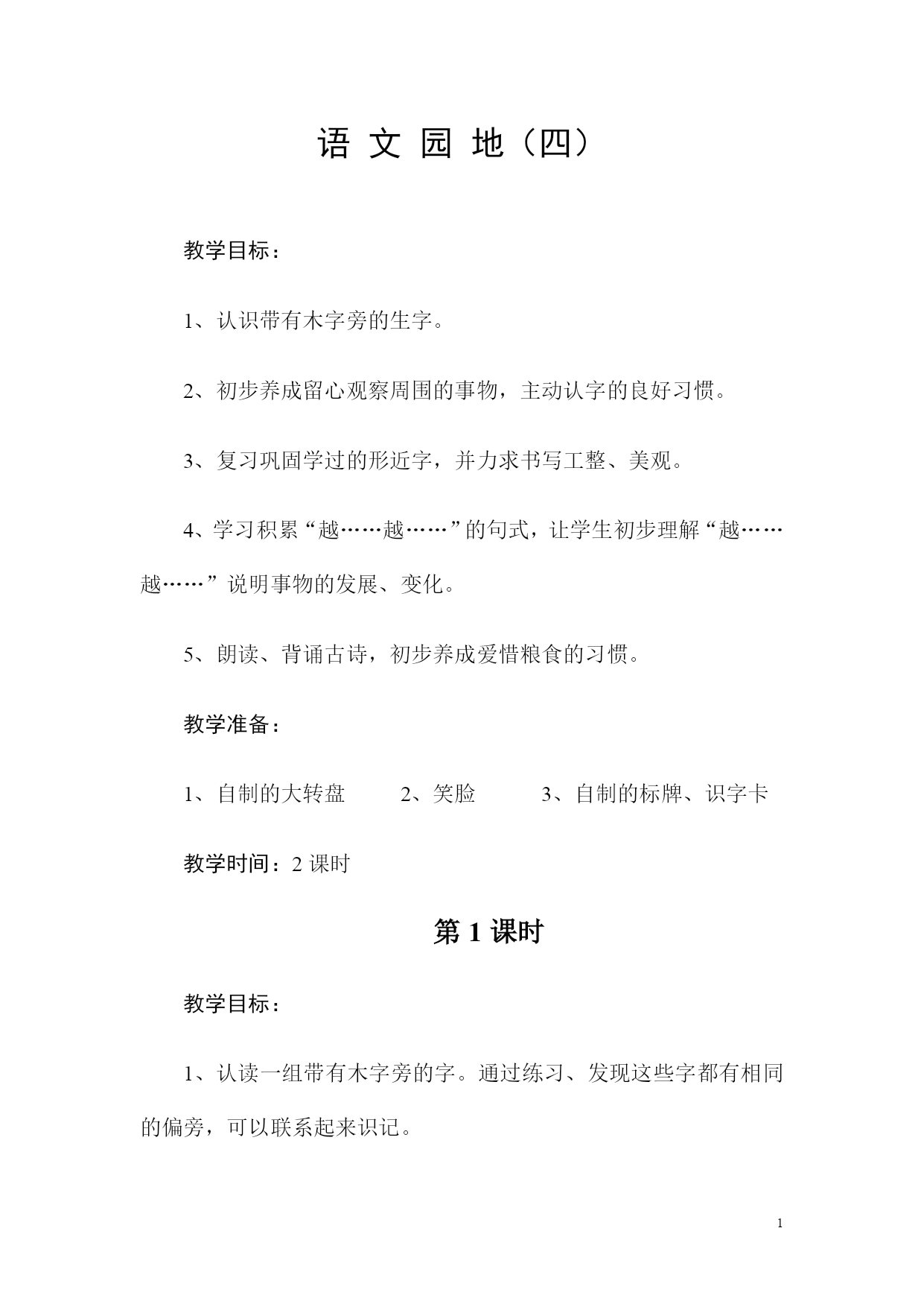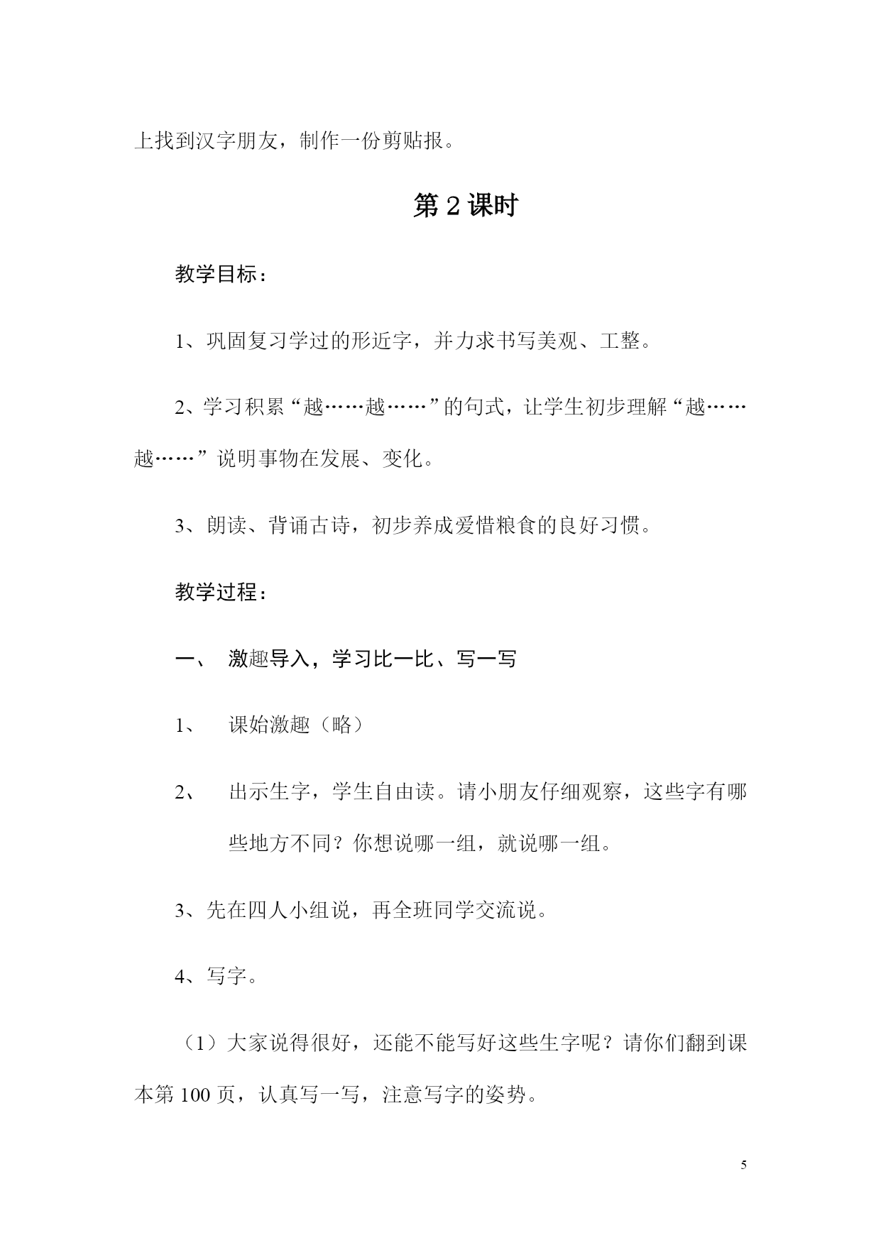 语文园地(四) 教学目标: 1、认识带有木字旁的生字。 2、初步养成留心观察周围的事物,主动认字的良好习惯。 3、复习巩固学过的形近字,并力求书写工整、美观。 4、学习积累“越……越……”的句式,让学生初步理解“越……越……”说明事物的发展、变化。 5、朗读、背诵古诗,初步养成爱惜粮食的习惯。 教学准备: 1、自制的大转盘2、笑脸3、自制的标牌、识字卡 教学时间:2课时 第1课时 教学目标: 1、认读一组带有木字旁的字。通过练习、发现这些字都有相同的偏旁,可以联系起来识记。 2、引导学生认识标牌上的生字,初步养成留心观察周围的事物,主动识字的良好习惯。 一、激趣导入,学习“我会认”。 1、小朋友,你们看老师手里有好多漂亮的小星星,今天要把它送给会听、会说、会认、会读,还会写的小朋友。大家要努力哟!今天我们就一起学习《语文园地四》。 2、出示大转盘:你们愿意来玩一玩大转盘的游戏吗? 3、出示转盘上的生字,引导学生自由认读(杏、林、休、森、松、桃、桥、机) 4、指名认读——小组开火车进行认读。 5、小朋友们认得对,读得准。可是,你们知道这8个字里藏着的秘密吗?聪明的小朋友肯定能发现!(引导学生观察8个字与偏旁“木”的关系。) 6、为什么这些生字里都有“木”字呢!请四人小组讨论后与全班同学交流。 7、玩游戏:“玩转盘,编儿歌”。引导学生在玩中发现每个字里有“木”的原因。 如:一人靠在树旁休息。(休) 两木成林(林) 三木成森(森) (其他生字可让学生自由编儿歌。) 8、拓展延伸:除了老师带来的这些字以外,你还能想出哪些木字旁的生字? 二、我会读 1、导入:小朋友们在大街上经常会看到一些认识的字,你看,这个小男孩在读什么? 2、出示“儿童电影院”,你会读吗?你是怎么读的? 3、师引导学生了解“儿童电影院”就是这个地方的标牌,标牌往往都挂在一个地方的大门边或大门上,你们见过吗?出示书中的6个标牌,学生自由读。 4、贴标牌游戏。 (1)出示6幅图,以四人小组为单位讨论,选出合适的标牌贴在图上。 (2)小组汇报,标牌怎么读?为什么这样贴? 5、识字比赛 (1)创设情境,展示台上有很多标牌,能不能告诉大家,平时在哪儿见过这些字呢? (2)原来在商店的广告牌上,路标上,高楼大厦的身上,我们都可以认识很多汉字朋友。若遇到不认识的字怎么办?(学生模拟情境表演) (3)下面就请各小组的同学找到自己认识的字后,把它轻轻摘下,等一会儿介绍给大家。 (4)小组活动:讨论认字、摘字卡。 (5)交流:我们来看看刚才找到多少汉字朋友,请小朋友代表来交流。 (6)师抽查并奖励学习小组,小星星。 6、课外延伸:语文实践活动。 (1)请你在认识了路标或标牌之后,把他们画在一幅画上,展示给同学看。 (2)也可以收集商品的商标,或从包装盒上、废报纸上或纸盒上找到汉字朋友,制作一份剪贴报。 第2课时 教学目标: 1、巩固复习学过的形近字,并力求书写美观、工整。 2、学习积累“越……越……”的句式,让学生初步理解“越……越……”说明事物在发展、变化。 3、朗读、背诵古诗,初步养成爱惜粮食的良好习惯。 教学过程: 激趣导入,学习比一比、写一写 课始激趣(略) 出示生字,学生自由读。请小朋友仔细观察,这些字有哪些地方不同?你想说哪一组,就说哪一组。 3、先在四人小组说,再全班同学交流说。 4、写字。 (1)大家说得很好,还能不能写好这些生字呢?请你们翻到课本,认真写一写,注意写字的姿势。 (2)请同学们选出自己满意的作业,让全班同学评一评哪些字写得美,美在哪儿?哪些字写得不够工整,问题在什么地方? (3)老师相机指导学生写好生字的关键笔画。 如:手的最后一笔“亅”,毛的最后一笔“乚”都要写在竖中线上。 (4)学生在田字格本上再书写一次进行巩固,力求写得美观、工整。 二、我会读 1、出示三句话:看谁读得最认真,能发现三句话中相同的地方。 (1)学生自由读,同桌互相读。 (2)指名学生读。 2、课件注示:观看动画,理解“越……越……”这种句式是说明事物在发展、变化。 3、扩展:出示电脑动画,引导学生用这种句式说话。 (如:风筝飞上天的画面,小草天高的画现,刮风的画面) 三、读读背背 1、今天,给大家介绍一首古诗《悯农》,会读的小朋友和老师一起读,出示画面,自己范读。 2、大家可以用自己喜欢的方式,把古诗读正确。 3、师抽查学生读,其他学生评议,纠正字音。 4、指导朗读:学生反复朗读,发挥想像,并加上个人的感悟配上动作朗读,体会表达诗意。 5、进一步引导学生进行背诵。 6、让学生展示自己,能不能把自己课外学到的古诗,有感情地背给大家听,比一比,哪位同学背得熟,背得有味道。 7、评选出背古诗的小能手,奖励小星星。 8、课件延伸: 找一找还有哪些古诗或儿歌是写农民伯伯的,读一读、背