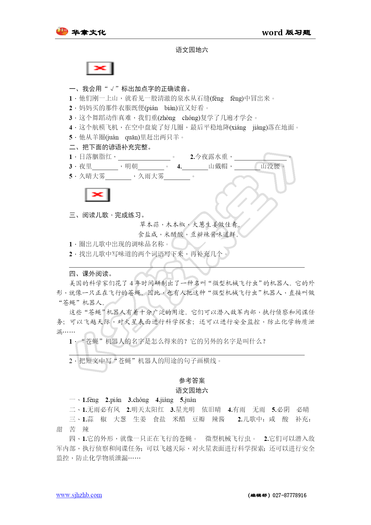 华章文化 word版习题 HYPERLINK"http://www.sjhzhb.com"www.sjhzhb.com (编辑部)027-87778916 语文园地六 一、我会用“√”标出加点字的正确读音。 1.他们刚一上山,就看见一股清澈的泉水从石缝(féngfèng)中冒出来。 2.妈妈买的那件衣服既便(piánbiàn)宜又好看。 3.这个舞蹈动作真难,我们重(zhòngchóng)复学了几遍才学会。 4.这个航模飞机,在空中盘旋了好几圈,最后平稳地降(xiángjiàng)落在地面。 5.他从羊圈(juànquān)里赶出两只羊。 二、把下面的谚语补充完整。 1.日落胭脂红,________________。2.今夜露水重,________________。 3.夜里________,明朝________。4.________山戴帽,________山没腰。 5.久晴大雾________,久雨大雾________。 三、阅读儿歌,完成练习。 草本蒜,木本椒,大葱生姜做佳肴。 食盐咸,米醋酸,豆瓣辣酱味道鲜。 1.圈出儿歌中出现的调味品名称。 2.找出儿歌中写味道的两个词语写下来,再补充几个。 ________________________________________________________________________ 四、课外阅读。 美国的科学家们花了4年时间研制出了一种名叫“微型机械飞行虫”的机器人。它的外形,就像一只正在飞行的苍蝇。因此,也有人把这种“微型机械飞行虫”机器人,直接叫做“苍蝇”机器人。 这些“苍蝇”机器人有着十分广泛的用途。它们可以潜入敌军内部,执行侦察和间谍任务;可以飞越天际,对火星表面进行科学探索;还可以进行安全监控,防止化学物质泄漏…… 1.“苍蝇”机器人的名字是怎么得来的?它的另外的名字是叫什么? ________________________________________________________________________ 把短文中写“苍蝇”机器人的用途的句子画横线。 参考答案 语文园地六 一、1.fèng2.pián3.chóng4.jiàng5.juàn 二、1.无雨必有风2.明天太阳红3.星光明依旧晴4.有雨无雨5.必阴必晴 三、1.蒜椒大葱生姜食盐米醋豆瓣辣酱2.儿歌中:咸酸补充:甜苦辣 四、1.它的外形,就像一只正在飞行的苍蝇。微型机械飞行虫。2.它们可以潜入敌军内部,执行侦察和间谍任务;可以飞越天际,对火星表面进行科学探索;还可以进行安全监控,防止化学物质泄漏……