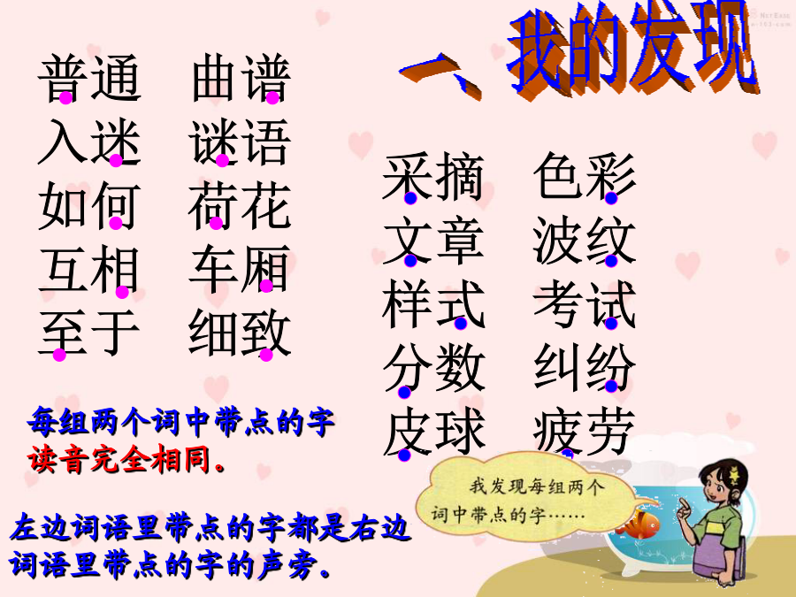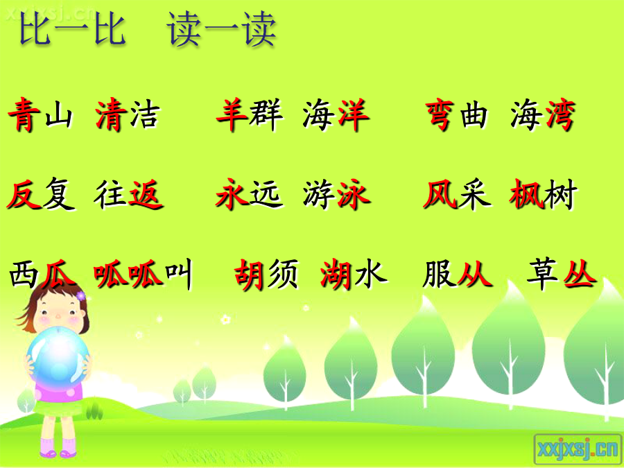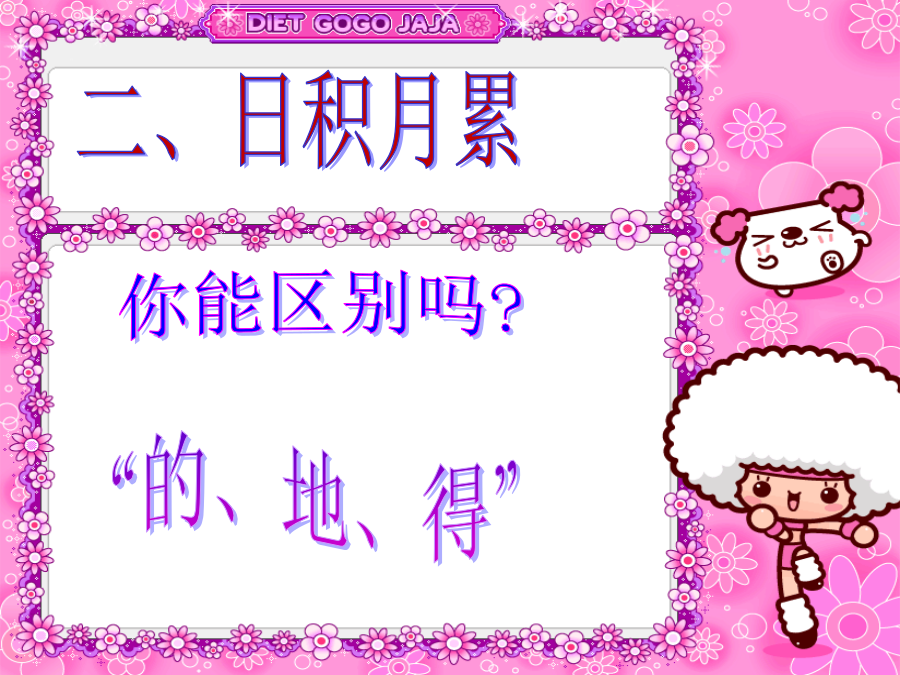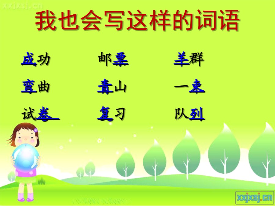 语文园地四普通曲谱 入迷谜语 如何荷花 互相车厢 至于细致青山清洁羊群海洋弯曲海湾 反复往返永远游泳风采枫树 西瓜呱呱叫胡须湖水服从草丛我也会写这样的词语二、日积月累“的地得”不一样,区别用法记心上。“土也地”真神气,喜欢动词前边立。 认真地写字不大意,专心地听讲要重视。 用心地思考解难题,勤奋地学习要积极。 轻轻地走路不顽皮,辛勤地劳动花力气,“双人得”不一般,形容词前常出现。 清晨太阳起得早,小鸟小鸟飞得高。 练得认真写得好,读得用心记得牢。 参天大树长得慢,玩得开心笑得欢。 的地得,不一样,用法分别记心上, 左边白,右边勺,名词跟在后面跑。 美丽的花儿绽笑脸,青青的草儿弯下腰, 清清的河水向东流,蓝蓝的天上白云飘, 暖暖的风儿轻轻吹,绿绿的树叶把头摇, 小小的鱼儿水中游,红红的太阳当空照, 左边土,右边也,地字站在动词前, 认真地做操不马虎,专心地上课不大意, 大声地朗读不害羞,从容地走路不着急, 痛快地玩耍来放松,用心地思考解难题, 勤奋地学习要积极,辛勤地劳动花力气, 左边两人就使得,形容词前要用得, 兔子兔子跑得快,乌龟乌龟爬得慢, 青青竹子长得快,参天大树长得慢, 清晨锻炼起得早,加班加点睡得晚, 欢乐时光过得快,考试题目出得难。补充两点: 1.如果“de”的后面是“很、真、太”等这些词,十有八九用“得”。 2.有一种情况,如“他高兴得一蹦三尺高”这句话里,后面的“一蹦三尺高”虽然是表示动作的,但是它是来形容“高兴”的程度的,所以也应该用“得”。 高兴()歌唱 轻轻()走过 聚精会神()听 亲爱()妈妈 飞()很快光彩夺目的()() 清澈见底的()() 弯弯曲曲地()() 和颜悦色地()() 鲜花开得()() 时间过得()()的地得,不一样,用法分别记心上, 左边白,右边勺,名词跟在后面跑。 左边土,右边也,地字站在动词前, 左边两人就使得,形容词前要用得,zī 博览群书孜孜不倦勤学好问学而不厌 xiè 坚持不懈业精于勤专心致志聚精会神 fèiqǐnjiéqiè 废寝忘食竭尽全力锲而不舍脚踏实地我明白这些词语的意思我还会用这些词语呢!三、趣味语文看图说成语材举三长两短做发看图说成语开门见山: 大材小用: 一举两得: 三长两短: 小题大做: 百发百中:看图猜成语看图猜成语看图猜成语看图猜成语看图猜成语看图猜成语看图猜成语看图猜成语看图猜成语看图猜成语看图猜成语心中有数看图说成语说说自己知道的带数字的或带“大”“小”的成语。口语交际: 教你学一招口语交际口语交际口语交际口语交际习作习作目标:回顾自己的成长经历,思考下面的问题:“来试试吧!”爸爸把球拍递给我。 看来颠球很容易啊!我满怀信心地照着 爸爸的样子颠起球来。不知怎么搞的, 羽毛球却不听话,球拍老颠不到球,连 续几次都失败了。我的心情一下子由欣 喜若狂变得大失所望。“唉!算了吧,太 难了!”我垂头丧气地把球拍扔到了地上。 羽毛球在地上弹了几下,仿佛在嘲笑我: 真笨!这么快就认输了?技法二、叙事条理要清楚写作过程中,哪些地方可以作为重点描写呢?滑雪、炒菜、做水果拼盘、弹钢琴、骑自行车、画画、煮面条、剪纸、做手工、滑滑板、跳大绳、打乒乓球、做家务活、包饺子学蒸米饭1.蒸米饭看起来容易,做起来可不简单呀,先要________,然后______,接着______,毛手毛脚的我淘米时可出了点小意外呢!那就是______。 2.我从蒸米饭中的到得启示是__________________________。 开始写作吧:踢毽子习作跳长绳习作习作习作习作习作习作习作(1)不仅要说出自己的本领是什么,还要说出一定的情境。友情提示:学种水仙 朋友送来几个饱满的水仙头。我兴致勃勃地讨教了种植方法。 在朋友的指挥下我先把外面枯黄的皮剥掉,水仙立刻变了模样──白白的、嫩嫩的,接着朋友让我一手托着水仙头,一手捏着小刀跟她学雕刻水仙头。水仙头的嫩皮一层层削掉后露出一个豆芽般大小的淡黄的小花苞。我小心翼翼地将水仙头捧在手里仔细端详,过了一会儿,小花苞悄悄地探出头,“想不到不大的‘水仙肚’竟能孕育出这么多可爱的小花苞”。我情不自禁地自言自语。朋友端来一盆,笑着说:“来吧,让它在这里好好睡上一觉,明天就可以栽种啦!”真不知种水仙还有这么多的讲究。 第二天,我按照朋友临走前说的话做:先把它从清水里捞出来洗干净,然后折了根牙签插在水仙根部两侧,当做“支脚”。啊!一个花盆、一汪清水、一捧细沙,水仙就种植好了。望着自己的劳动成果,我久久地不忍离去…… 就这样,我静静地等待着水仙花开放的日子。友情提示: 动作、语言、感受、好词、佳句。我学会了按摩 我和妈妈在浴池洗澡的时候,曾多次看见几个阿姨给顾客作按摩。我心想:如果我学会了这一招,就能给家人做了。 我认认真真地