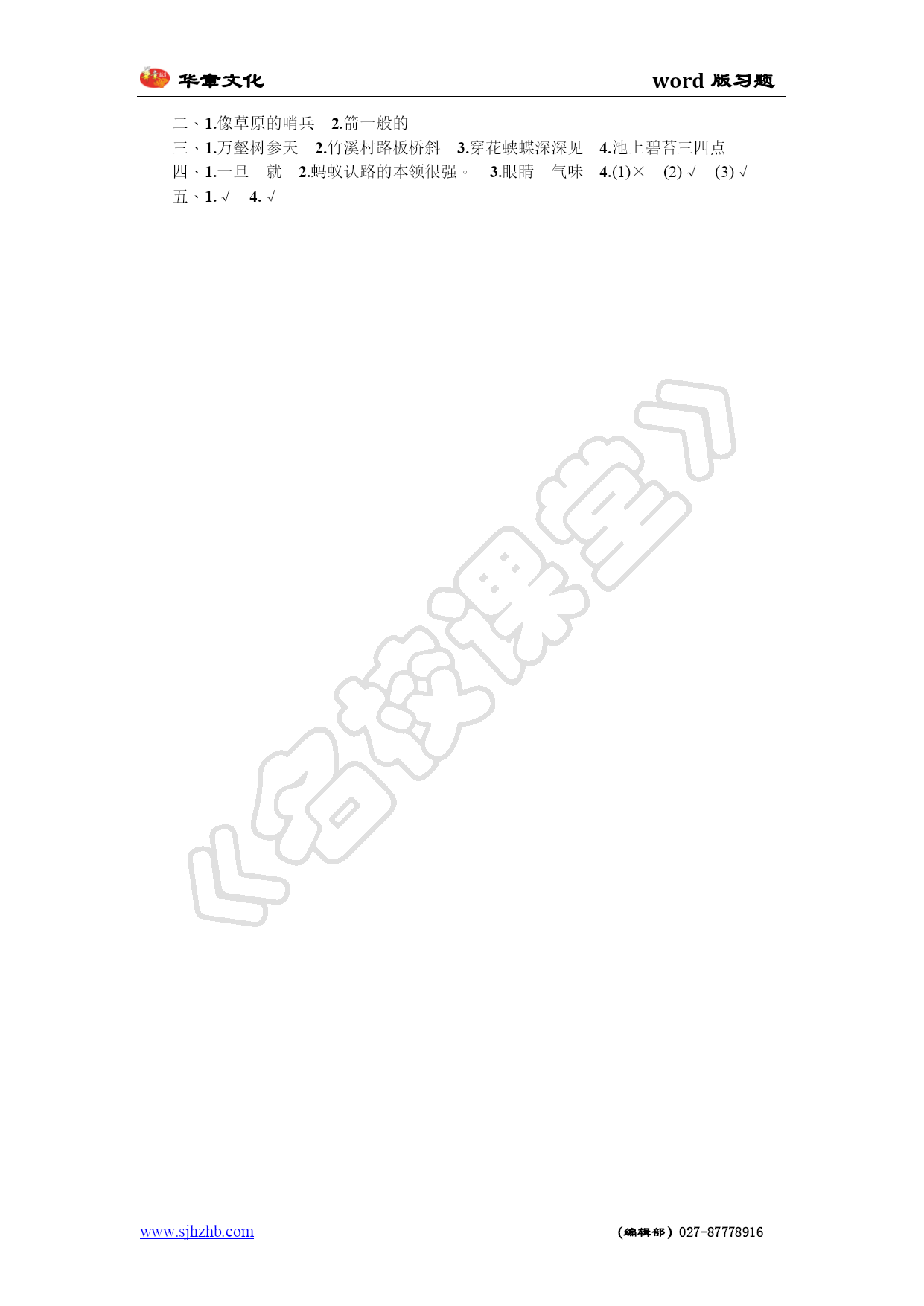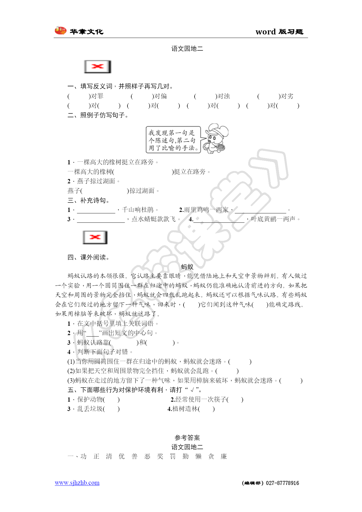 华章文化 word版习题 HYPERLINK"http://www.sjhzhb.com"www.sjhzhb.com (编辑部)027-87778916 语文园地二 一、填写反义词,并照样子再写几对。 ()对罪()对偏()对浊()对劣 ()对()()对()()对()()对() 二、照例子仿写句子。 1.一棵高大的橡树挺立在路旁。 一棵高大的橡树()挺立在路旁。 2.燕子掠过湖面。 燕子()掠过湖面。 三、补充诗句。 1.____________,千山响杜鹃。2.雨里鸡鸣一两家,________________。 3._______________,点水蜻蜓款款飞。4.________________,叶底黄鹂一两声。 四、课外阅读。 蚂蚁 蚂蚁认路的本领很强。它认路主要靠眼睛,能凭借陆地上和天空中景物辨别。有人做过一个实验,用一个圆筒围住一群在归途中的蚂蚁,蚂蚁仍能准确地认清前进的方向。如果把天空和周围的景物完全挡住,蚂蚁就会四散乱跑起来。蚂蚁还可以根据气味认路。有些蚂蚁会在它们爬过的地方留下一种气味,回来时,()它们闻到这种气味()能确定路线。如果用樟脑等来破坏,蚂蚁就迷路了。 1.在文中括号里填上关联词语。 2.用“____”画出短文的中心句。 3.蚂蚁认路靠()和()。 4.判断下面句子对错。 (1)当你用圆筒围住一群在归途中的蚂蚁,蚂蚁就会迷路。() (2)如果把天空和周围景物完全挡住,蚂蚁就会乱跑。() (3)蚂蚁在走过的地方留下了一种气味,如果用樟脑来破坏,蚂蚁就会迷路。() 五、下面哪些行为对保护环境有利,请打“√”。 1.保护动物()2.经常使用一次筷子() 3.乱丢垃圾()4.植树造林() 参考答案 语文园地二 一、功正清优善恶奖罚勤懒贪廉 二、1.像草原的哨兵2.箭一般的 三、1.万壑树参天2.竹溪村路板桥斜3.穿花蛱蝶深深见4.池上碧苔三四点 四、1.一旦就2.蚂蚁认路的本领很强。3.眼睛气味4.(1)×(2)√(3)√ 五、1.√4.√