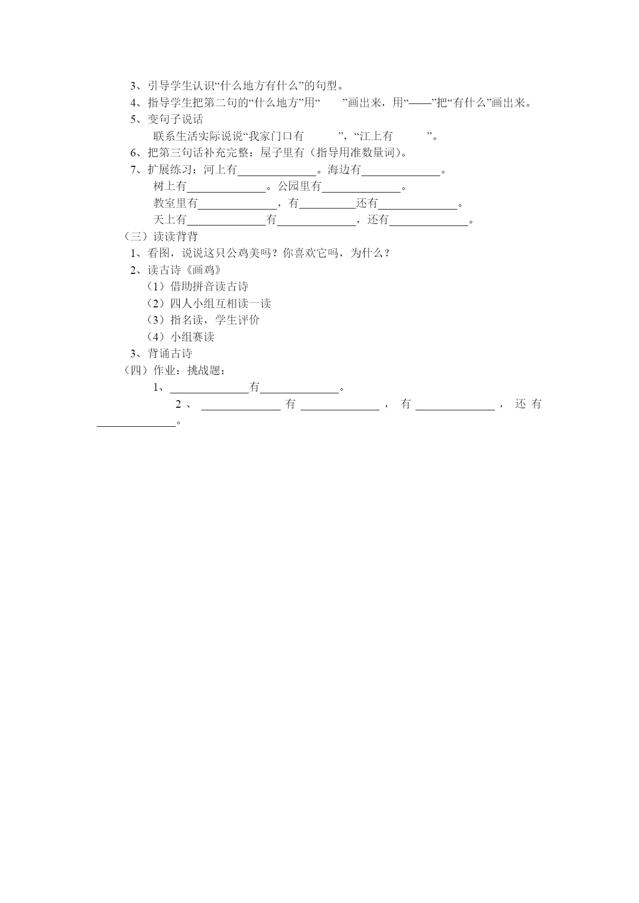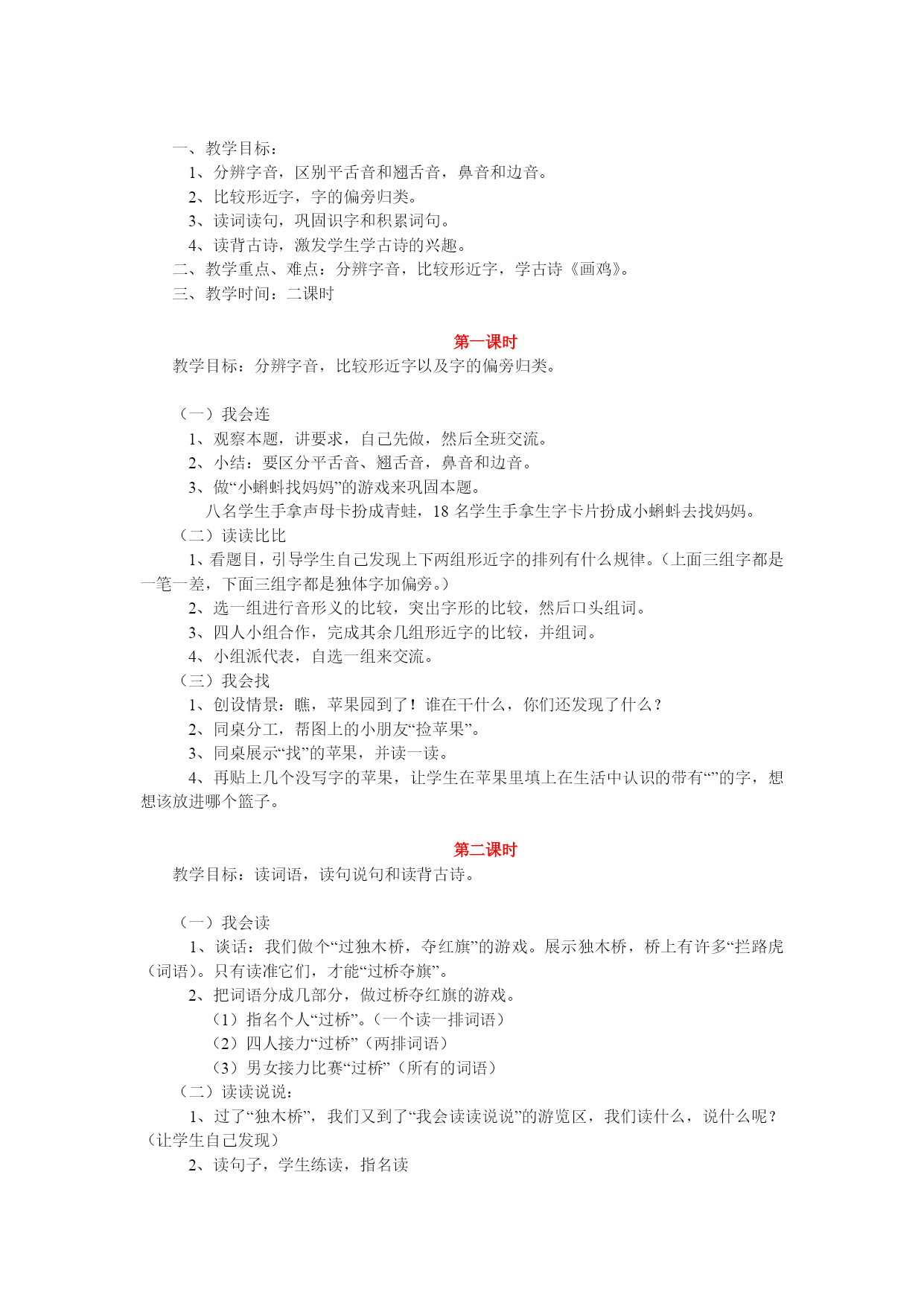 一、教学目标:1、分辨字音,区别平舌音和翘舌音,鼻音和边音。2、比较形近字,字的偏旁归类。3、读词读句,巩固识字和积累词句。4、读背古诗,激发学生学古诗的兴趣。二、教学重点、难点:分辨字音,比较形近字,学古诗《画鸡》。三、教学时间:二课时第一课时教学目标:分辨字音,比较形近字以及字的偏旁归类。(一)我会连1、观察本题,讲要求,自己先做,然后全班交流。2、小结:要区分平舌音、翘舌音,鼻音和边音。3、做“小蝌蚪找妈妈”的游戏来巩固本题。八名学生手拿声母卡扮成青蛙,18名学生手拿生字卡片扮成小蝌蚪去找妈妈。(二)读读比比1、看题目,引导学生自己发现上下两组形近字的排列有什么规律。(上面三组字都是一笔一差,下面三组字都是独体字加偏旁。)2、选一组进行音形义的比较,突出字形的比较,然后口头组词。3、四人小组合作,完成其余几组形近字的比较,并组词。4、小组派代表,自选一组来交流。(三)我会找1、创设情景:瞧,苹果园到了!谁在干什么,你们还发现了什么?2、同桌分工,帮图上的小朋友“捡苹果”。3、同桌展示“找”的苹果,并读一读。4、再贴上几个没写字的苹果,让学生在苹果里填上在生活中认识的带有“”的字,想想该放进哪个篮子。第二课时教学目标:读词语,读句说句和读背古诗。(一)我会读1、谈话:我们做个“过独木桥,夺红旗”的游戏。展示独木桥,桥上有许多“拦路虎(词语)。只有读准它们,才能“过桥夺旗”。2、把词语分成几部分,做过桥夺红旗的游戏。(1)指名个人“过桥”。(一个读一排词语)(2)四人接力“过桥”(两排词语)(3)男女接力比赛“过桥”(所有的词语)(二)读读说说:1、过了“独木桥”,我们又到了“我会读读说说”的游览区,我们读什么,说什么呢?(让学生自己发现)2、读句子,学生练读,指名读3、引导学生认识“什么地方有什么”的句型。4、指导学生把第二句的“什么地方”用“”画出来,用“——”把“有什么”画出来。5、变句子说话联系生活实际说说“我家门口有”,“江上有”。6、把第三句话补充完整:屋子里有(指导用准数量词)。7、扩展练习:河上有______________。海边有______________。树上有______________。公园里有______________。教室里有______________,有还有______________。天上有有______________,还有______________。(三)读读背背1、看图,说说这只公鸡美吗?你喜欢它吗,为什么?2、读古诗《画鸡》(1)借助拼音读古诗(2)四人小组互相读一读(3)指名读,学生评价(4)小组赛读3、背诵古诗(四)作业:挑战题:1、______________有______________。2、______________有______________,有______________,还有______________。