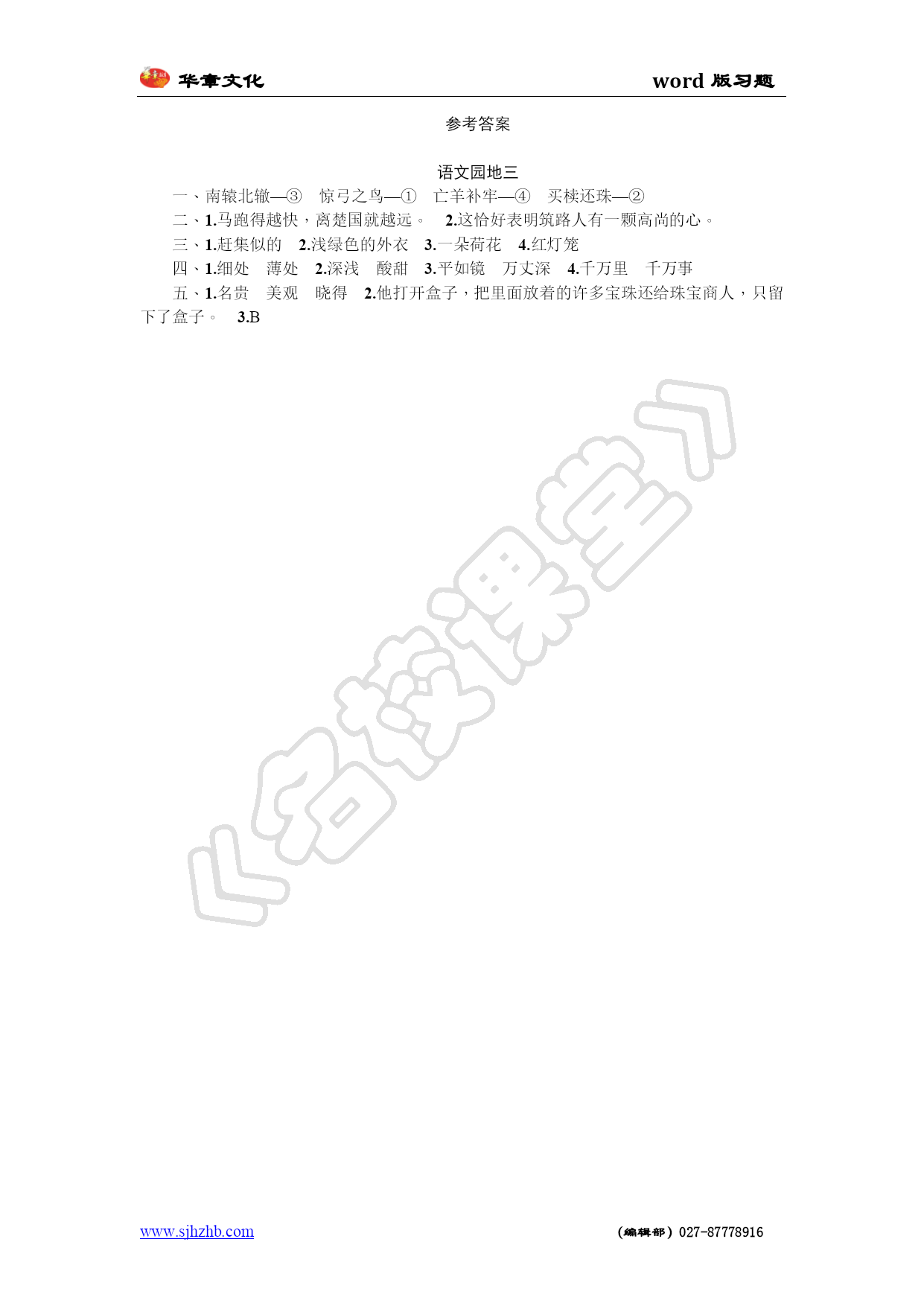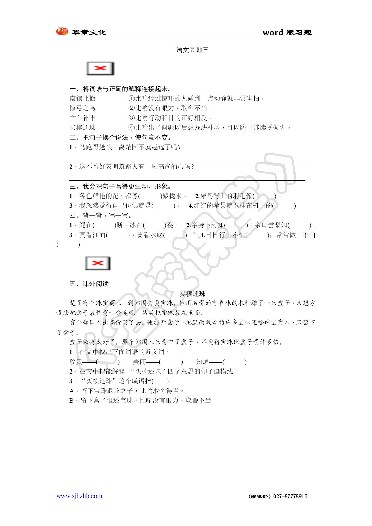 华章文化 word版习题 HYPERLINK"http://www.sjhzhb.com"www.sjhzhb.com (编辑部)027-87778916 语文园地三 一、将词语与正确的解释连接起来。 南辕北辙①比喻经过惊吓的人碰到一点动静就非常害怕。 惊弓之鸟②比喻没有眼力,取舍不当。 亡羊补牢③比喻行动和目的正好相反。 买椟还珠④比喻出了问题以后想办法补救,可以防止继续受损失。 二、把句子换个说法,使句意不变。 1.马跑得越快,离楚国不就越远了吗? ________________________________________________________________________ 2.这不恰好表明筑路人有一颗高尚的心吗? ________________________________________________________________________ 三、我会把句子写得更生动、形象。 1.各色鲜艳的花,都像()聚拢来。2.翠鸟背上的羽毛像()。 3.我忽然觉得自己仿佛就是()。4.红红的苹果就像挂在树上的() 四、背一背,写一写。 1.绳在()断,冰在()裂。2.亲身下河知(),亲口尝梨知()。 3.莫看江面(),要看水底()。4.日日行,不怕();常常做,不怕()。 五、课外阅读。 买椟还珠 楚国有个珠宝商人,到郑国去卖宝珠。他用名贵的有香味的木料雕了一只盒子,又想方设法把盒子装饰得十分美观,然后把宝珠装在里面。 有个郑国人出高价买了去。他打开盒子,把里面放着的许多宝珠还给珠宝商人,只留下了盒子。 盒子做得太好了。那个郑国人只看中了盒子,不晓得宝珠比盒子贵许多倍。 1.在文中找出下面词语的近义词。 珍贵——()美丽——()知道——() 2.在文中把能解释“买椟还珠”四字意思的句子画横线。 3.“买椟还珠”这个成语指() A.留下宝珠退还盒子,比喻取舍得当。 B.留下盒子退还宝珠,比喻没有眼力,取舍不当 参考答案 语文园地三 一、南辕北辙—③惊弓之鸟—①亡羊补牢—④买椟还珠—② 二、1.马跑得越快,离楚国就越远。2.这恰好表明筑路人有一颗高尚的心。 三、1.赶集似的2.浅绿色的外衣3.一朵荷花4.红灯笼 四、1.细处薄处2.深浅酸甜3.平如镜万丈深4.千万里千万事 五、1.名贵美观晓得2.他打开盒子,把里面放着的许多宝珠还给珠宝商人,只留下了盒子。3.B