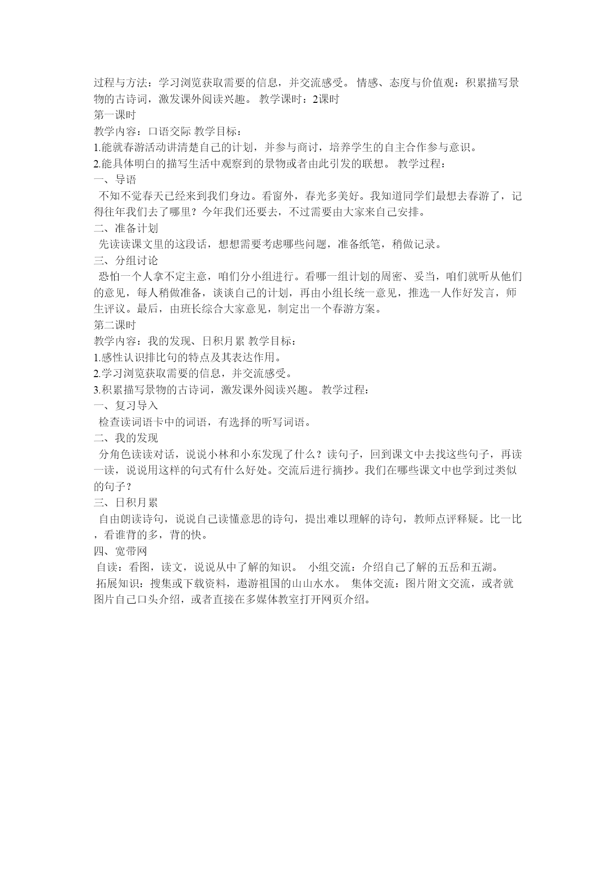 过程与方法:学习浏览获取需要的信息,并交流感受。情感、态度与价值观:积累描写景物的古诗词,激发课外阅读兴趣。教学课时:2课时 第一课时 教学内容:口语交际教学目标: 1.能就春游活动讲清楚自己的计划,并参与商讨,培养学生的自主合作参与意识。 2.能具体明白的描写生活中观察到的景物或者由此引发的联想。教学过程: 一、导语 不知不觉春天已经来到我们身边。看窗外,春光多美好。我知道同学们最想去春游了,记得往年我们去了哪里?今年我们还要去,不过需要由大家来自己安排。 二、准备计划 先读读课文里的这段话,想想需要考虑哪些问题,准备纸笔,稍做记录。 三、分组讨论 恐怕一个人拿不定主意,咱们分小组进行。看哪一组计划的周密、妥当,咱们就听从他们的意见,每人稍做准备,谈谈自己的计划,再由小组长统一意见,推选一人作好发言,师生评议。最后,由班长综合大家意见,制定出一个春游方案。 第二课时 教学内容:我的发现、日积月累教学目标: 1.感性认识排比句的特点及其表达作用。 2.学习浏览获取需要的信息,并交流感受。 3.积累描写景物的古诗词,激发课外阅读兴趣。教学过程: 一、复习导入 检查读词语卡中的词语,有选择的听写词语。 二、我的发现 分角色读读对话,说说小林和小东发现了什么?读句子,回到课文中去找这些句子,再读一读,说说用这样的句式有什么好处。交流后进行摘抄。我们在哪些课文中也学到过类似的句子? 三、日积月累 自由朗读诗句,说说自己读懂意思的诗句,提出难以理解的诗句,教师点评释疑。比一比,看谁背的多,背的快。 四、宽带网 自读:看图,读文,说说从中了解的知识。小组交流:介绍自己了解的五岳和五湖。 拓展知识:搜集或下载资料,遨游祖国的山山水水。集体交流:图片附文交流,或者就图片自己口头介绍,或者直接在多媒体教室打开网页介绍。