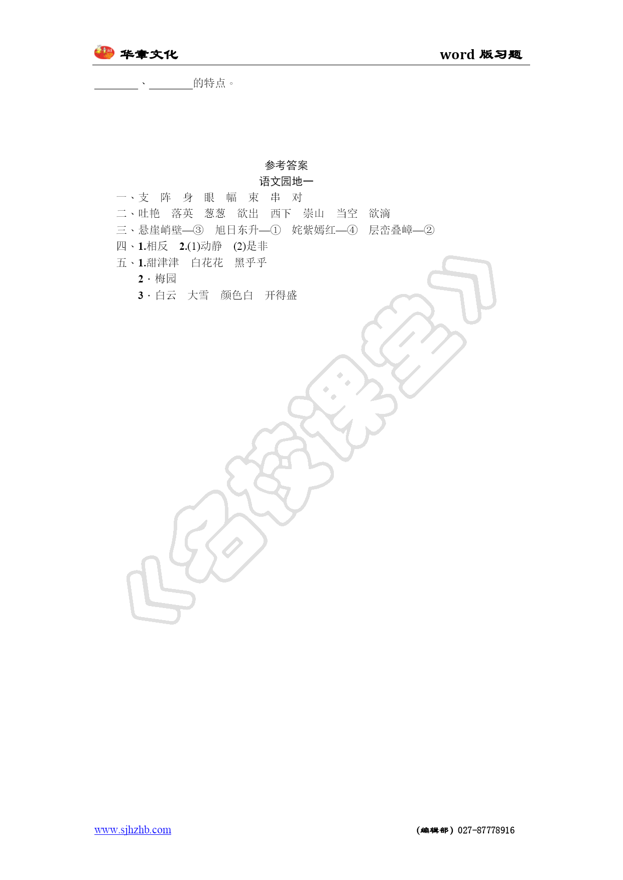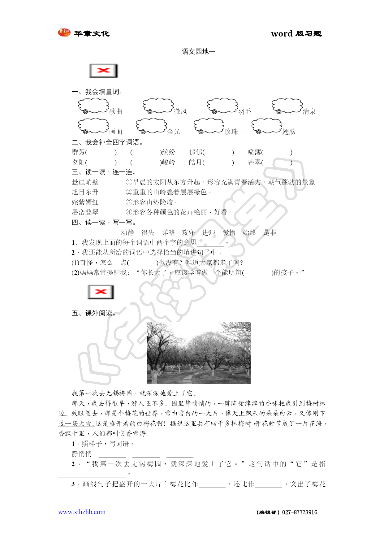 华章文化 word版习题 HYPERLINK"http://www.sjhzhb.com"www.sjhzhb.com (编辑部)027-87778916 语文园地一 一、我会填量词。 一歌曲一微风一羽毛一清泉 一画面一金光一珍珠一翅膀 二、我会补全四字词语。 群芳()()缤纷郁郁()喷薄() 夕阳()()峻岭皓月()苍翠() 三、读一读,连一连。 悬崖峭壁①早晨的太阳从东方升起,形容充满青春活力,朝气蓬勃的景象。 旭日东升②重重的山岭叠着层层绿色。 姹紫嫣红③形容山势险峻。 层峦叠翠④形容各种颜色的花卉艳丽、好看。 四、读一读,写一写。 动静得失详略攻守进退爱憎始终是非 1.我发现上面的每个词语中两个字的意思________。 2.我还能从所给的词语中选择恰当的填进句子中。 (1)奇怪,怎么一点()也没有?难道大家都走了吗? (2)妈妈常常提醒我:“你长大了,应该学着做一个能明辨()的孩子。” 五、课外阅读。 我第一次去无锡梅园,就深深地爱上了它。 那天,我去得很早,游人还不多。园里静悄悄的,一阵阵甜津津的香味把我引到梅树林边。放眼望去,那是个梅花的世界,雪白雪白的一大片,像天上飘来的朵朵白云,又像刚下过一场大雪。这是盛开着的白梅花啊!据说这里共有四千多株梅树,开花时节成了一片花海,香飘十里,人们都叫它香雪海。 1.照样子,写词语。 静悄悄________________________ 2.“我第一次去无锡梅园,就深深地爱上了它。”这句话中的“它”是指____________________。 3.画线句子把盛开的一大片白梅花比作________,还比作________,突出了梅花________、________的特点。 参考答案 语文园地一 一、支阵身眼幅束串对 二、吐艳落英葱葱欲出西下崇山当空欲滴 三、悬崖峭壁—③旭日东升—①姹紫嫣红—④层峦叠嶂—② 四、1.相反2.(1)动静(2)是非 五、1.甜津津白花花黑乎乎 2.梅园 3.白云大雪颜色白开得盛