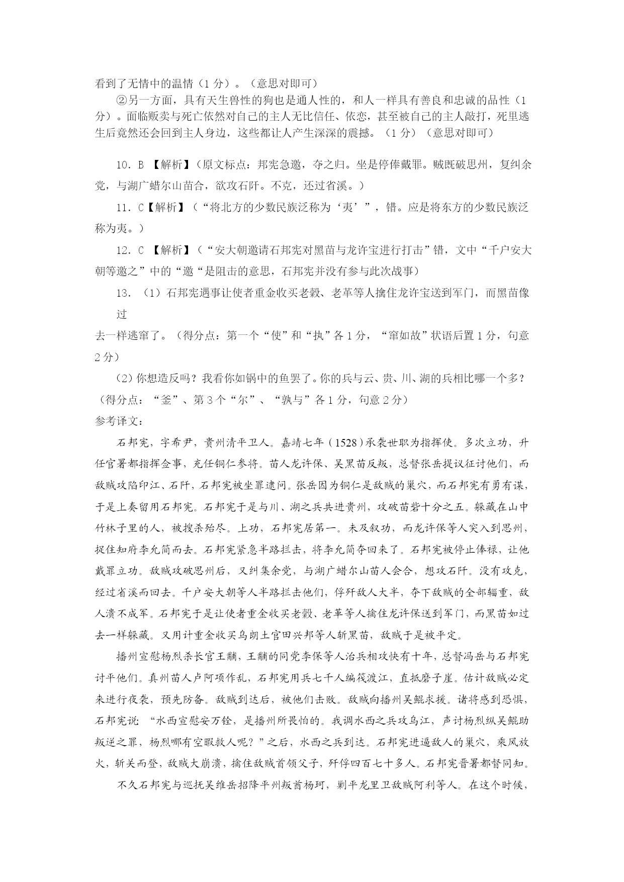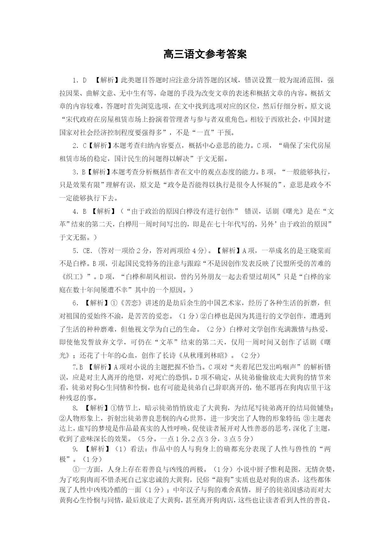 高三语文参考答案 1.D【解析】此类题目答题时应注意分清答题的区域,错误设置一般为混淆范围,强拉因果、曲解文意、无中生有等,命题的手段为改变文章的表述和概括文章的内容。概括文章的内容较难,答题时首先浏览选项,在文中找到选项对应的区位,然后仔细分析。原文说“宋代政府在房屋租赁市场上扮演着管理者与参与者双重角色。相较于西欧社会,中国封建国家对社会经济控制程度要强得多”,不是“一直”干预。 2.C【解析】本题考查归纳内容要点,概括中心意思的能力。C项,“确保了宋代房屋租赁市场的稳定,国计民生的问题得以解决”于文无据。 3.B【解析】本题考查分析概括作者在文中的观点态度的能力。B项,“一般能够执行,只是效果有限”理解有误,原文是“政令是否能得以执行是很令人怀疑的”,意思是政令不一定能够执行下去。 4.B【解析】(“由于政治的原因白桦没有进行创作”错误,话剧《曙光》是在“文革”结束的第二天,白桦用一周时间写出的,即是在七十年代写的,另外’由于政治的原因”于文无据。) 5.CE.(答对一项给2分,答对两项给4分)。【解析】A项,一举成名的是王晓棠而不是白桦。B项,引起国民党特务的注意与跟踪“不是因创作发表反映了民盟所受的苦难的《织工》”。D项,“白桦和胡风相识,曾约另外朋友一起去看望过胡风”只是“白桦的家庭在数十年间屡遭不幸”其中的一个原因。) 6.【解析】①《苦恋》讲述的是劫后余生的中国艺术家,经历了各种生活的折磨,但对祖国的爱始终不渝,是苦苦的爱恋。(1分)②白桦也是因为其进行的文学创作,遭遇到了生活的种种磨难,但他视文学为自己的生命。(2分)白桦对文学创作充满激情与热爱,即使他发誓放弃文学,可仍在“文革”结束的第二天,仅用一周时间又创作了话剧《曙光》;还花了十年的心血,创作了长诗《从秋瑾到林昭》。(2分) 7.B【解析】A项对小说的主题把握不恰当。C项对“夹着尾巴发出呜咽声”的解析错误,应是对主人离开的绝望,对死亡的恐惧。D项不确定,从徒弟偷偷放走大黄狗的情节来看,徒弟对狗心生同情和怜悯,也有可能是徒弟自己辞职离开的,他不愿再在狗肉店里干这种残忍的事。8.【解析】①情节上,暗示徒弟悄悄放走了大黄狗,为结尾写徒弟离开的结局做铺垫;②人物形象上,折射出徒弟善良悲悯的内心世界,进一步突出了人物的形象特征;③主题表达上,虚写的梦境是作品最真实的人性呼唤,促使读者展开对人性善恶的思考,深化了主题,收到了意味深长的效果。(5分。一点1分.2点3分,3点5分)9.【解析】(1)看法:作品中的人与狗身上的确都充分表现了人性与兽性的“两极”。(1分)①一方面,人身上存在着善良与凶残的两极。(1分)小说中厨子惟利是图,无情贪婪,为了吃狗肉而不惜杀死自己家忠诚的大黄狗,民俗“敲狗”实质也是对狗的虐杀,这些都体现了人性中凶残冷酷的一面(1分);中年汉子与狗的难舍真情,厨子的徒弟因感动而对大黄狗心生怜悯与同情,最后放走了大黄狗,甚至离开狗肉店,这些也让读者看到人性的善良,看到了无情中的温情(1分)。(意思对即可)②另一方面,具有天生兽性的狗也是通人性的,和人一样具有善良和忠诚的品性(1分)。面临贩卖与死亡依然对自己的主人无比信任、依恋,甚至被自己的主人敲打,死里逃生后竟然还会回到主人身边,这些都让人产生深深的震撼。(1分)(意思对即可) 10.B【解析】(原文标点:邦宪急邀,夺之归。坐是停俸戴罪。贼既破思州,复纠余 党,与湖广蜡尔山苗合,欲攻石阡。不克,还过省溪。) 11.C【解析】(“将北方的少数民族泛称为‘夷’”,错。应是将东方的少数民族泛 称为夷。) 12.C【解析】(“安大朝邀请石邦宪对黑苗与龙许宝进行打击”错,文中“千户安大 朝等邀之”中的“邀“是阻击的意思,石邦宪并没有参与此次战事) 13.(1)石邦宪遇事让使者重金收买老穀、老革等人擒住龙许宝送到军门,而黑苗像过 去一样逃窜了。(得分点:第一个“使”和“执”各1分,“窜如故”状语后置1分,句意2分) (2)你想造反吗?我看你如锅中的鱼罢了。你的兵与云、贵、川、湖的兵相比哪一个多? (得分点:“釜”、第3个“尔”、“孰与”各1分,句意2分) 参考译文: 石邦宪,字希尹,贵州清平卫人。嘉靖七年(1528)承袭世职为指挥使。多次立功,升任官署都指挥佥事,充任铜仁参将。苗人龙许保、吴黑苗反叛,总督张岳提议征讨他们,而敌贼攻陷印江、石阡,石邦宪被坐罪逮问。张岳因为铜仁是敌贼的巢穴,而石邦宪有勇有谋,于是上奏留用石邦宪。石邦宪于是与川、湖之兵共进贵州,攻破苗砦十分之五。躲藏在山中竹林子里的人,被搜杀殆尽。上功,石邦宪居第一。未及叙功,而龙许保等人突入到思州,捉住知府李允简而去。石邦宪紧急半路拦击,将李允简夺回来了。石邦宪被停止俸禄,让他戴罪立功。敌贼攻破思州后,又纠集余党,与湖广蜡尔山苗人会合,想攻石阡。