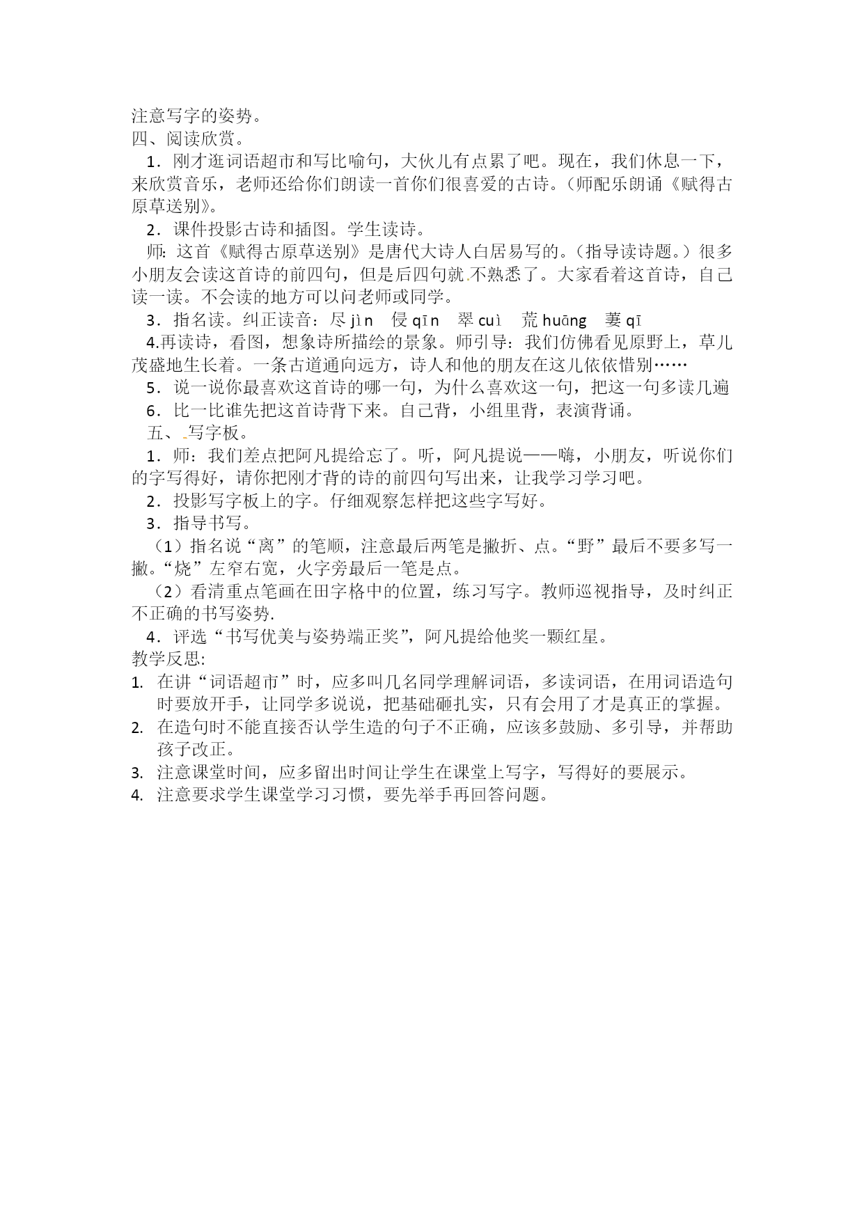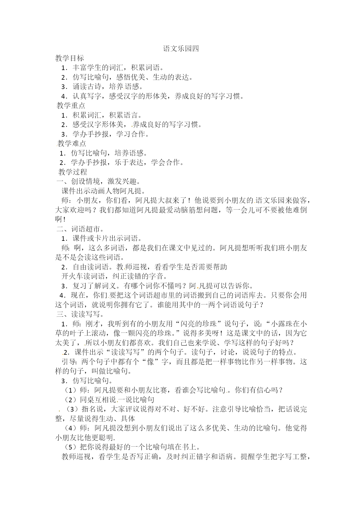 语文乐园四 教学目标1.丰富学生的词汇,积累词语。2.仿写比喻句,感悟优美、生动的表达。3.诵读古诗,培养语感。4.认真写字,感受汉字的形体美,养成良好的写字习惯。教学重点1.积累词汇,积累语言。2.感受汉字形体美,养成良好的写字习惯。3.学办手抄报,学习合作。教学难点1.仿写比喻句,培养语感。2.学办手抄报,乐于表达,学会合作。教学过程一、创设情境,激发兴趣。课件出示动画人物阿凡提。师:小朋友,你们看,阿凡提大叔来了!他说要到小朋友的语文乐园来做客,大家欢迎吗?我们都知道阿凡提最爱动脑筋想问题,等一会儿可不要被他难倒啊!二、词语超市。1.课件或卡片出示词语。师:啊,这么多词语,都是我们在课文中见过的。阿凡提想听听我们班小朋友是不是会读这些词语。2.自由读词语。教师巡视,看看学生是否需要帮助开火车读词语,纠正读错的字音。3.复习了解词义。有哪个词你不懂吗?阿凡提可以告诉你。4.现在,你们要把这个词语超市里的词语搬到自己的词语库去。只要你会用这个词语,就说明你拥有它了。谁能用其中的一两个词语说句子?三、读读写写。1.师:刚才,我听到有的小朋友用“闪亮的珍珠”说句子,说:“小露珠在小草的叶子上滚动,像一颗闪亮的珍珠。”说得多美呀!这是课文中的话,因为它太美了,所以小朋友们都喜欢。我们自己也来学说、学写这样的句子好吗?2.课件出示“读读写写”的两个句子。读句子,讨论,说说句子的特点。引导:两个句子中都有个“像”字,而且都是把一样事物比作另一样事物。这样的句子,叫做比喻句。3.仿写比喻句。(1)师:阿凡提要和小朋友比赛,看谁会写比喻句。你们有信心吗?(2)同桌互相说一说比喻句(3)指名说,大家评议说得对不对、好不好。注意引导比喻恰当,把话说完整,尽量说得生动、具体(4)师:阿凡提没想到小朋友们说出了这么多优美、生动的比喻句。他觉得小朋友比他更聪明.(5)把你说得最好的一个比喻句填在书上。教师巡视,看学生是否写正确,及时纠正错字和语病。提醒学生把字写工整,注意写字的姿势。 四、阅读欣赏。1.刚才逛词语超市和写比喻句,大伙儿有点累了吧。现在,我们休息一下,来欣赏音乐,老师还给你们朗读一首你们很喜爱的古诗。(师配乐朗诵《赋得古原草送别》。2.课件投影古诗和插图。学生读诗。师:这首《赋得古原草送别》是唐代大诗人白居易写的。(指导读诗题。)很多小朋友会读这首诗的前四句,但是后四句就不熟悉了。大家看着这首诗,自己读一读。不会读的地方可以问老师或同学。3.指名读。纠正读音:尽jìn侵qīn翠cuì荒huāng萋qī4.再读诗,看图,想象诗所描绘的景象。师引导:我们仿佛看见原野上,草儿茂盛地生长着。一条古道通向远方,诗人和他的朋友在这儿依依惜别……5.说一说你最喜欢这首诗的哪一句,为什么喜欢这一句,把这一句多读几遍6.比一比谁先把这首诗背下来。自己背,小组里背,表演背诵。五、写字板。1.师:我们差点把阿凡提给忘了。听,阿凡提说——嗨,小朋友,听说你们的字写得好,请你把刚才背的诗的前四句写出来,让我学习学习吧。2.投影写字板上的字。仔细观察怎样把这些字写好。3.指导书写。(1)指名说“离”的笔顺,注意最后两笔是撇折、点。“野”最后不要多写一撇。“烧”左窄右宽,火字旁最后一笔是点。(2)看清重点笔画在田字格中的位置,练习写字。教师巡视指导,及时纠正不正确的书写姿势.4.评选“书写优美与姿势端正奖”,阿凡提给他奖一颗红星。 教学反思: 在讲“词语超市”时,应多叫几名同学理解词语,多读词语,在用词语造句时要放开手,让同学多说说,把基础砸扎实,只有会用了才是真正的掌握。 在造句时不能直接否认学生造的句子不正确,应该多鼓励、多引导,并帮助孩子改正。 注意课堂时间,应多留出时间让学生在课堂上写字,写得好的要展示。 注意要求学生课堂学习习惯,要先举手再回答问题。