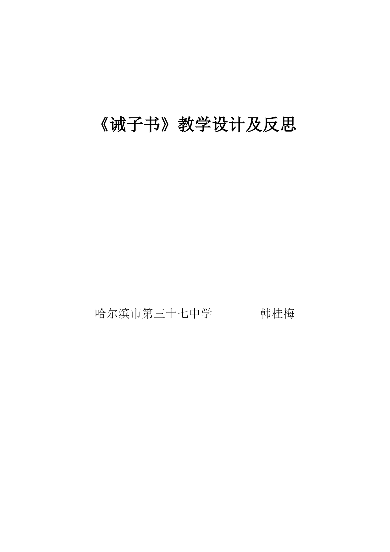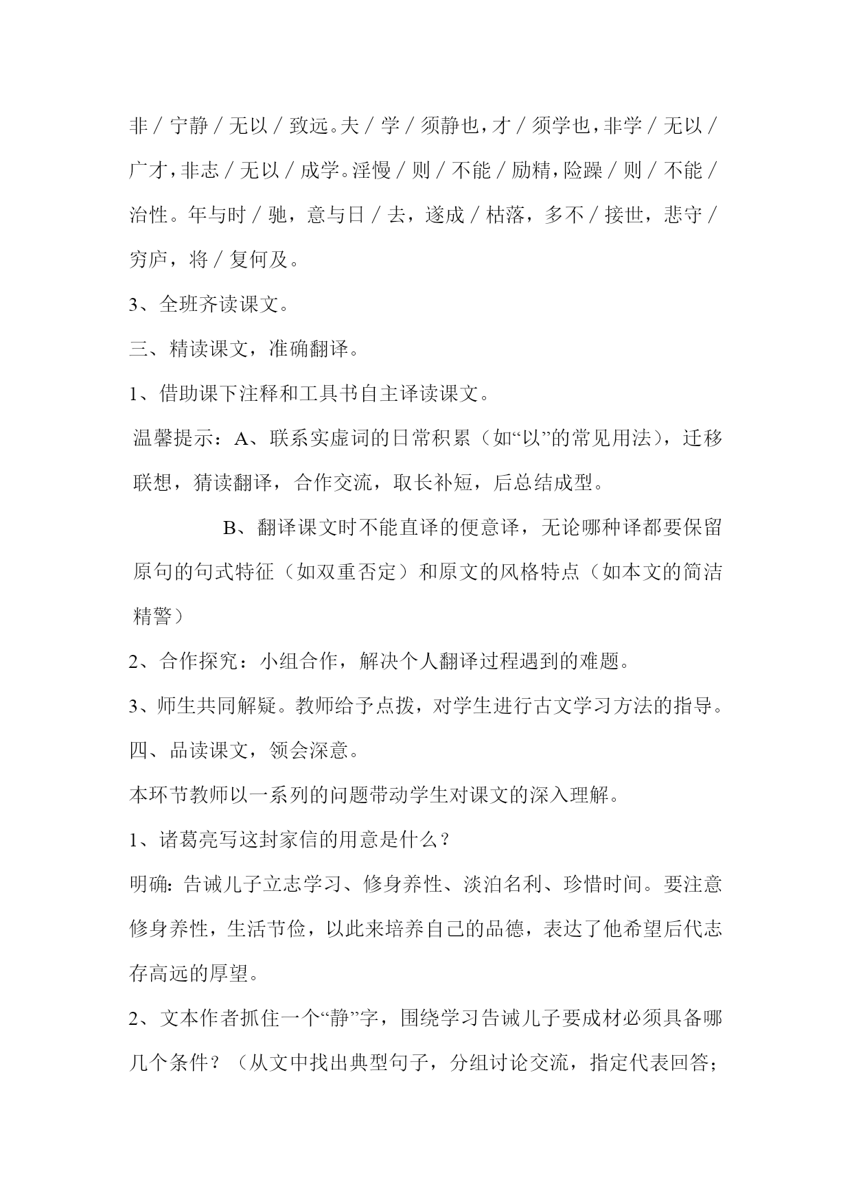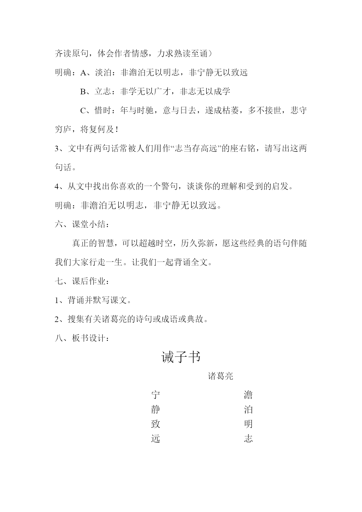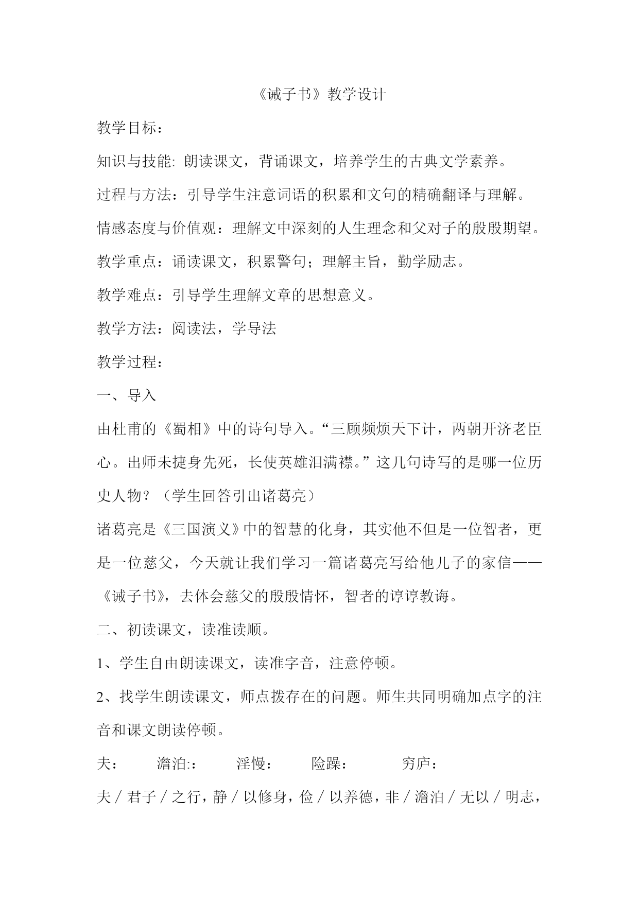 《诫子书》教学设计 教学目标: 知识与技能:朗读课文,背诵课文,培养学生的古典文学素养。 过程与方法:引导学生注意词语的积累和文句的精确翻译与理解。 情感态度与价值观:理解文中深刻的人生理念和父对子的殷殷期望。 教学重点:诵读课文,积累警句;理解主旨,勤学励志。 教学难点:引导学生理解文章的思想意义。 教学方法:阅读法,学导法 教学过程: 一、导入 由杜甫的《蜀相》中的诗句导入。“三顾频烦天下计,两朝开济老臣心。出师未捷身先死,长使英雄泪满襟。”这几句诗写的是哪一位历史人物?(学生回答引出诸葛亮) 诸葛亮是《三国演义》中的智慧的化身,其实他不但是一位智者,更是一位慈父,今天就让我们学习一篇诸葛亮写给他儿子的家信——《诫子书》,去体会慈父的殷殷情怀,智者的谆谆教诲。 二、初读课文,读准读顺。 1、学生自由朗读课文,读准字音,注意停顿。 2、找学生朗读课文,师点拨存在的问题。师生共同明确加点字的注音和课文朗读停顿。 夫:澹泊::淫慢:险躁:穷庐: 夫∕君子∕之行,静∕以修身,俭∕以养德,非∕澹泊∕无以∕明志,非∕宁静∕无以∕致远。夫∕学∕须静也,才∕须学也,非学∕无以∕广才,非志∕无以∕成学。淫慢∕则∕不能∕励精,险躁∕则∕不能∕治性。年与时∕驰,意与日∕去,遂成∕枯落,多不∕接世,悲守∕穷庐,将∕复何及。 3、全班齐读课文。 三、精读课文,准确翻译。 1、借助课下注释和工具书自主译读课文。 温馨提示:A、联系实虚词的日常积累(如“以”的常见用法),迁移联想,猜读翻译,合作交流,取长补短,后总结成型。 B、翻译课文时不能直译的便意译,无论哪种译都要保留原句的句式特征(如双重否定)和原文的风格特点(如本文的简洁精警) 2、合作探究:小组合作,解决个人翻译过程遇到的难题。 3、师生共同解疑。教师给予点拨,对学生进行古文学习方法的指导。 四、品读课文,领会深意。 本环节教师以一系列的问题带动学生对课文的深入理解。 1、诸葛亮写这封家信的用意是什么? 明确:告诫儿子立志学习、修身养性、淡泊名利、珍惜时间。要注意修身养性,生活节俭,以此来培养自己的品德,表达了他希望后代志存高远的厚望。 2、文本作者抓住一个“静”字,围绕学习告诫儿子要成材必须具备哪几个条件?(从文中找出典型句子,分组讨论交流,指定代表回答;齐读原句,体会作者情感,力求熟读至诵) 明确:A、淡泊:非澹泊无以明志,非宁静无以致远 B、立志:非学无以广才,非志无以成学 C、惜时:年与时驰,意与日去,遂成枯萎,多不接世,悲守穷庐,将复何及! 3、文中有两句话常被人们用作“志当存高远”的座右铭,请写出这两句话。 4、从文中找出你喜欢的一个警句,谈谈你的理解和受到的启发。 明确:非澹泊无以明志,非宁静无以致远。 六、课堂小结: 真正的智慧,可以超越时空,历久弥新,愿这些经典的语句伴随我们大家行走一生。让我们一起背诵全文。 七、课后作业: 1、背诵并默写课文。 2、搜集有关诸葛亮的诗句或成语或典故。 八、板书设计: 诫子书 诸葛亮 澹泊明志 宁静致远 《诫子书》教学设计及反思 哈尔滨市第三十七中学韩桂梅