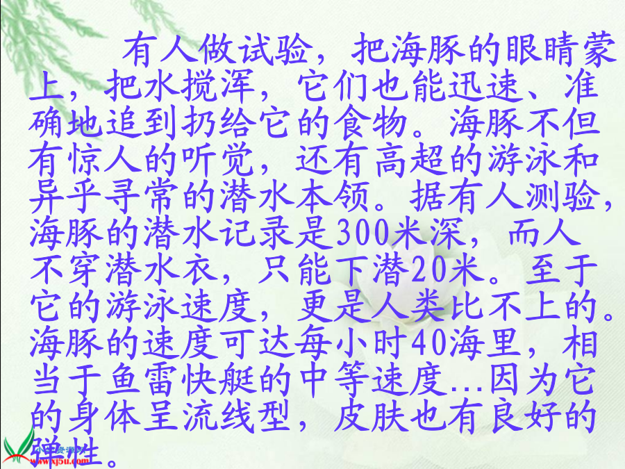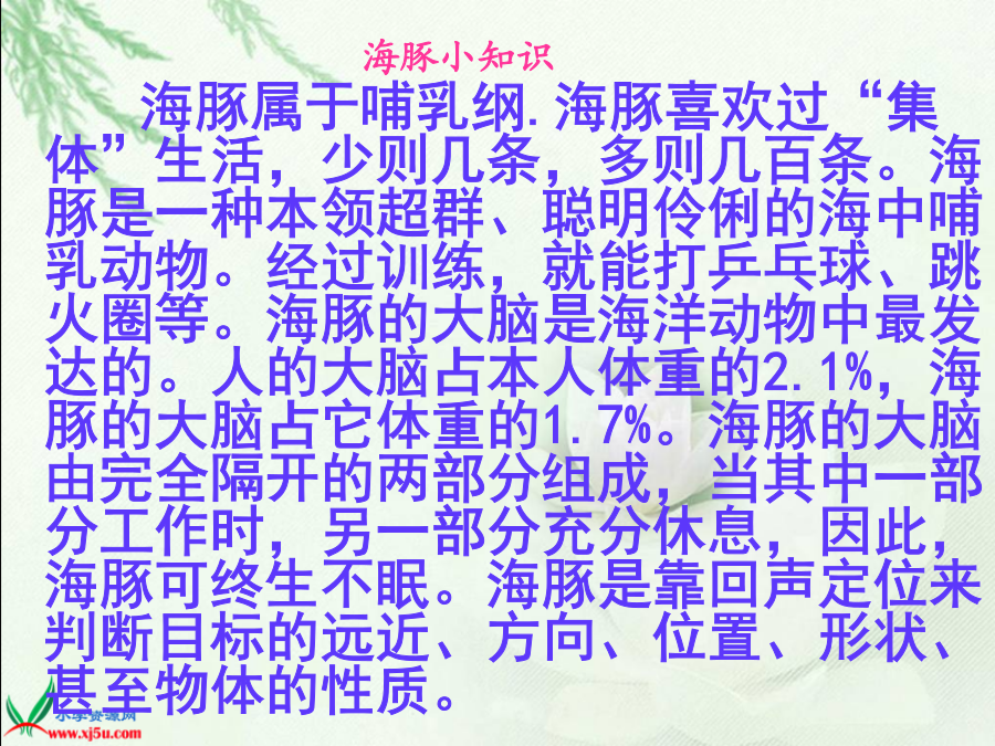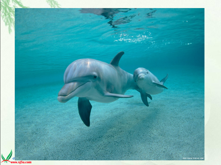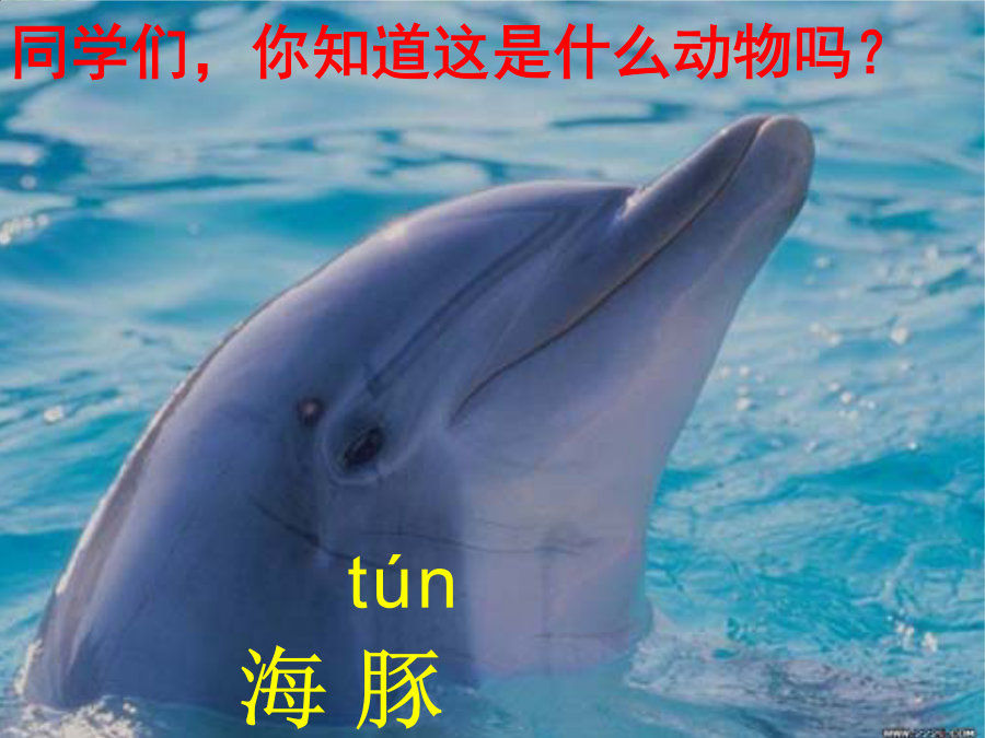 同学们,你知道这是什么动物吗?鳍海豚小知识有人做试验,把海豚的眼睛蒙上,把水搅浑,它们也能迅速、准确地追到扔给它的食物。海豚不但有惊人的听觉,还有高超的游泳和异乎寻常的潜水本领。据有人测验,海豚的潜水记录是300米深,而人不穿潜水衣,只能下潜20米。至于它的游泳速度,更是人类比不上的。海豚的速度可达每小时40海里,相当于鱼雷快艇的中等速度…因为它的身体呈流线型,皮肤也有良好的弹性。海豚救人同学们,海豚的表演真是太精彩了!可是,你知道吗?海豚不仅是优秀的表演艺术家,它还是“见义勇为的海上救生员”!8海豚救人一.读写列生字并组词豚韩鲨狰狞雌鳍海豚韩国鲨鱼 胸鳍狰狞雌海豚 不可思议见义勇为习以为常喜出望外筋疲力尽 我会辨别多音字并组词●海豚是怎样救人的? ●海豚为什么会救人? 海豚救人的三个故事时间海豚是怎样救人的海豚救人的三个故事海豚是怎样救人的海豚救人的三个故事海豚是怎样救人的海豚救人的美德,来源于海豚对其子女的“照料天性”。1.海豚这么棒,你们想用哪些词语 来形容海豚呢? 1.学习了课文后,你有什么想法?2.除了课文中介绍的内容外,你还知道海豚的哪些知识? 海豚为什么游得快选择自己感兴趣的关于海豚的内容,用上面学过的一些表达方法写一篇《海豚的自述》。1.把这个真实故事将给身边的人听。 2.课后自主选择自己感兴趣的词、句、段进行摘抄,养成积累的习惯。 3.小练笔:把你想对海豚说的话写下来。 4.搜集关于海豚的故事。