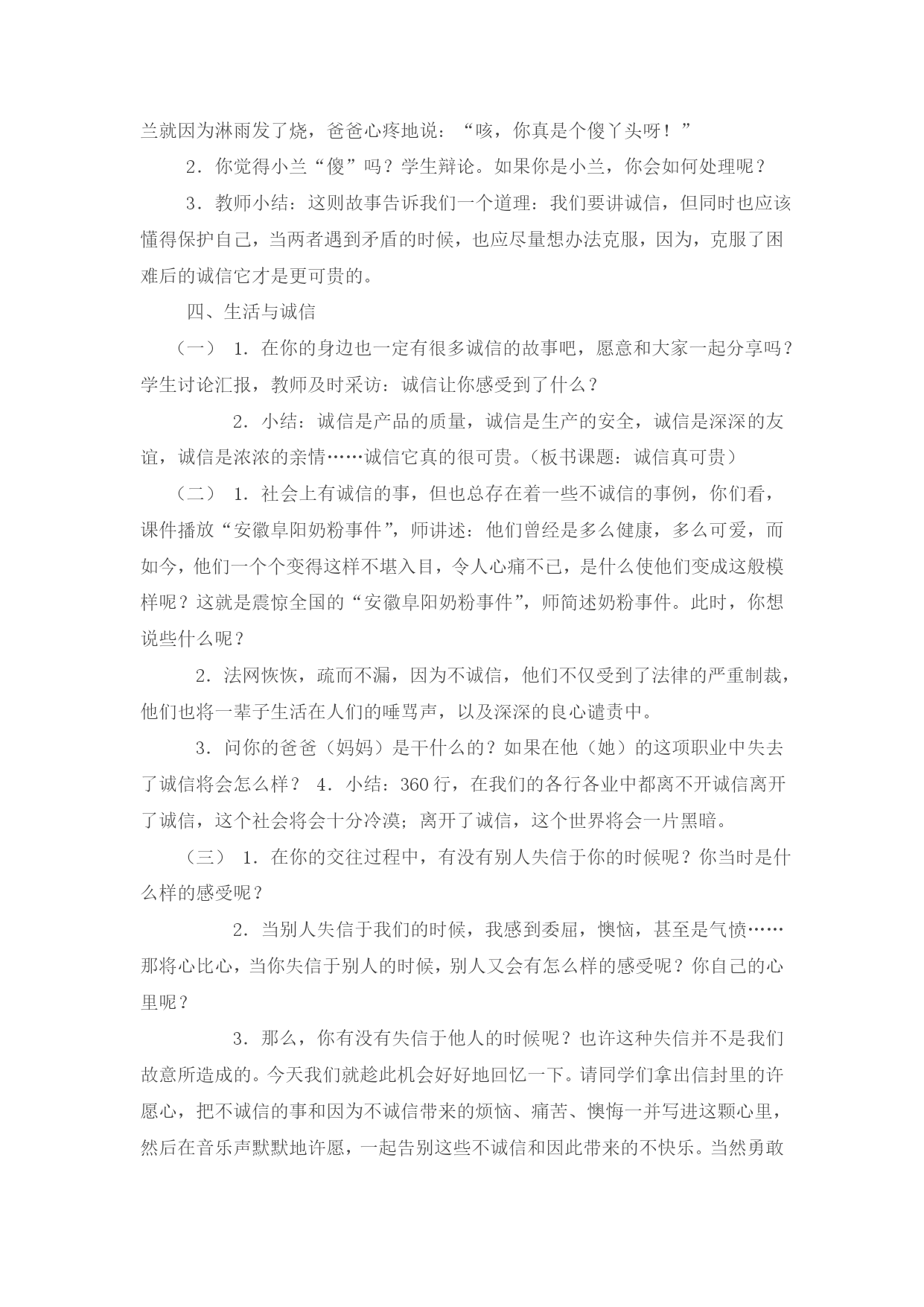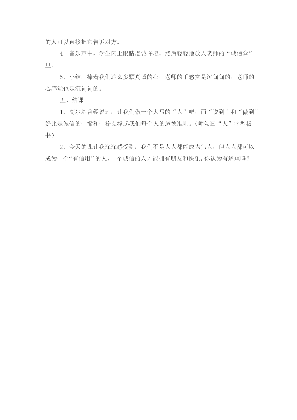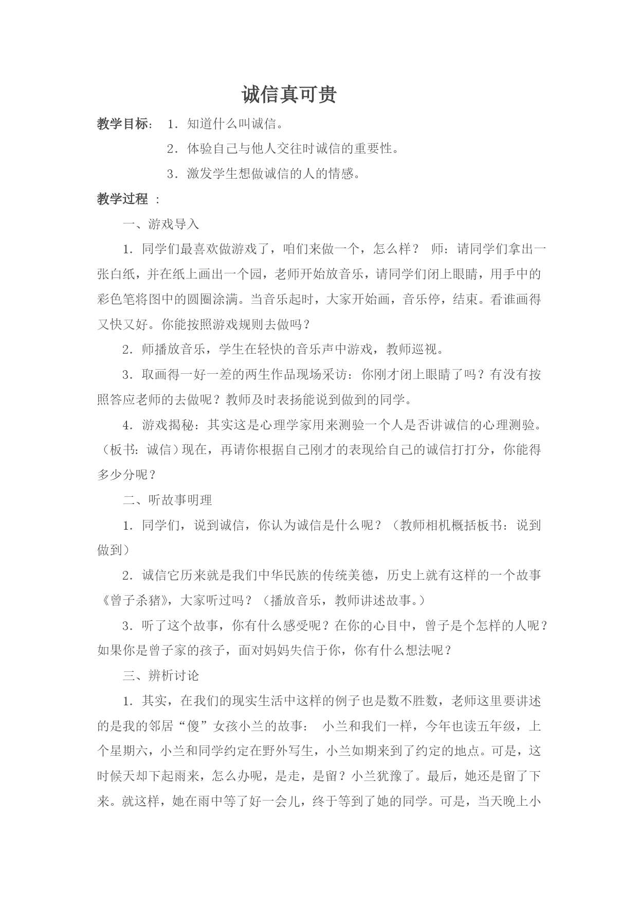 诚信真可贵 教学目标:1.知道什么叫诚信。 2.体验自己与他人交往时诚信的重要性。 3.激发学生想做诚信的人的情感。 教学过程: 一、游戏导入 1.同学们最喜欢做游戏了,咱们来做一个,怎么样?师:请同学们拿出一张白纸,并在纸上画出一个园,老师开始放音乐,请同学们闭上眼睛,用手中的彩色笔将图中的圆圈涂满。当音乐起时,大家开始画,音乐停,结束。看谁画得又快又好。你能按照游戏规则去做吗? 2.师播放音乐,学生在轻快的音乐声中游戏,教师巡视。 3.取画得一好一差的两生作品现场采访:你刚才闭上眼睛了吗?有没有按照答应老师的去做呢?教师及时表扬能说到做到的同学。 4.游戏揭秘:其实这是心理学家用来测验一个人是否讲诚信的心理测验。(板书:诚信)现在,再请你根据自己刚才的表现给自己的诚信打打分,你能得多少分呢? 二、听故事明理 1.同学们,说到诚信,你认为诚信是什么呢?(教师相机概括板书:说到做到) 2.诚信它历来就是我们中华民族的传统美德,历史上就有这样的一个故事《曾子杀猪》,大家听过吗?(播放音乐,教师讲述故事。) 3.听了这个故事,你有什么感受呢?在你的心目中,曾子是个怎样的人呢?如果你是曾子家的孩子,面对妈妈失信于你,你有什么想法呢? 三、辨析讨论 1.其实,在我们的现实生活中这样的例子也是数不胜数,老师这里要讲述的是我的邻居“傻”女孩小兰的故事:小兰和我们一样,今年也读五年级,上个星期六,小兰和同学约定在野外写生,小兰如期来到了约定的地点。可是,这时候天却下起雨来,怎么办呢,是走,是留?小兰犹豫了。最后,她还是留了下来。就这样,她在雨中等了好一会儿,终于等到了她的同学。可是,当天晚上小兰就因为淋雨发了烧,爸爸心疼地说:“咳,你真是个傻丫头呀!” 2.你觉得小兰“傻”吗?学生辩论。如果你是小兰,你会如何处理呢? 3.教师小结:这则故事告诉我们一个道理:我们要讲诚信,但同时也应该懂得保护自己,当两者遇到矛盾的时候,也应尽量想办法克服,因为,克服了困难后的诚信它才是更可贵的。 四、生活与诚信 (一)1.在你的身边也一定有很多诚信的故事吧,愿意和大家一起分享吗?学生讨论汇报,教师及时采访:诚信让你感受到了什么? 2.小结:诚信是产品的质量,诚信是生产的安全,诚信是深深的友谊,诚信是浓浓的亲情……诚信它真的很可贵。(板书课题:诚信真可贵) (二)1.社会上有诚信的事,但也总存在着一些不诚信的事例,你们看,课件播放“安徽阜阳奶粉事件”,师讲述:他们曾经是多么健康,多么可爱,而如今,他们一个个变得这样不堪入目,令人心痛不已,是什么使他们变成这般模样呢?这就是震惊全国的“安徽阜阳奶粉事件”,师简述奶粉事件。此时,你想说些什么呢? 2.法网恢恢,疏而不漏,因为不诚信,他们不仅受到了法律的严重制裁,他们也将一辈子生活在人们的唾骂声,以及深深的良心谴责中。 3.问你的爸爸(妈妈)是干什么的?如果在他(她)的这项职业中失去了诚信将会怎么样?4.小结:360行,在我们的各行各业中都离不开诚信离开了诚信,这个社会将会十分冷漠;离开了诚信,这个世界将会一片黑暗。 (三)1.在你的交往过程中,有没有别人失信于你的时候呢?你当时是什么样的感受呢? 2.当别人失信于我们的时候,我感到委屈,懊恼,甚至是气愤……那将心比心,当你失信于别人的时候,别人又会有怎么样的感受呢?你自己的心里呢? 3.那么,你有没有失信于他人的时候呢?也许这种失信并不是我们故意所造成的。今天我们就趁此机会好好地回忆一下。请同学们拿出信封里的许愿心,把不诚信的事和因为不诚信带来的烦恼、痛苦、懊悔一并写进这颗心里,然后在音乐声默默地许愿,一起告别这些不诚信和因此带来的不快乐。当然勇敢的人可以直接把它告诉对方。 4.音乐声中,学生闭上眼睛虔诚许愿。然后轻轻地放入老师的“诚信盒”里。 5.小结:捧着我们这么多颗真诚的心,老师的手感觉是沉甸甸的,老师的心感觉也是沉甸甸的。 五、结课 1.高尔基曾经说过:让我们做一个大写的“人”吧,而“说到”和“做到”好比是诚信的一撇和一捺支撑起我们每个人的道德准则。(师勾画“人”字型板书) 2.今天的课让我深深感受到:我们不是人人都能成为伟人,但人人都可以成为一个“有信用”的人,一个诚信的人才能拥有朋友和快乐。你认为有道理吗?