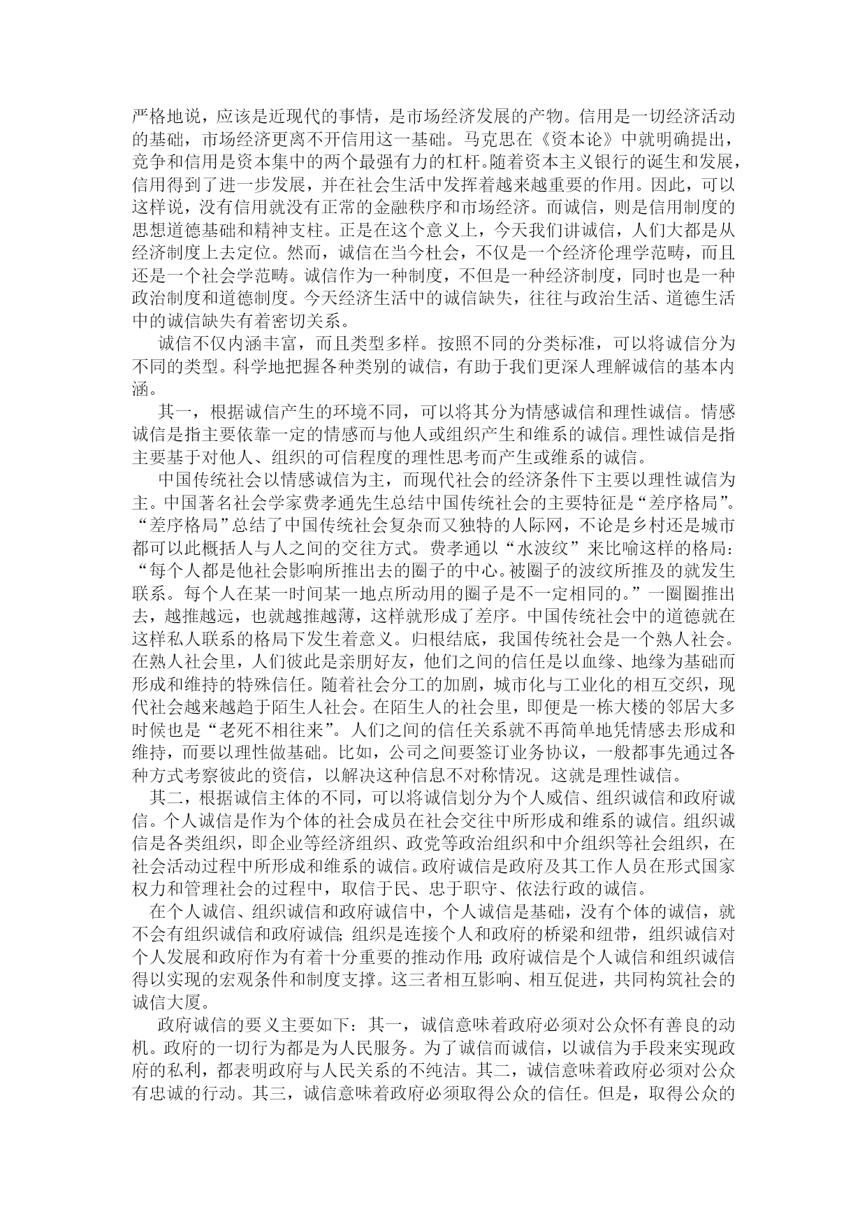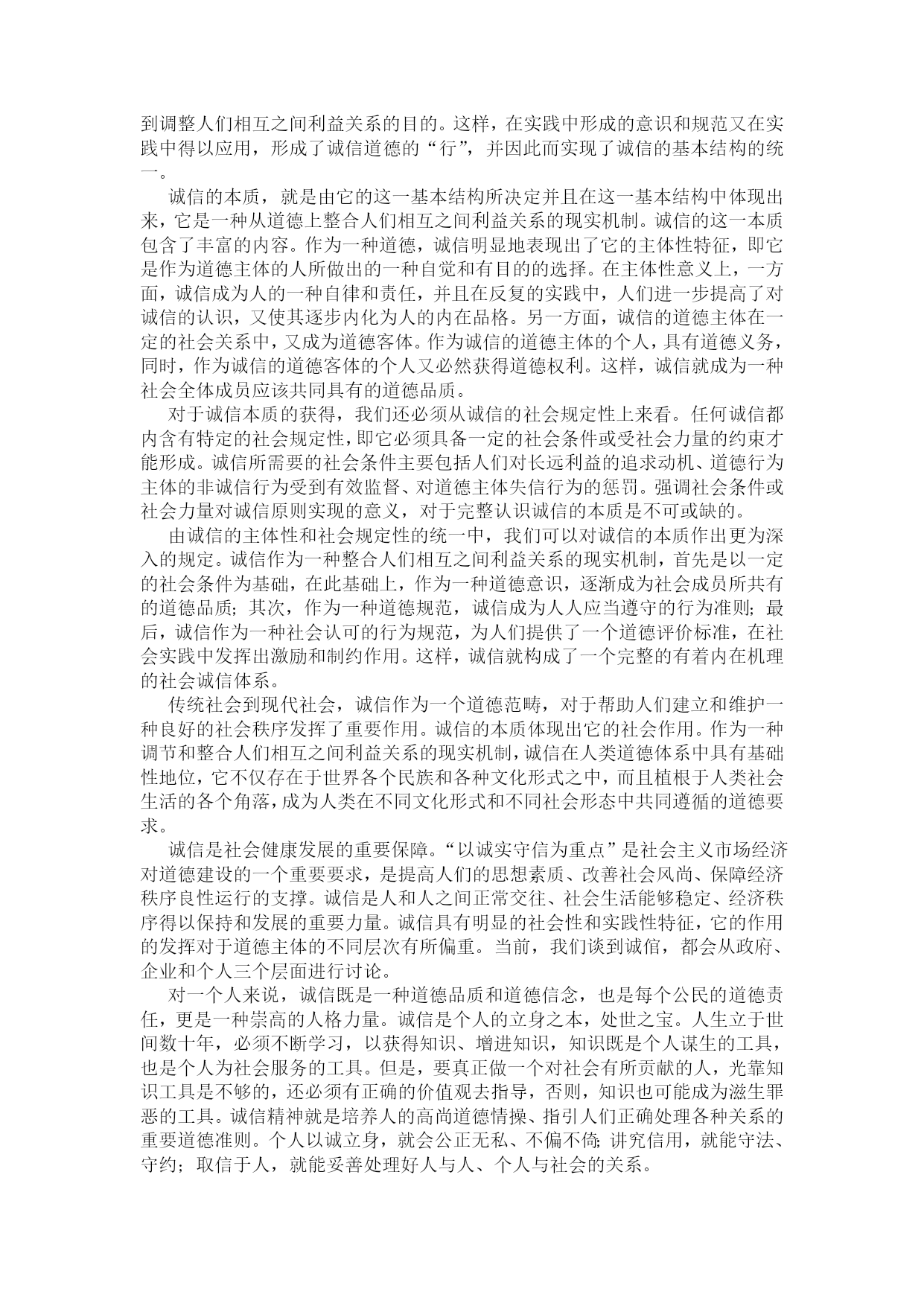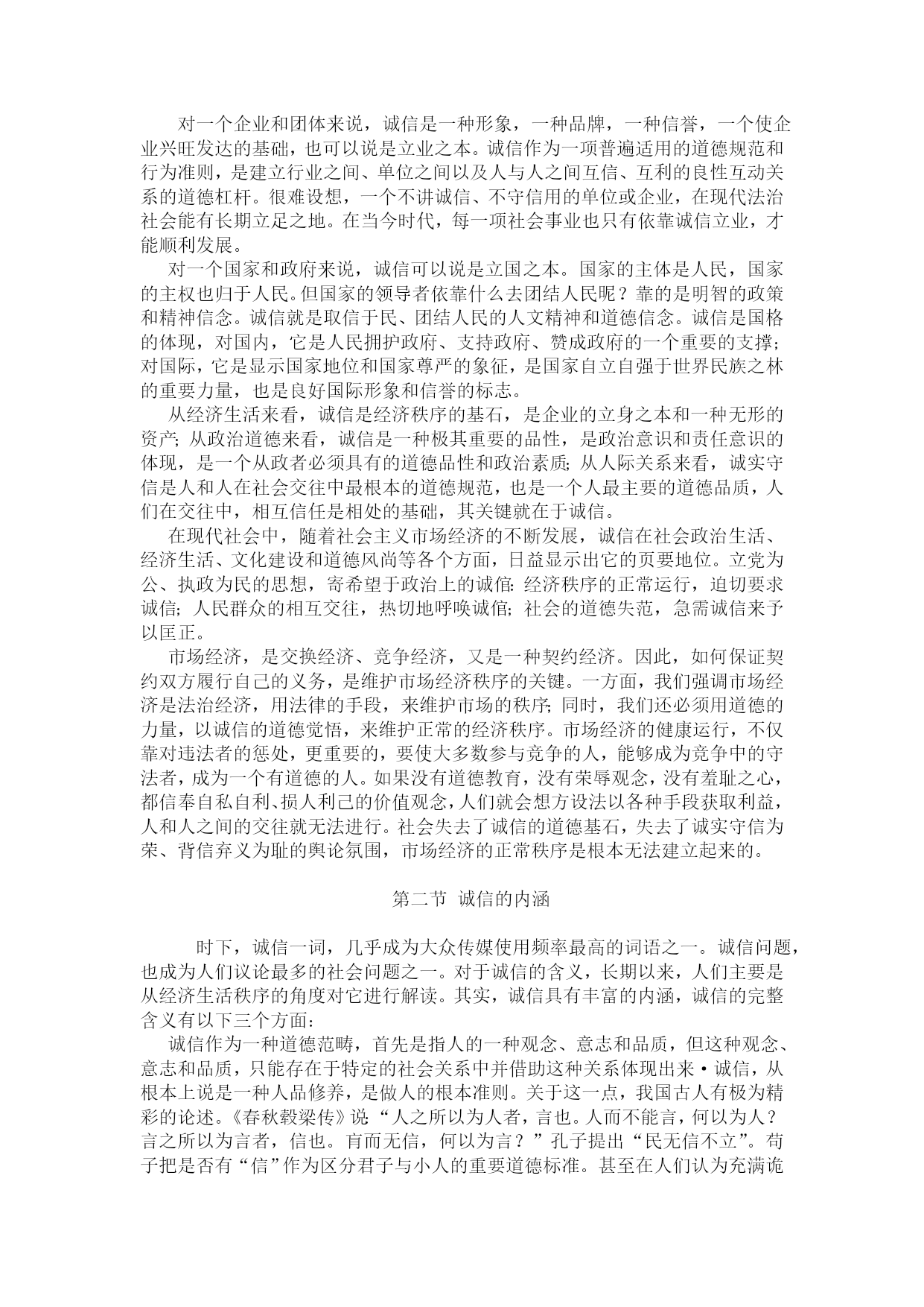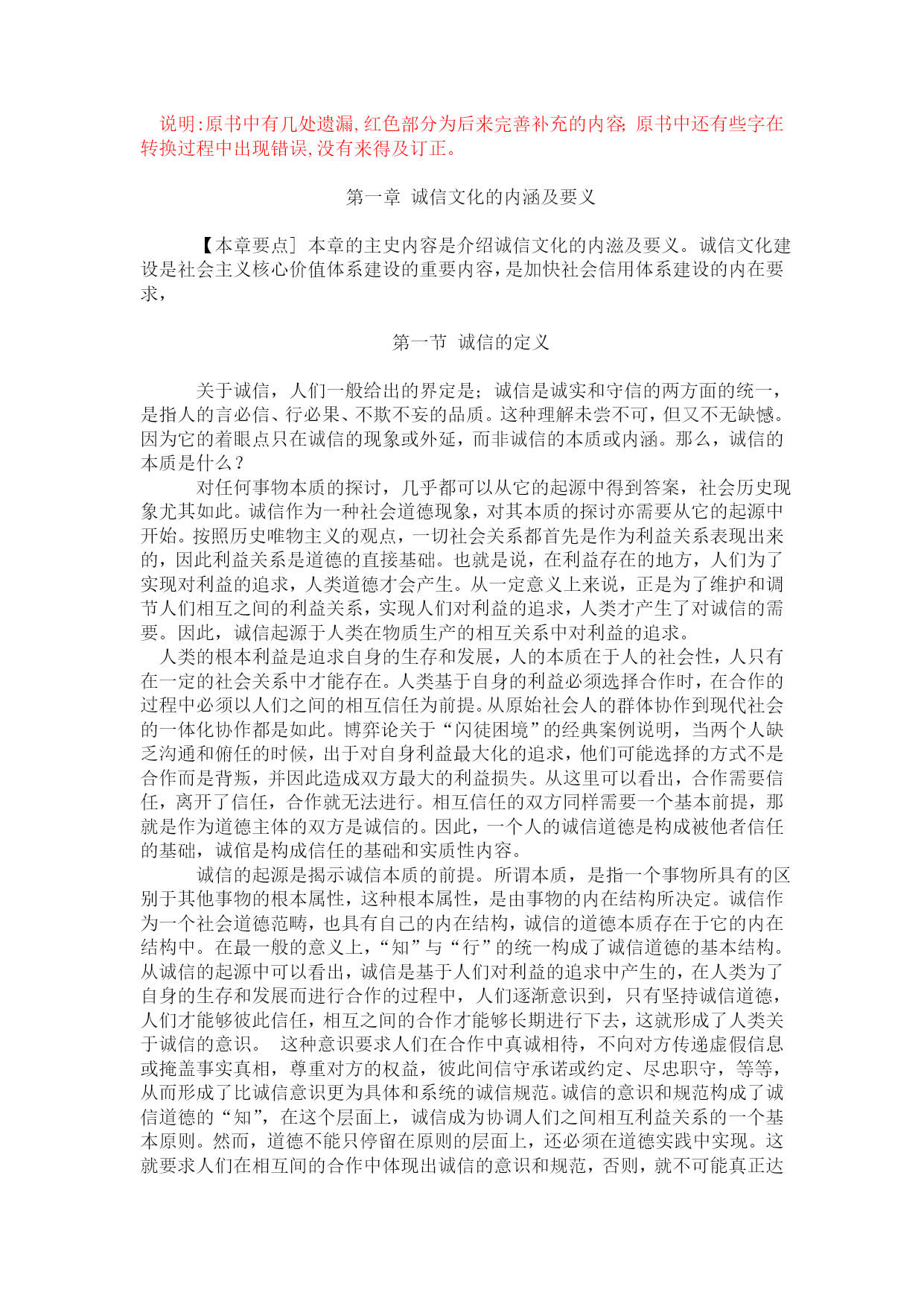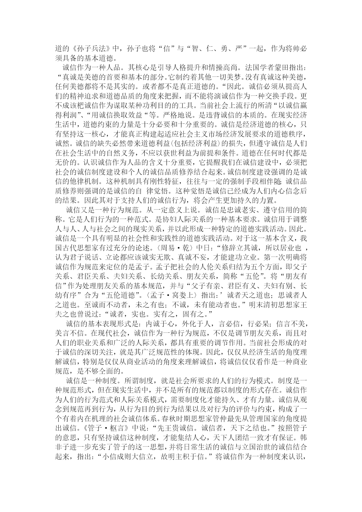 说明:原书中有几处遗漏,红色部分为后来完善补充的内容;原书中还有些字在转换过程中出现错误,没有来得及订正。 第一章诚信文化的内涵及要义 【本章要点]本章的主史内容是介绍诚信文化的内滋及要义。诚信文化建设是社会主义核心价值体系建设的重要内容,是加快社会信用体系建设的内在要求, 第一节诚信的定义 关于诚信,人们一般给出的界定是;诚信是诚实和守信的两方面的统一,是指人的言必信、行必果、不欺不妄的品质。这种理解未尝不可,但又不无缺憾。因为它的着眼点只在诚信的现象或外延,而非诚信的本质或内涵。那么,诚信的本质是什么? 对任何事物本质的探讨,几乎都可以从它的起源中得到答案,社会历史现象尤其如此。诚信作为一种社会道德现象,对其本质的探讨亦需要从它的起源中开始。按照历史唯物主义的观点,一切社会关系都首先是作为利益关系表现出来的,因此利益关系是道德的直接基础。也就是说,在利益存在的地方,人们为了实现对利益的追求,人类道德才会产生。从一定意义上来说,正是为了维护和调节人们相互之间的利益关系,实现人们对利益的追求,人类才产生了对诚信的需要。因此,诚信起源于人类在物质生产的相互关系中对利益的追求。 人类的根本利益是迫求自身的生存和发展,人的本质在于人的社会性,人只有在一定的社会关系中才能存在。人类基于自身的利益必须选择合作时,在合作的过程中必须以人们之间的相互信任为前提。从原始社会人的群体协作到现代社会的一体化协作都是如此。博弈论关于“闪徒困境”的经典案例说明,当两个人缺乏沟通和俯任的时候,出于对自身利益最大化的追求,他们可能选择的方式不是合作而是背叛,并因此造成双方最大的利益损失。从这里可以看出,合作需要信任,离开了信任,合作就无法进行。相互信任的双方同样需要一个基本前提,那就是作为道德主体的双方是诚信的。因此,一个人的诚信道德是构成被他者信任的基础,诚倌是构成信任的基础和实质性内容。 诚信的起源是揭示诚信本质的前提。所谓本质,是指一个事物所具有的区别于其他事物的根本属性,这种根本属性,是由事物的内在结构所决定。诚信作为一个社会道德范畴,也具有自己的内在结构,诚信的道德本质存在于它的内在结构中。在最一般的意义上,“知”与“行”的统一构成了诚信道德的基本结构。从诚信的起源中可以看出,诚信是基于人们对利益的追求中产生的,在人类为了自身的生存和发展而进行合作的过程中,人们逐渐意识到,只有坚持诚信道德,人们才能够彼此信任,相互之间的合作才能够长期进行下去,这就形成了人类关于诚信的意识。这种意识要求人们在合作中真诚相待,不向对方传递虚假信息或掩盖事实真相,尊重对方的权益,彼此间信守承诺或约定、尽忠职守,等等,从而形成了比诚信意识更为具体和系统的诚信规范。诚信的意识和规范构成了诚信道德的“知”,在这个层面上,诚信成为协调人们之间相互利益关系的一个基本原则。然而,道德不能只停留在原则的层面上,还必须在道德实践中实现。这就要求人们在相互间的合作中体现出诚信的意识和规范,否则,就不可能真正达到调整人们相互之间利益关系的目的。这样,在实践中形成的意识和规范又在实践中得以应用,形成了诚信道德的“行”,并因此而实现了诚信的基本结构的统一。 诚信的本质,就是由它的这一基本结构所决定并且在这一基本结构中体现出来,它是一种从道德上整合人们相互之间利益关系的现实机制。诚信的这一本质包含了丰富的内容。作为一种道德,诚信明显地表现出了它的主体性特征,即它是作为道德主体的人所做出的一种自觉和有目的的选择。在主体性意义上,一方面,诚信成为人的一种自律和责任,并且在反复的实践中,人们进一步提高了对诚信的认识,又使其逐步内化为人的内在品格。另一方面,诚信的道德主体在一定的社会关系中,又成为道德客体。作为诚信的道德主体的个人,具有道德义务,同时,作为诚信的道德客体的个人又必然获得道德权利。这样,诚信就成为一种社会全体成员应该共同具有的道德品质。 对于诚信本质的获得,我们还必须从诚信的社会规定性上来看。任何诚信都内含有特定的社会规定性,即它必须具备一定的社会条件或受社会力量的约束才能形成。诚信所需要的社会条件主要包括人们对长远利益的追求动机、道德行为主体的非诚信行为受到有效监督、对道德主体失信行为的惩罚。强调社会条件或社会力量对诚信原则实现的意义,对于完整认识诚信的本质是不可或缺的。 由诚信的主体性和社会规定性的统一中,我们可以对诚信的本质作出更为深入的规定。诚信作为一种整合人们相互之间利益关系的现实机制,首先是以一定的社会条件为基础,在此基础上,作为一种道德意识,逐渐成为社会成员所共有的道德品质;其次,作为一种道德规范,诚信成为人人应当遵守的行为准则;最后,诚信作为一种社会认可的行为规范,为人们提供了一个道德评价标准,在社会实践中发挥出激励和制约作用。这样,诚信就构成了一个完整的有着内