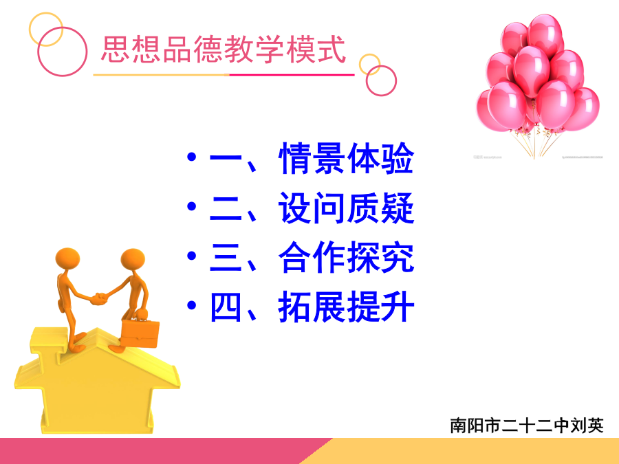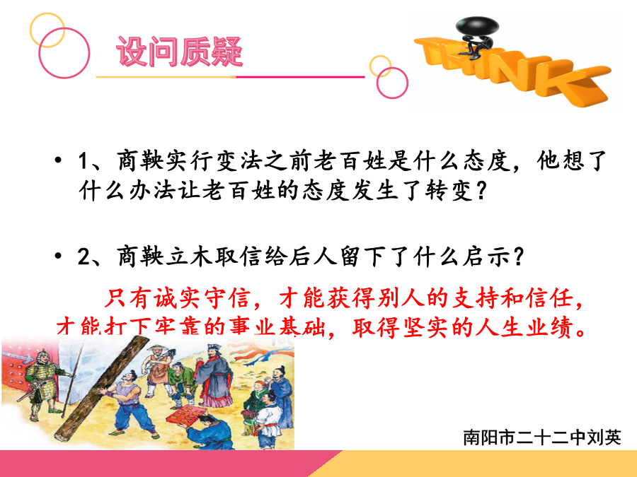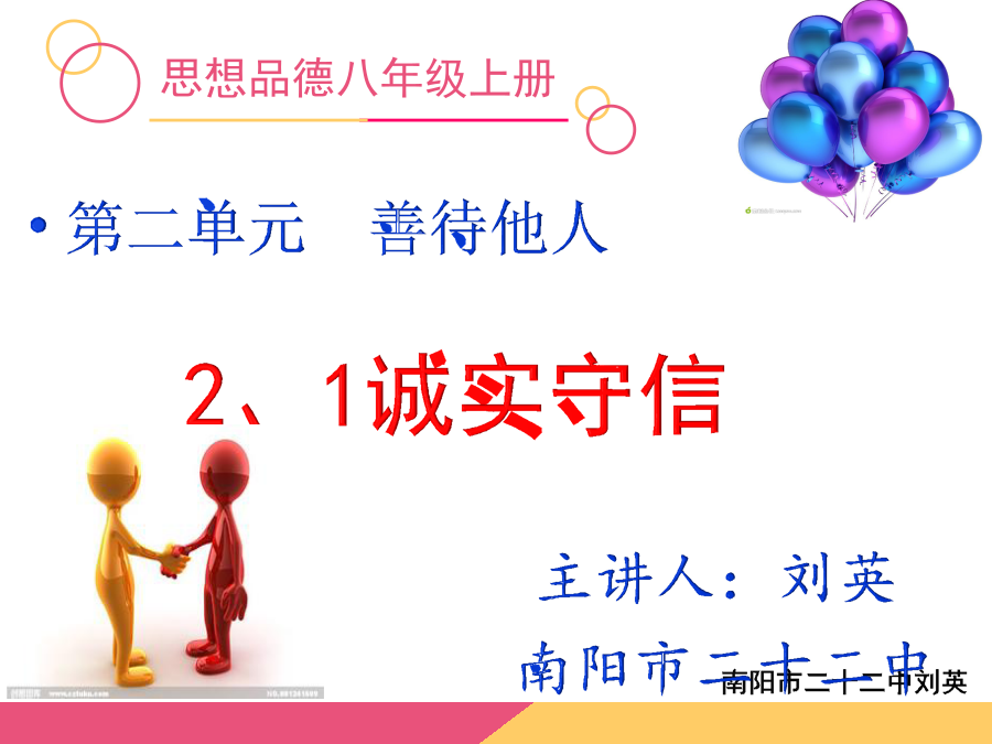 思想品德课堂模式 探索成果展示课思想品德教学模式思想品德八年级上册历史典故设问质疑请你来说一说有关诚信的词语、格言、典故。诚信公益广告-窍门篇.mp4合作探究:观察生活不诚信的行为会让我们失去信用,失去朋友,失去人格尊严,道德沦丧。 对己诚实,对人守信,才能获得他人的信任与尊重,才能建立良好的人际关系。合作探究:观察生活不诚信的行为会使人们产生信用危机,从而引发社会动荡,最终害人害己、误国误民。 诚实守信才能建立良好的人际关系,打下牢靠的事业基础,取得坚实的人生业绩,推动社会文明进步。名人语录情景体验:凡人壮举设问质疑生活风景情境一: 小菊活泼开朗,说话直爽。那天她对小茜说:“你太胖了,穿这件白色连衣裙不好看,简直像一只白熊。” 小菊的同桌小舟的父母离异,小舟不愿意对别人提这件事,小菊偶然知道了。一次,全班填写社会调查表,有“是否单亲家庭”一栏,小舟空着没填,小菊当众大声问:“你爸妈不是离婚了吗?”我们有权保留自己的隐私,也应该尊重他人的隐私,要懂得在适当的场合和对象面前适当的说话。情境二: 小菊的爷爷得了癌症,生命即将走到尽头,但他自己还不知道自己得的是不治之症。病床前,当爷爷问起自己的病情,小菊的妈妈说:“您的病并不严重,只要自己有信心就一定能治好。”站一旁的小菊听了,不禁纳闷:“老师说做人不能弄虚作假,可妈妈为什么要骗爷爷呢?” 心灵导航诚信的品德是在日常生活中培养起来的。如果经常反思自己的内心和行为,就能鞭策自己,使诚信美德在心中牢固树立. 请结合所学内容,反思自己,写下自己有关诚信的经历并与大家一起分享。 拓展升华言必行,行必果; 知之为知之,不知为不知; 以诚信换取诚信; 以诚信获得成功; 用诚信开启知识之窗; 用诚信鼓起上进之帆; 我诚信,我光荣; 我诚信,我自尊; 我诚信,我成功; 我要做一个诚信的小公民。 宣誓人: 2016年10月19日谢谢指导! 再见!