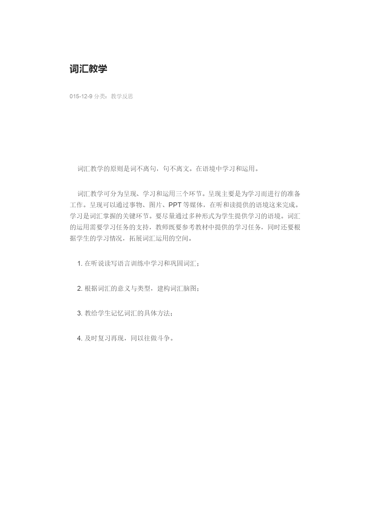 词汇教学 015-12-9分类:教学反思 HYPERLINK"http://i.yanxiu.com/blog/10100312/126991906307154!cateId=0"HYPERLINK"http://i.yanxiu.com/blog/10100312/126991906307154!cateId=0"\o"分享到QQ空间"HYPERLINK"http://i.yanxiu.com/blog/10100312/126991906307154!cateId=0"\o"分享到新浪微博"HYPERLINK"http://i.yanxiu.com/blog/10100312/126991906307154!cateId=0"\o"分享到腾讯微博"HYPERLINK"http://i.yanxiu.com/blog/10100312/126991906307154!cateId=0"\o"分享到人人网"HYPERLINK"http://i.yanxiu.com/blog/10100312/126991906307154!cateId=0"\o"分享到微信" 词汇教学的原则是词不离句,句不离文。在语境中学习和运用。 词汇教学可分为呈现、学习和运用三个环节。呈现主要是为学习而进行的准备工作。呈现可以通过事物、图片、PPT等媒体,在听和读提供的语境这来完成。学习是词汇掌握的关键环节。要尽量通过多种形式为学生提供学习的语境。词汇的运用需要学习任务的支持,教师既要参考教材中提供的学习任务,同时还要根据学生的学习情况,拓展词汇运用的空间。 1.在听说读写语言训练中学习和巩固词汇; 2.根据词汇的意义与类型,建构词汇脑图; 3.教给学生记忆词汇的具体方法; 4.及时复习再现,同以往做斗争。