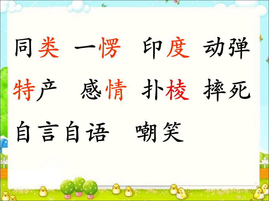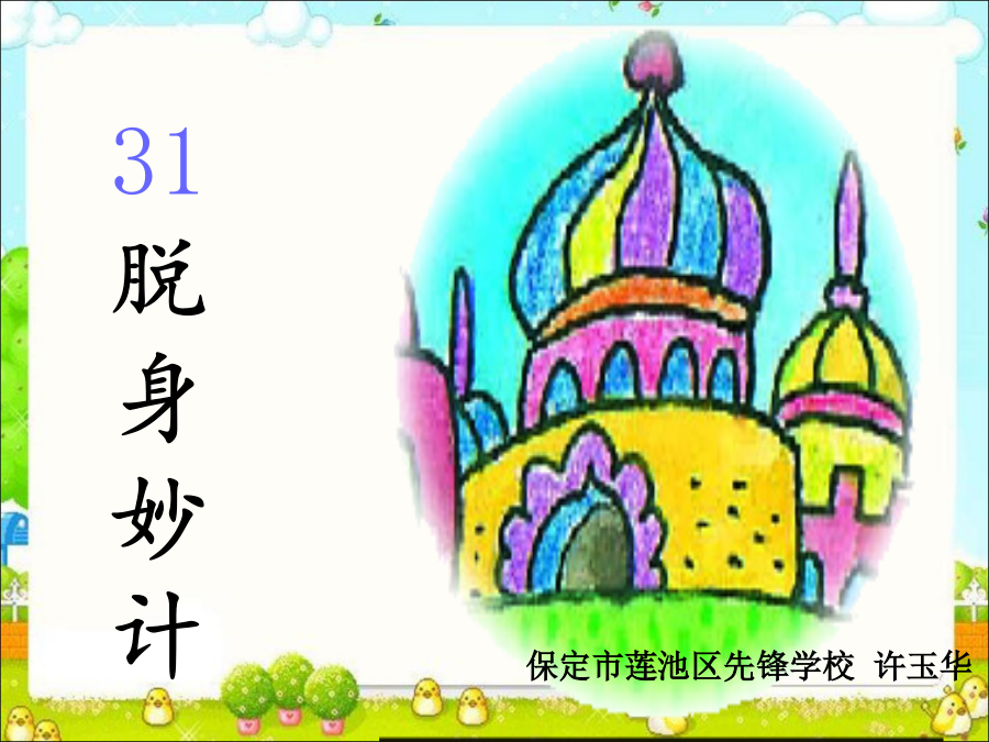 31脱身妙计印度泰姬陵认真读课文: 1、读准字音,不多字,不丢字,不错字; 2、读通句意,遇到难的字词多读两遍 同类一愣印度动弹 特产感情扑棱摔死 自言自语嘲笑印度鸟的脱身妙计是什么?按提示把课文分为两个部分“那——”印度鸟低头想了想说,“请你给我的亲朋好友带个口信吧,就说我被关在笼子里,没有自由,很苦很苦。”商人点点头,出发了。到了印度,商人办完事以后,真的来到森林里找到那只笼中鸟的同类,传了口信。一只鸟从树上掉下来,商人没想到鸟儿也这么重感情。 一只鸟儿听了以后,噗的一声从树上掉了下来,一动也不动了。商人一愣,想不到鸟儿也像人一样,这么重感情啊!商人回到家里,那只鸟一见他就问:“主人哪,我的口信你带到了没有?”“带到了。”商人回答。“太令人感动了。你的一个同类听说你被关在笼子里,不能和他们一样自由自在地生活,难过得从树上掉下来,摔死了。” “你说什么?那个摔死的可能是我的妈妈。” 印度鸟说完,也一头栽倒在笼子里,再也不动弹了。商人一边自言自语,一边打开笼子把印度鸟往窗外扔去。他刚脱手,鸟儿就扑棱一声飞走了。“哈哈!我的主人,你听我说!”印度鸟落在院中的一棵树上,嘲笑商人说,“你以为我真的有口信要带吗?你认为我的那个同类真的死了吗?不!这正是我的脱身妙计呀!”印度鸟的脱身妙计是什么?谈谈这篇文章给你什么启示情节巧妙,结尾点明真相, 意料之外,引人入胜。 推荐阅读: 《两只鸭子的故事》 《皇帝的新装》