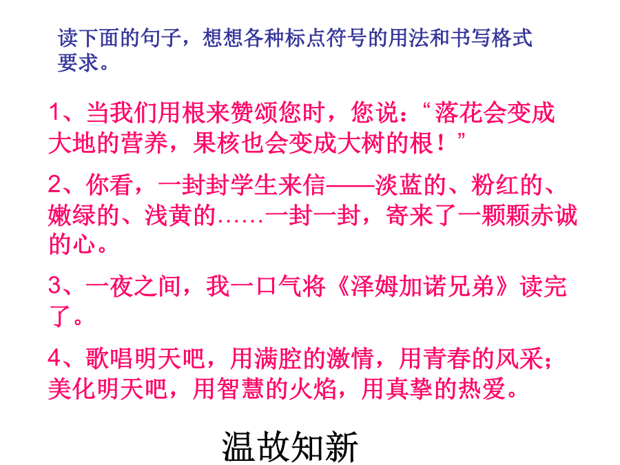 语文s版六年级下册 两人小组学习:高大的银杏树习作要求 让我们选择母校生活的几个片段写一篇文章,来抒发我们对母校的感激之情。题目自拟,字数不限。学习、游戏、活动、打扫卫生 班队会、捐款、颁奖、军训、大队委竞选 英语剧、科普剧、唐诗小唱、读书比赛 故事经典朗诵、合唱比赛小组交流《校园交响诗》 其一、以()的形式从五方面生动地描写了校园生活的丰富多彩,表达了学生对母校的深厚情感。 其二、运用了大量的比喻。 忘不了,忘不了那次考试失败之后…… 忘不了,忘不了那次班队会上…… 忘不了,忘不了那次难忘的军训……例: 记得刚刚步入校园的我,对一切都感到特别害怕。进了教室,望着一张张陌生的脸庞…… 还记得读二年级的时候,我已经有了自己的好朋友、学习上的小伙伴了。下课后…… 至今难以忘怀的是和蔼可亲的李老师,她为了锻炼我,让我加入了班干部行列,让我……例文赏析感谢母校 光阴似箭,日月如梭,转眼间,小学六年过去了,我们马上就要离开亲爱的母校,远走高飞,展翅飞翔。在这里我要说一声:“感谢您,我的母校!” 感谢老师的淳淳教导,给予我们宝贵的知识。记得班上有一位同学,经常不按时交作业,上课也是“身在曹营心在汉”,为此,老师特意抽出时间来给大家悉心地教导,老师说:“读书,不是为了别人,而是为了自己,为了爱你们的父母而读书,同时更是为了中华之崛起而读书呀!只有好好学习,才能无愧于自己,无愧于祖国呀!”我们听了老师语重心长的教导,埋头深思,那位同学更是面红耳赤,惭愧地低下了头。感谢老师,像园丁一样,照顾着我们这些成长中的花朵。感谢同学们的悉心照料,让我感受到了爱的力量。那次的体育课上,大家都在跑步,而我却一不留神被脚下的细沙滑倒在地,好多人都停下了脚步,几位女生跑来把我扶了起来,搀着我坐在了台阶上。烈日炎炎,她们特意为我找了一个清凉的地方,还为我倒了杯水,见我没有什么大碍,她们才继续跑步。当体育老师宣布解散时,同学们并没有冲出队伍独自玩耍,而是跑到我的身边嘘寒问暖,一声声“你怎么样了?”“没事吧?”像一股热流流淌进了我的心房,我感动得泪水涟涟。感谢同学,在我有困难的时候伸出援助之手,同学们就像是风雨中的小草,与大家一起患难与共。感谢母校感谢老师 给予我知识和力量 明天我将展翅飞翔感谢母校,在我迷惘的时候为我指明了前方的道路。当我因为考试没考好试而灰心时,校园墙壁上的一句“失败是成功之母”的标语让我重新鼓起了勇气。当我因为前面的道路太艰难而退缩停息时,教学楼上的“勇攀高峰”让我勇往直前,不后退。一次次的比赛,让我尝到了成功的喜悦与失败的酸楚。感谢母校,像一只小船,激励着我们勇往直前。 感谢母校,让我们汲取到了无穷无尽的知识;感谢母校,让我们感受到了爱与温暖;感谢母校,给予了我们锻炼的机会,让我们在这里快乐成长。动笔习作优秀例文怎样修改本次习作? 1、事件是否完整、具体?情感是否真实? 选材:二三事 描写具体:人物的语言、动作、心理、神态 2、是否有错别字或用错的标点符号?语句是否通顺? 谆谆教导、谢、港、篝、勤、锻炼、 3、良好的开头和结尾。 4、加上好词、佳句。精彩的开头和结尾1、时间过得真快,转眼间小学六年的生活就要过去了。我从一个懵懂无知的少年长成了一个精力充沛、充满智慧的少年,就要升入初中学习更多的知识。但我永远不会忘记您,感谢您,母校! 申行健岁月像小河的流水,带着欢快的笑声流去。“天下无不散之筵席。”我们马上就要离开母校,远走高飞,跃过人生第一个“转折点”。六年的学习生活就像一幅幅永不褪色的图画在我眼前闪过。让我们说一声:“感谢您,我的母校!”雷松潮母校就像是我的家,哺育着我;母校就像是一个避风港,保护着我;母校就像是一位母亲,接纳、包容着我。在这里,我要大声地说:“母校啊,我爱您!”程惠琳