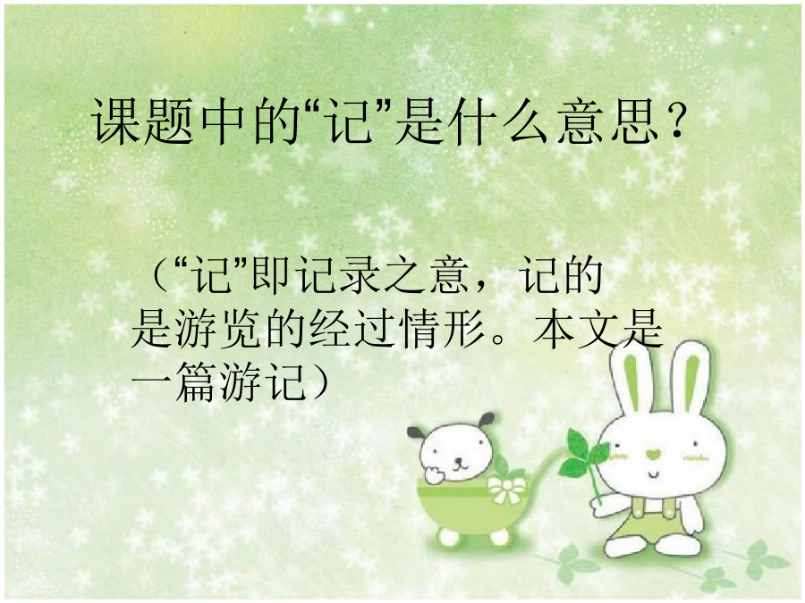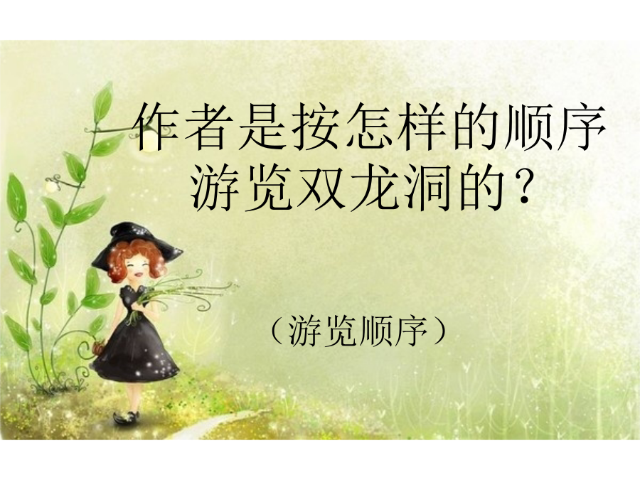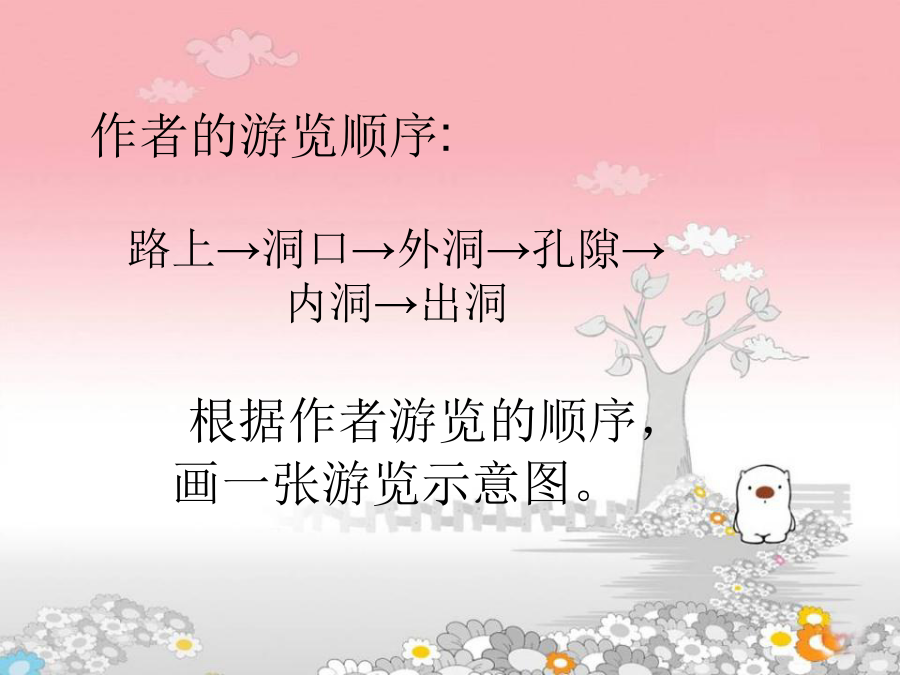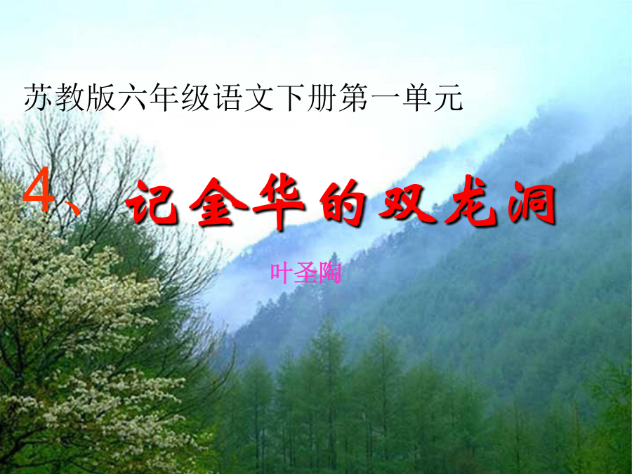 苏教版六年级语文下册第一单元 4、记金华的双龙洞叶圣陶课题中的“记”是什么意思?作者是按怎样的顺序游览双龙洞的?作者的游览顺序: 路上→洞口→外洞→孔隙→ 内洞→出洞 根据作者游览的顺序, 画一张游览示意图。找出描写泉水的句子,画上横线。 (一路迎着溪流。 入山大约五公里就来到双龙洞口,那溪流就是从洞里出来的。 泉水靠着洞口的右边往外流。 在外洞找泉水的来路,原来是从靠左边的石壁下方的孔隙流出 泉水靠着右边缓缓地流,声音轻轻的。上源在漆黑的石洞里。)根据这些句子,理出泉水 流经的路线。 (深黑的石洞→内洞→孔隙→外洞→洞口→山下)(一)品赏路上的见闻。1、从课文中找出有关的句子来大声读一读。2、交流:作者看到了什么?听到了什么? (作者沿途看到了映山红、油桐、山、溪流。映山红繁多而茂盛,油桐花也很多,粉红色的山独具特色,溪流随着山势不断变化,听到了淙淙的溪水声。)映山红油桐新绿洞口外洞外洞自由读第五自然段,回答 1、作者是怎样进入内洞的? 2、孔隙有怎样的特点? 3、作者的感受是什么样的?“孔隙”的特点是“窄、矮、险"。从以下几方面可以看出来: (1)船大小的描写 (2)对进洞方式的描写 (3)对自己感受的描写孔隙一段的写作特点: 通过描写船小、进洞方式及作者的感受写出孔隙的特点。 (借其他事物描写本事物)我们来到内洞,发现了什么? (指名读第6自然段)避水金针海龟探险黄龙游完之后,说说你们的感受吧!