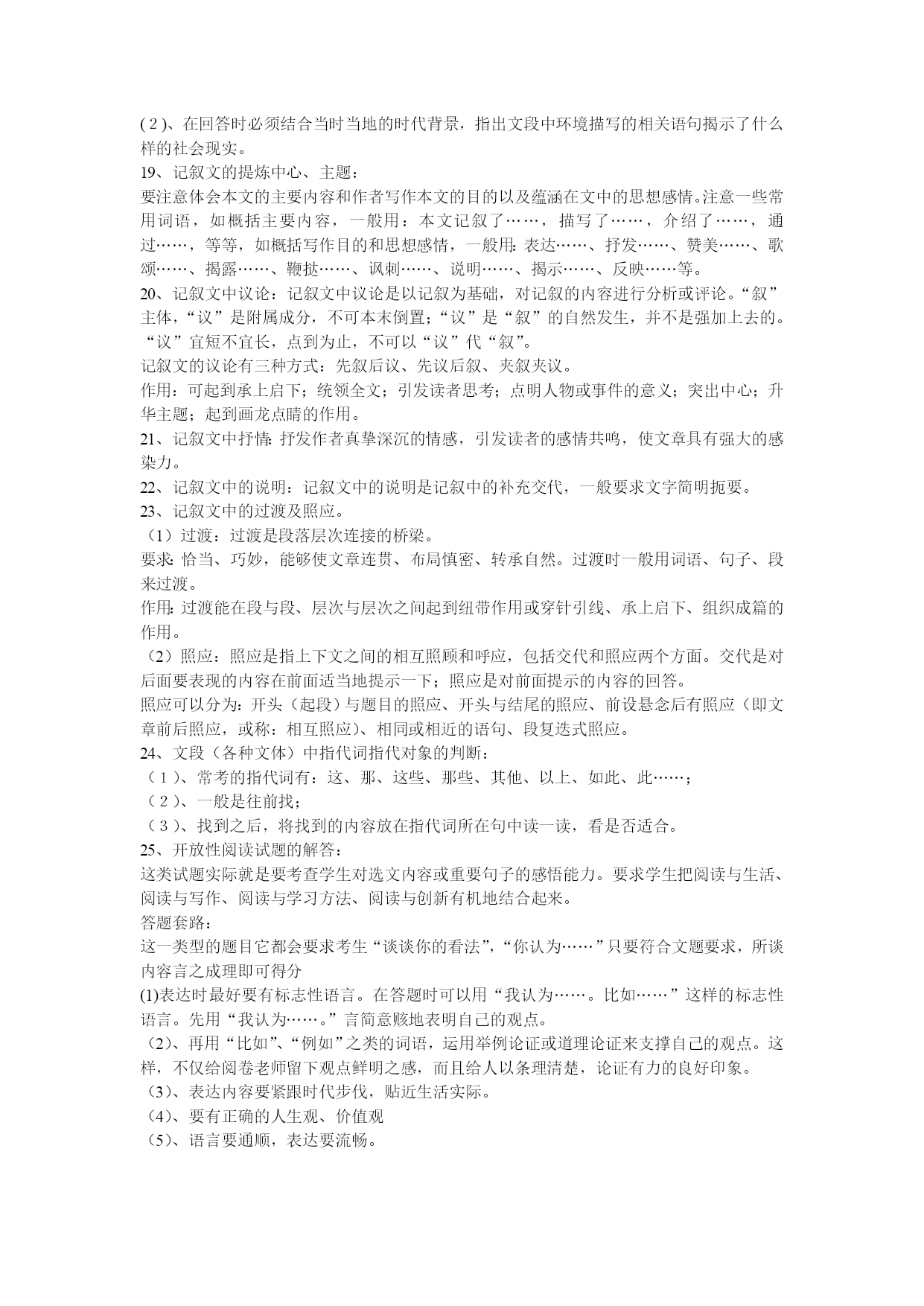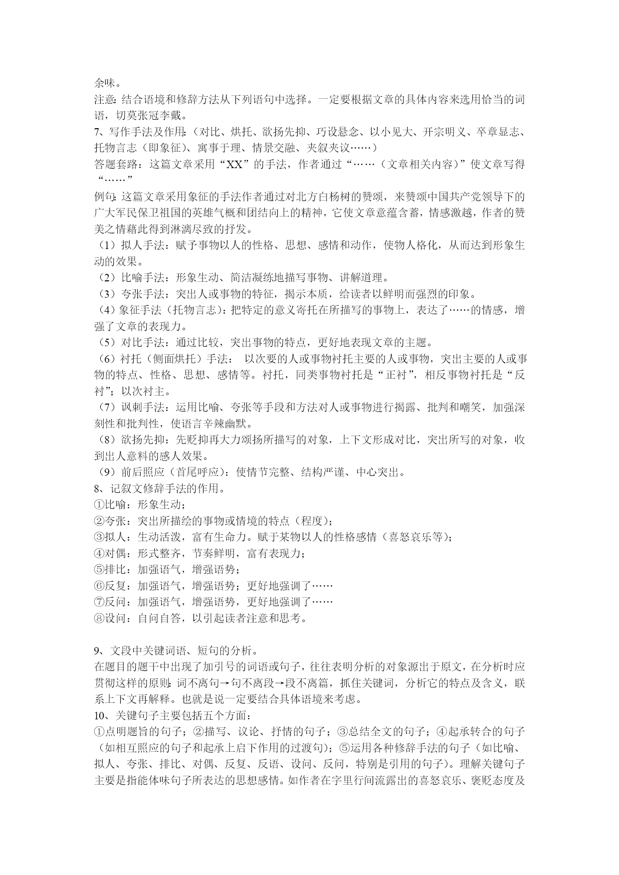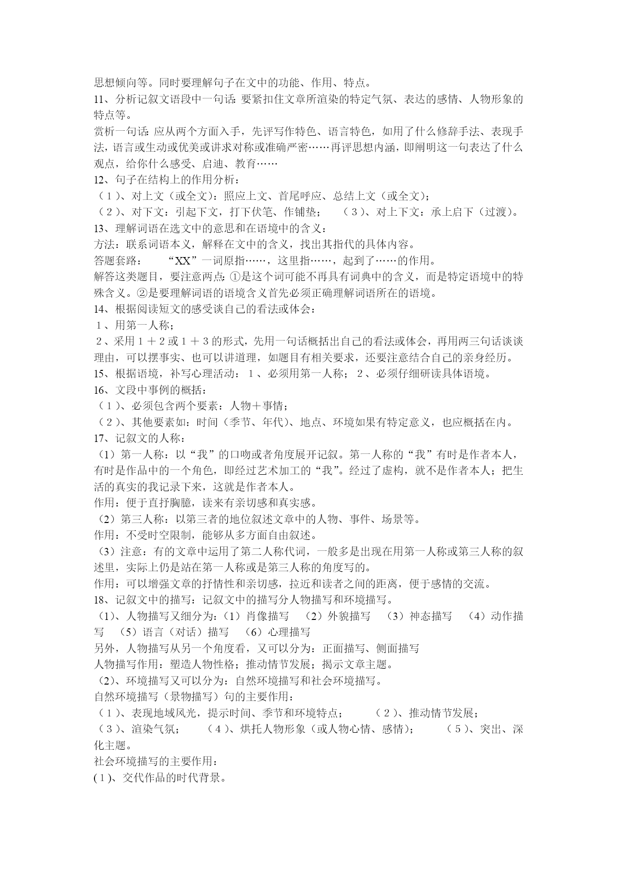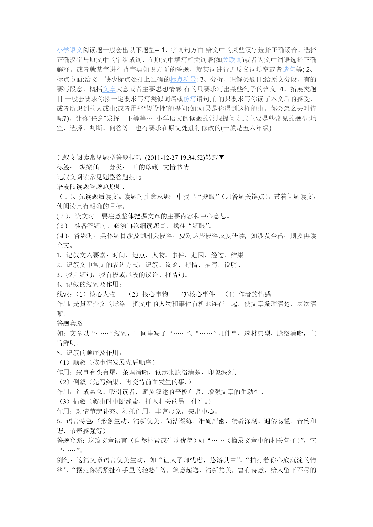 HYPERLINK"http://www.so.com/s?q=%E5%B0%8F%E5%AD%A6%E8%AF%AD%E6%96%87&ie=utf-8&src=wenda_link"\t"_blank"小学语文阅读题一般会出以下题型--1、字词句方面:给文中的某些汉字选择正确读音、选择正确汉字与原文中的字组成词、在原文中填写相关词语(如HYPERLINK"http://www.so.com/s?q=%E5%85%B3%E8%81%94%E8%AF%8D&ie=utf-8&src=wenda_link"\t"_blank"关联词)或者为文中词语选择正确解释,或者就某字进行查字典知识方面的答题、就某词进行近反义词填空或者HYPERLINK"http://www.so.com/s?q=%E9%80%A0%E5%8F%A5&ie=utf-8&src=wenda_link"\t"_blank"造句等;2、标点方面:给文中缺少标点处打上正确的HYPERLINK"http://www.so.com/s?q=%E6%A0%87%E7%82%B9%E7%AC%A6%E5%8F%B7&ie=utf-8&src=wenda_link"\t"_blank"标点符号;3、分析、理解类题目:给原文分段,有的要写段意、概括HYPERLINK"http://www.so.com/s?q=%E6%96%87%E7%AB%A0&ie=utf-8&src=wenda_link"\t"_blank"文章大意或者主要思想情感;有的只要求写出某些句子的含义;4、拓展类题目:一般会要求你按一定要求写写类似词语或HYPERLINK"http://www.so.com/s?q=%E4%BB%BF%E5%86%99&ie=utf-8&src=wenda_link"\t"_blank"仿写语句;有的只要求写你读了本文后的感受,或者所想到的人或事;或者用些“假设性”的提问(如:如果是你遇到这样的事,你会怎么去对待呢?),让你“任意”发挥一下等等···小学语文阅读题的常规提问方式主要是些常见的题型:填空、选择、判断、问答等,也有要求在原文处进行修改的(一般是五六年级).。 记叙文阅读常见题型答题技巧(2011-12-2719:34:52)转载▼ 标签:鏁欒偛 分类:叶的珍藏--文情书情 记叙文阅读常见题型答题技巧 语段阅读题答题总原则: (1)、先读题后读文。读题时注意从题干中找出“题眼”(即答题关键点),带着问题读文,使阅读具有明确的目标。 (2)、读文时,要注意整体把握文章的主要内容和中心意思。 (3)、准备答题时,必须再次细读题目,找准“题眼”。 (4)、答题时,具体题目涉及到相关段落,要对这些段落反复研读;如涉及全篇,则要再读全文。 1、记叙文六要素:时间、地点、人物、事件、起因、经过、结果 2、记叙文中常见的表达方式:记叙、议论、抒情、描写、说明。 3、找主题句:找首段或尾段的议论、抒情句。 4、记叙的线索及作用: 线索:(1)核心人物(2)核心事物(3)核心事件(4)作者的情感 作用:是贯穿全文的脉络,把文中的人物和事件有机地连在一起,使文章条理清楚、层次清晰。 答题套路: 如:文章以“……”线索,中间串写了“……”、“……”几件事,选材典型,脉络清晰,主旨鲜明。 5、记叙的顺序及作用: (1)顺叙(按事情发展先后顺序) 作用:叙事有头有尾,条理清晰,读起来脉络清楚、印象深刻。 (2)倒叙(先写结果,再交待前面发生的事。) 作用:造成悬念、吸引读者,避免叙述的平板单调,增强文章的生动性。 (3)插叙(叙事时中断线索,插入相关的另一件事。) 作用:对情节起补充、衬托作用,丰富形象,突出中心。 6、语言特色:(形象生动、清新优美、简洁凝练、准确严密、精辟深刻、通俗易懂、音韵和谐、节奏感强等) 答题套路:这篇文章语言(自然朴素或生动优美)如“……(摘录文章中的相关句子)”,它“……”。 例句:这篇文章语言优美生动,如“让人了却忧虑,悠游其中”、“拍打着你心底沉淀的情绪”、“攫走你紧紧扯在手里的轻愁”等,笔意超逸,清新隽美,富有诗意,给人留下不尽的余味。 注意:结合语境和修辞方法从下列语句中选择。一定要根据文章的具体内容来选用恰当的词语,切莫张冠李戴。 7、写作手法及作用:(对比、烘托、欲扬先抑、巧设悬念、以小见大、开宗明义、卒章显志、托物言志(即象征)、寓事于理、情景交融、夹叙夹议……) 答题套路:这篇文章采用“XX”的手法,作者通过“……(文章相关内容)”使文章写得“……” 例句:这篇文章采用象征的手法作者通过对北方白杨树的赞颂,来赞颂中国共产党领导下的广大军民保卫祖国的英雄气概和团结向上的精神,它使文章意蕴含蓄,情感激越,作者的赞