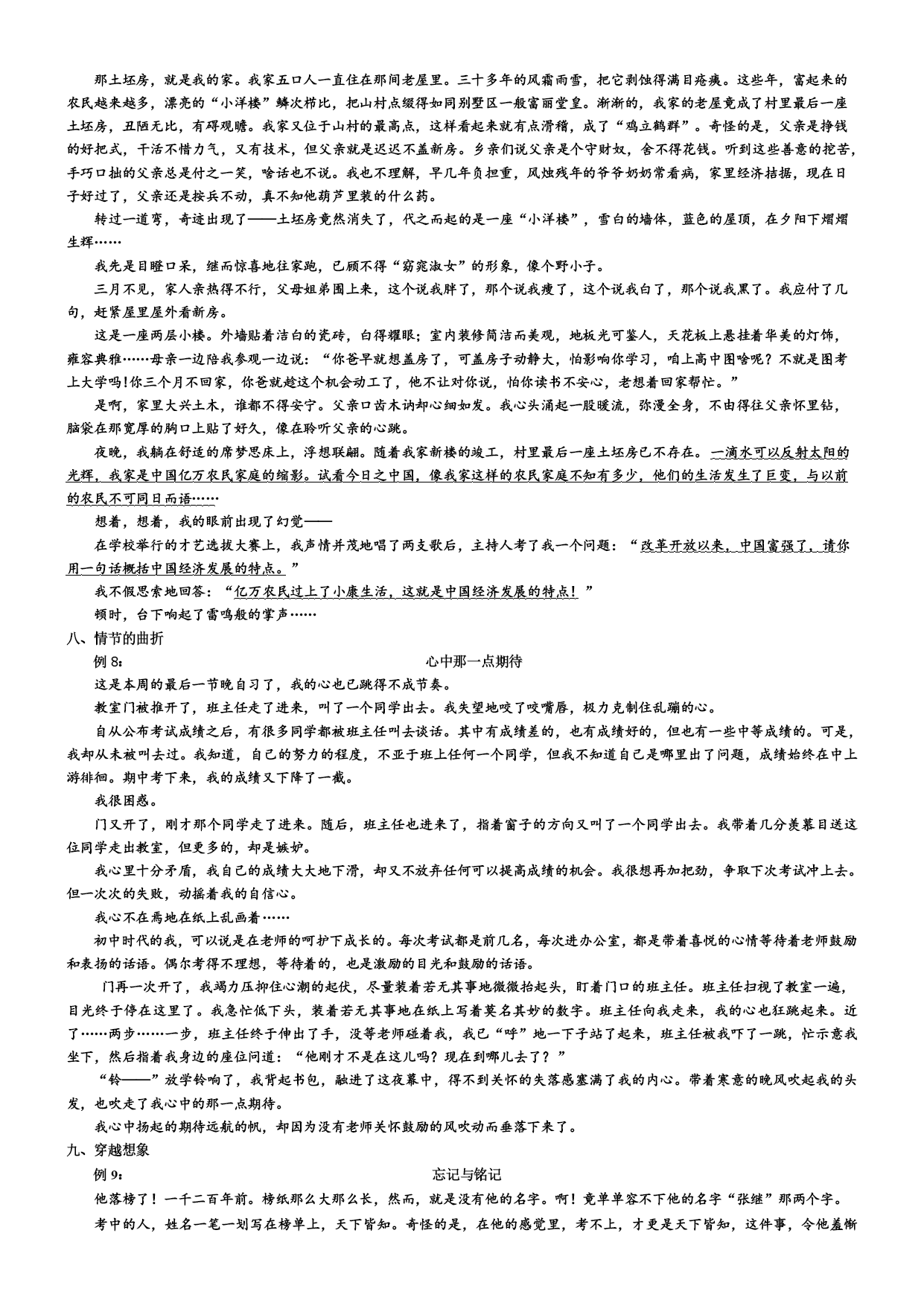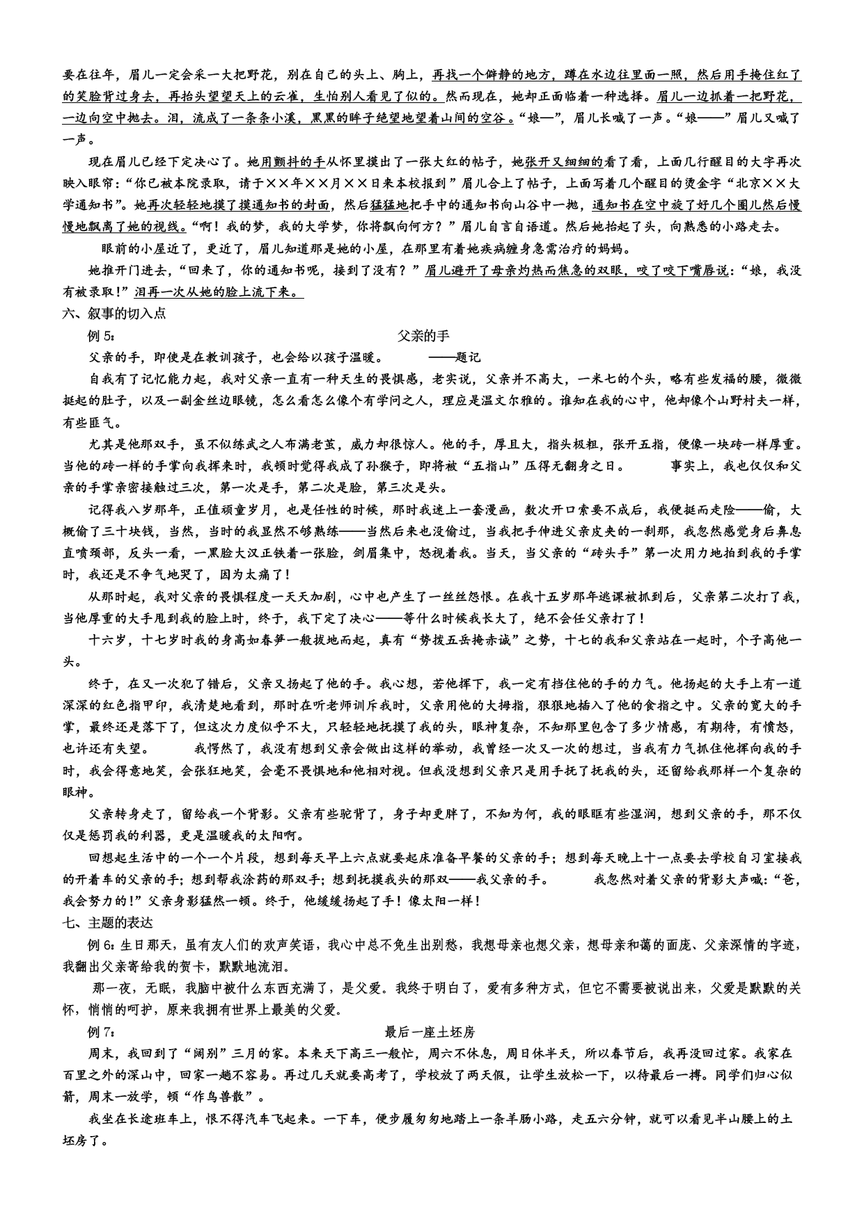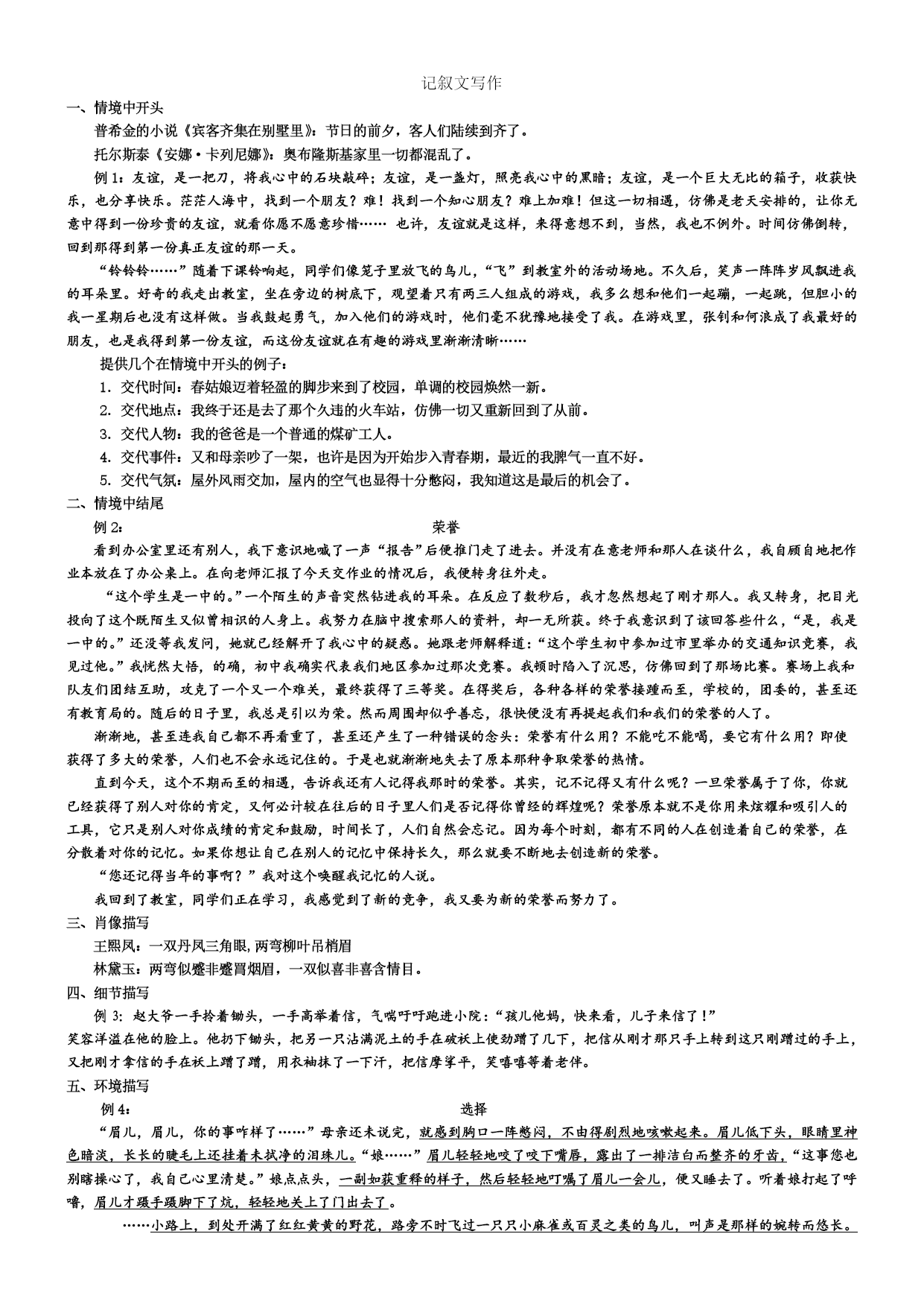 记叙文写作 一、情境中开头 普希金的小说《宾客齐集在别墅里》:节日的前夕,客人们陆续到齐了。 托尔斯泰《安娜·卡列尼娜》:奥布隆斯基家里一切都混乱了。 例1:友谊,是一把刀,将我心中的石块敲碎;友谊,是一盏灯,照亮我心中的黑暗;友谊,是一个巨大无比的箱子,收获快乐,也分享快乐。茫茫人海中,找到一个朋友?难!找到一个知心朋友?难上加难!但这一切相遇,仿佛是老天安排的,让你无意中得到一份珍贵的友谊,就看你愿不愿意珍惜……也许,友谊就是这样,来得意想不到,当然,我也不例外。时间仿佛倒转,回到那得到第一份真正友谊的那一天。 “铃铃铃……”随着下课铃响起,同学们像笼子里放飞的鸟儿,“飞”到教室外的活动场地。不久后,笑声一阵阵岁风飘进我的耳朵里。好奇的我走出教室,坐在旁边的树底下,观望着只有两三人组成的游戏,我多么想和他们一起蹦,一起跳,但HYPERLINK"http://www.so.com/s?q=%E8%83%86%E5%B0%8F%E7%9A%84%E6%88%91&ie=utf-8&src=wenda_link"\t"_blank"胆小的我一星期后也没有这样做。当我鼓起勇气,加入他们的游戏时,他们毫不犹豫地接受了我。在游戏里,张钊和何浪成了我最好的朋友,也是我得到第一份友谊,而这份友谊就在有趣的游戏里渐渐清晰…… 提供几个在情境中开头的例子: 1.交代时间:春姑娘迈着轻盈的脚步来到了校园,单调的校园焕然一新。 2.交代地点:我终于还是去了那个久违的火车站,仿佛一切又重新回到了从前。 3.交代人物:我的爸爸是一个普通的煤矿工人。 4.交代事件:又和母亲吵了一架,也许是因为开始步入青春期,最近的我脾气一直不好。 5.交代气氛:屋外风雨交加,屋内的空气也显得十分憋闷,我知道这是最后的机会了。 二、情境中结尾 例2:荣誉 看到办公室里还有别人,我下意识地喊了一声“报告”后便推门走了进去。并没有在意老师和那人在谈什么,我自顾自地把作业本放在了办公桌上。在向老师汇报了今天交作业的情况后,我便转身往外走。 “这个学生是一中的。”一个陌生的声音突然钻进我的耳朵。在反应了数秒后,我才忽然想起了刚才那人。我又转身,把目光投向了这个既陌生又似曾相识的人身上。我努力在脑中搜索那人的资料,却一无所获。终于我意识到了该回答些什么,“是,我是一中的。”还没等我发问,她就已经解开了我心中的疑惑。她跟老师解释道:“这个学生初中参加过市里举办的交通知识竞赛,我见过他。”我恍然大悟,的确,初中我确实代表我们地区参加过那次竞赛。我顿时陷入了沉思,仿佛回到了那场比赛。赛场上我和队友们团结互助,攻克了一个又一个难关,最终获得了三等奖。在得奖后,各种各样的荣誉接踵而至,学校的,团委的,甚至还有教育局的。随后的日子里,我总是引以为荣。然而周围却似乎善忘,很快便没有再提起我们和我们的荣誉的人了。 渐渐地,甚至连我自己都不再看重了,甚至还产生了一种错误的念头:荣誉有什么用?不能吃不能喝,要它有什么用?即使获得了多大的荣誉,人们也不会永远记住的。于是也就渐渐地失去了原本那种争取荣誉的热情。 直到今天,这个不期而至的相遇,告诉我还有人记得我那时的荣誉。其实,记不记得又有什么呢?一旦荣誉属于了你,你就已经获得了别人对你的肯定,又何必计较在往后的日子里人们是否记得你曾经的辉煌呢?荣誉原本就不是你用来炫耀和吸引人的工具,它只是别人对你成绩的肯定和鼓励,时间长了,人们自然会忘记。因为每个时刻,都有不同的人在创造着自己的荣誉,在分散着对你的记忆。如果你想让自己在别人的记忆中保持长久,那么就要不断地去创造新的荣誉。 “您还记得当年的事啊?”我对这个唤醒我记忆的人说。 我回到了教室,同学们正在学习,我感觉到了新的竞争,我又要为新的荣誉而努力了。 三、肖像描写 王熙凤:一双丹凤三角眼,两弯柳叶吊梢眉 林黛玉:两弯似蹙非蹙罥烟眉,一双似喜非喜含情目。 四、细节描写 例3:赵大爷一手拎着锄头,一手高举着信,气喘吁吁跑进小院:“孩儿他妈,快来看,儿子来信了!” 笑容洋溢在他的脸上。他扔下锄头,把另一只沾满泥土的手在破袄上使劲蹭了几下,把信从刚才那只手上转到这只刚蹭过的手上,又把刚才拿信的手在袄上蹭了蹭,用衣袖抹了一下汗,把信摩挲平,笑嘻嘻等着老伴。 五、环境描写 例4:选择 “眉儿,眉儿,你的事咋样了……”母亲还未说完,就感到胸口一阵憋闷,不由得剧烈地咳嗽起来。眉儿低下头,眼睛里神色暗淡,长长的睫毛上还挂着未拭净的泪珠儿。“娘……”眉儿轻轻地咬了咬下嘴唇,露出了一排洁白而整齐的牙齿,“这事您也别瞎操心了,我自己心里清楚。”娘点点头,一副如获重释的样子,然后轻轻地叮嘱了眉儿一会儿,便又睡去了。听着娘打起了呼噜,眉儿才蹑手蹑脚下了炕,轻轻地关上了门出去了。……小路上,到处开满了红红黄黄的野花,路旁不时飞