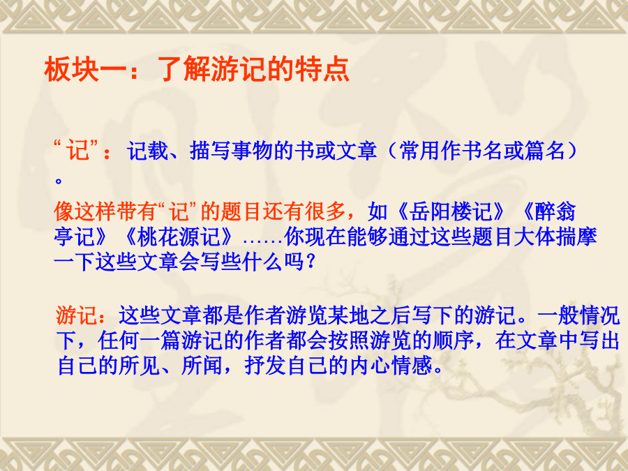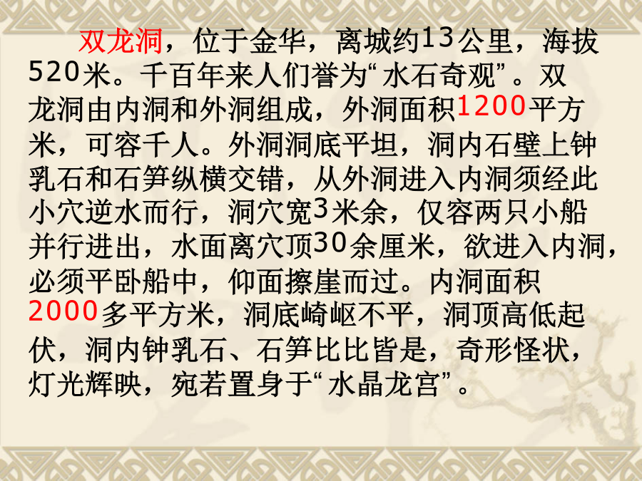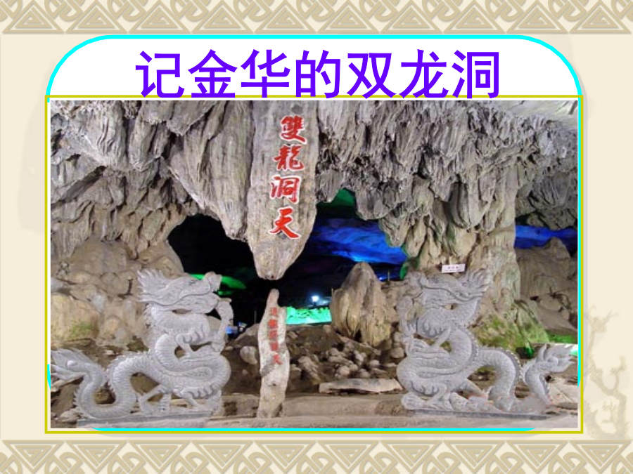 双龙洞,位于金华,离城约13公里,海拔520米。千百年来人们誉为“水石奇观”。双龙洞由内洞和外洞组成,外洞面积1200平方米,可容千人。外洞洞底平坦,洞内石壁上钟乳石和石笋纵横交错,从外洞进入内洞须经此小穴逆水而行,洞穴宽3米余,仅容两只小船并行进出,水面离穴顶30余厘米,欲进入内洞,必须平卧船中,仰面擦崖而过。内洞面积2000多平方米,洞底崎岖不平,洞顶高低起伏,洞内钟乳石、石笋比比皆是,奇形怪状,灯光辉映,宛若置身于“水晶龙宫”。“记”:记载、描写事物的书或文章(常用作书名或篇名)。原名叶绍钧,现代著名作家、教育家。主编过《文学周报》《小说月报》《中学生》等多种重要刊物。他是中国现代童话创作的拓荒者。代表作《稻草人》。本文节选自《小记十篇》中的《游了三个洞》。盘曲而上杜鹃油桐 一簇或浓或淡明艳溪流 时而突兀森郁聚集拥挤 孔隙并排仰卧臀部稍微 撞破一团漆黑额角 蜿蜒变化多端石笋石钟乳多音字qū(弯曲) 曲 qǔ(歌曲) diào(调子) 调 tiáo(调节)板块二:整体感知课文 学习指导: (1)自由朗读课文一遍,把自己喜欢的一个景点读给同桌听。请同桌对朗读做评价。 (2)独立完成补充习题一、二。 (3)默读课文,读完后用笔画出作者游览的景点。完成《补》三1学习指导: 1.默读第二、三自然段,从课文中标画出作者一路上看到的景物,及这些景物的特点,再体会一下作者看到这些学后有什么感受。 2.抓住景物特点的词有感情的朗读,读出感受。探究讨论1: 课题是《记金华的双龙洞》为什么要花费这么多笔墨去沿途景色呢?探究讨论2: 作者为什么要用一个自然段来写山中的一道溪流呢?双龙洞有是一番怎样的景象呢?下节课继续学习。作业设计: A:1.默写课文中的词语 2.回忆自己曾经的游玩过程,按照游览顺序编列一个写作提纲。 B:1.抄写课文中的词语三遍,再默写一遍。 2.读一篇游记,摘抄文中表示地点变化的句子,更好地体会怎样按照游览顺序写游记。自学指导: 1.轻声朗读第五自然段,用一个词形容孔隙的特点。 2.从课文中圈画表现孔隙窄小的重要的词句,在旁边写写自己的读书体会。 3.默读第五自然段,摘抄相关的句子,完成补充习题三2。透过这道习题,思考作者是怎样把由外洞进入内洞的过程一步一步说清楚的?眼前昏暗了,可是还能感觉左右和上方的山石似乎都在朝我挤压过来。我又感觉要是把头稍微抬起一点儿,准会撞破额角,擦伤鼻子。写游记时,不仅可以描写自己看到的内容表现景物特点,还可以通过描写自己的感受来表现景物的特点,这样,更能给人身临其境的感觉。根据提示练习背诵第五段: (1)怎样小的小船呢? (2)船的进出方式是: (3)乘船姿势: (4)通过空隙时的感受是:学习指导: 1.默读课文,思考:洞口、外洞、内洞各有什么特点?各用一两个词概括。 2.圈画出外洞、孔隙、内洞特点的词句,做一做批注。 3.感情朗读,读出景物的特点。写作层次--- 先写内洞又黑又大,再写洞顶的双龙,然后写石钟乳和石笋。这些石钟乳和石笋,形状变化多端,再加上颜色各异,即使不比作什么,也很值得观赏。这些石钟乳和石笋变化多端,颜色各异,有的像……有的像……,还有的像……真实太神奇了!黄龙海龟探险避水金针学习指导: 1.浏览课文,画出文中描写泉水的句子。 2.想一想,泉水流经的路线和作者的行踪有什么关系?作者是逆着泉水的流向往洞里深入。泉水就是作者写作的一条暗线。可见作者构思的巧妙。