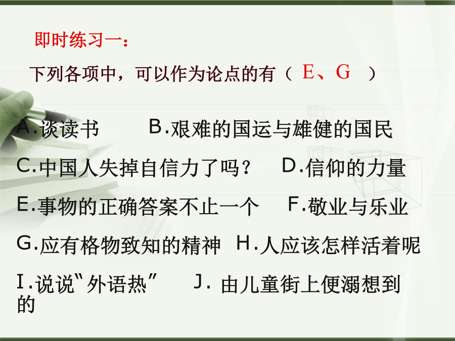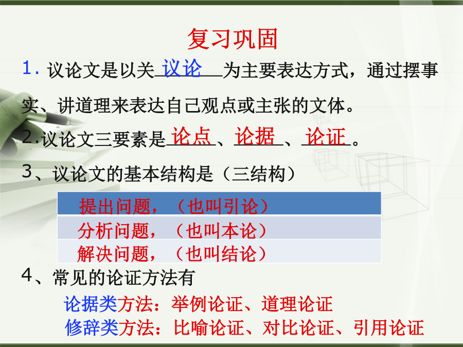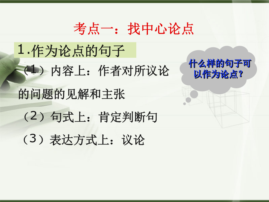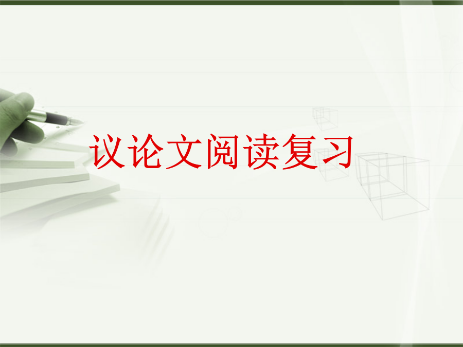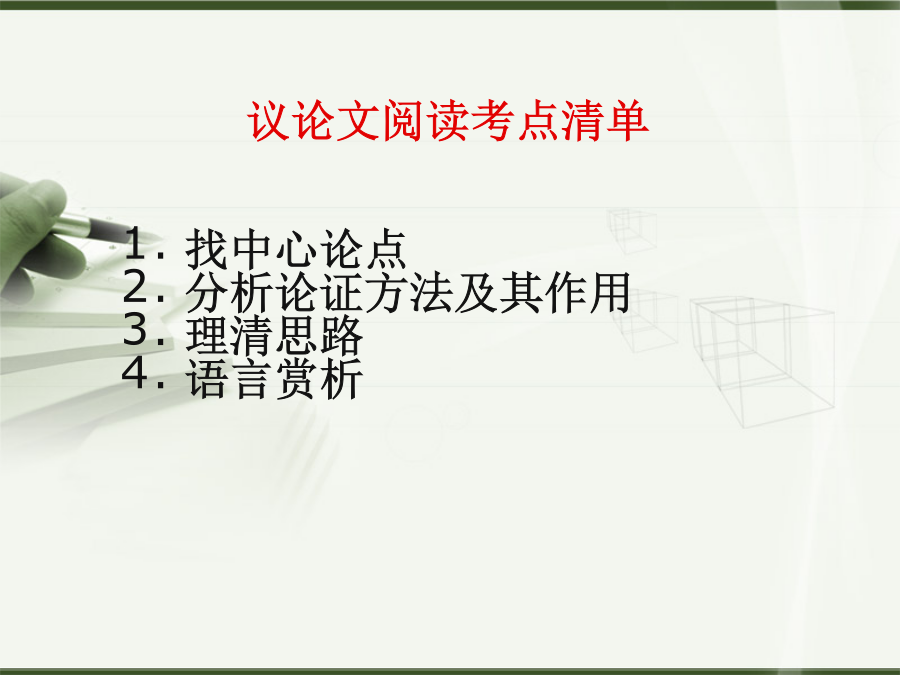 议论文阅读复习复习巩固议论文阅读考点清单考点一:找中心论点即时练习一:下列各项中,可以作为论点的有()温馨提示1:找论点的一般规律:考点一:找中心论点即时练习1.读《考标》P54(二)《学会舍弃》一文,找出全文的中心论点2.读P55《跟自己比》一文,找出全文的中心论点考点二:论证方法及其作用论证方法及作用答题模式即时练习:即时练习:即时练习:即时练习:5、文化相互凝视可以使双方找到并感受人类共通的良知、道德和美。在全球化的背景下,不同的文化取向之间常会有一些误解,但绝大多数不是恶意。国际社会对中国发展充满惊异和好奇,但普通外国民众对中国、特别是对当代中国社会真正的活力知之甚少。中国应该向世界打开自己,特别是最能触动人心灵的文学、文化的交往,这种沟通不是为了让人们变得相同,而是时为了理性平等地认识、欣赏并尊重彼此的不同论证方法及作用答题要点即时练习:论证方法及作用温馨提示4:分析论证方法及作用时要注意:阅读练习: 1、《掌声总在成功后》 2、《让人,乃众妙之门》