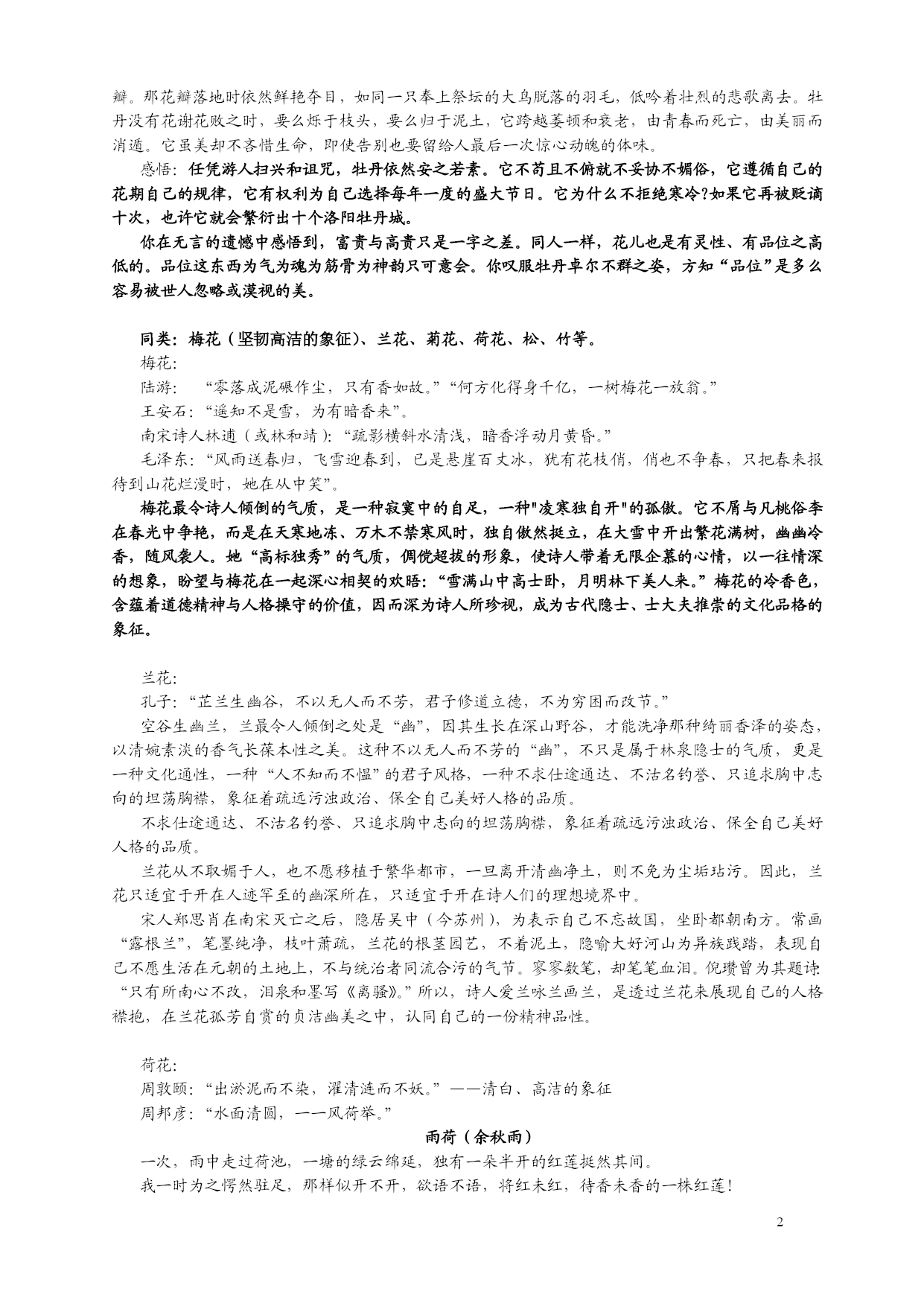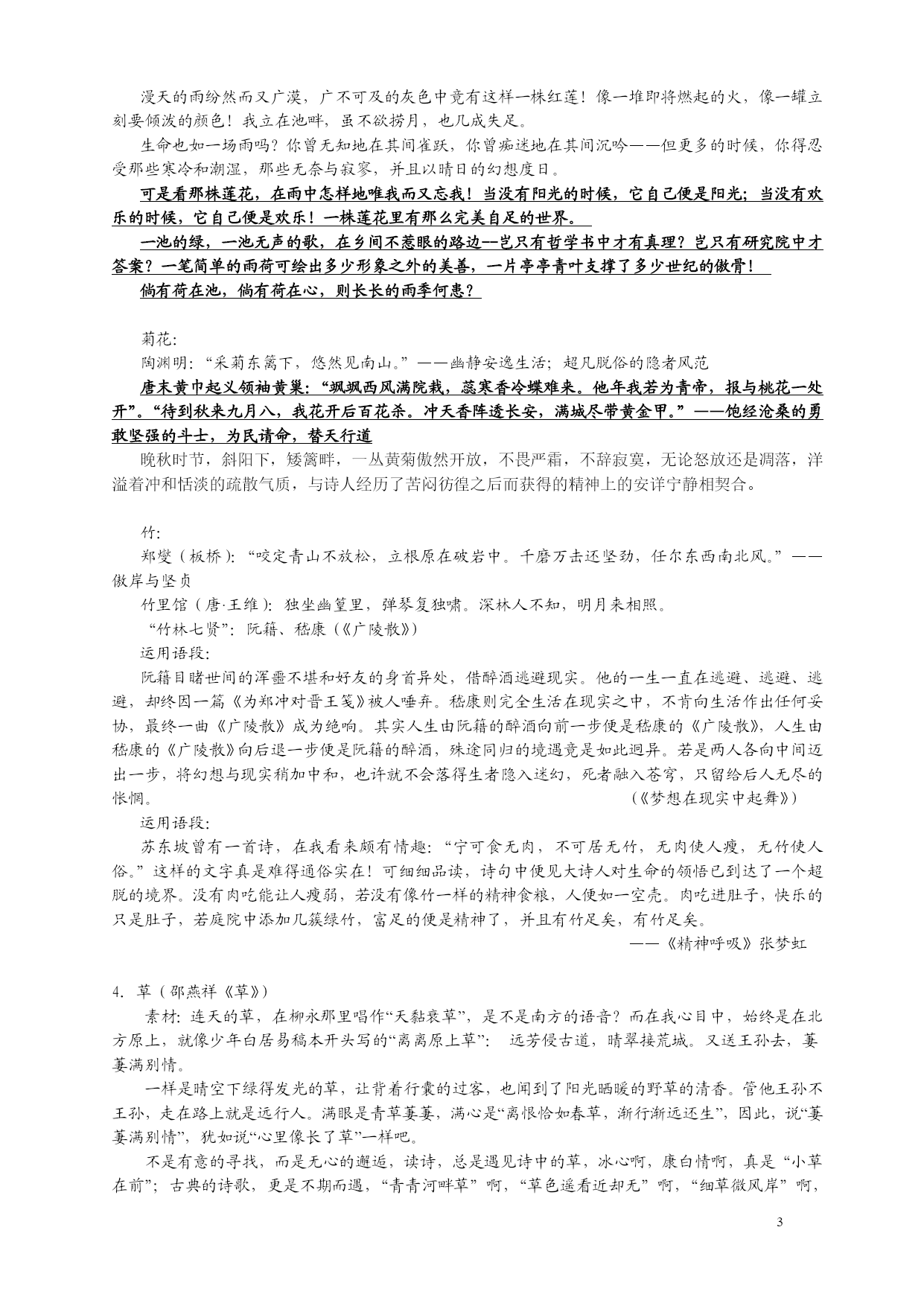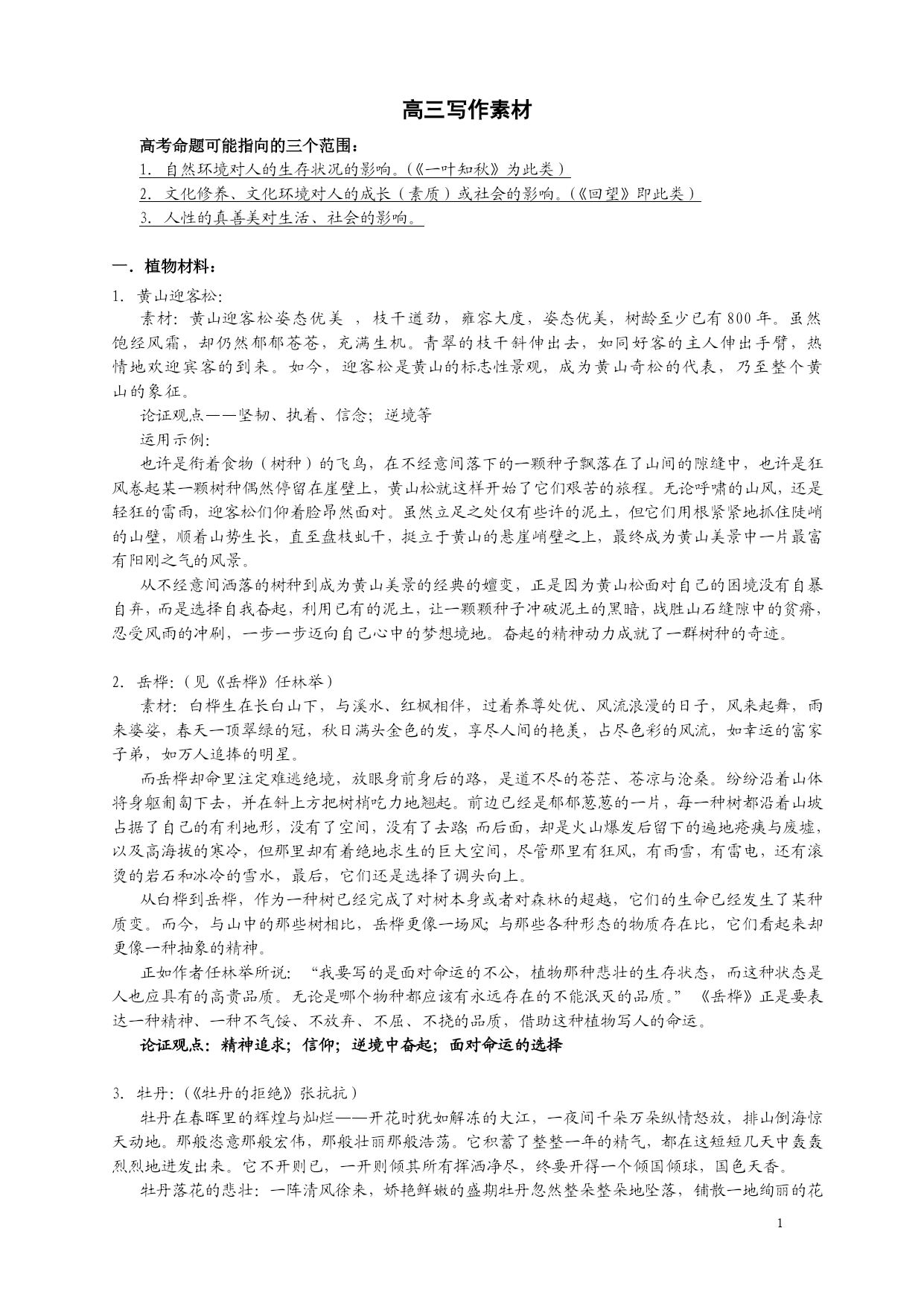 高三写作素材 高考命题可能指向的三个范围: 1.自然环境对人的生存状况的影响。(《一叶知秋》为此类) 2.文化修养、文化环境对人的成长(素质)或社会的影响。(《回望》即此类) 3.人性的真善美对生活、社会的影响。 一.植物材料: 1.黄山迎客松: 素材:黄山迎客松姿态优美,枝干遒劲,雍容大度,姿态优美,树龄至少已有800年。虽然饱经风霜,却仍然郁郁苍苍,充满生机。青翠的枝干斜伸出去,如同好客的主人伸出手臂,热情地欢迎宾客的到来。如今,迎客松是HYPERLINK"http://baike.baidu.com/view/2312.htm"\t"_blank"黄山的标志性景观,成为黄山奇松的代表,乃至整个黄山的象征。 论证观点——坚韧、执着、信念;逆境等 运用示例: 也许是衔着食物(树种)的飞鸟,在不经意间落下的一颗种子飘落在了山间的隙缝中,也许是狂风卷起某一颗树种偶然停留在崖壁上,黄山松就这样开始了它们艰苦的旅程。无论呼啸的山风,还是轻狂的雷雨,迎客松们仰着脸昂然面对。虽然立足之处仅有些许的泥土,但它们用根紧紧地抓住陡峭的山壁,顺着山势生长,直至盘枝虬干,挺立于黄山的悬崖峭壁之上,最终成为黄山美景中一片最富有阳刚之气的风景。 从不经意间洒落的树种到成为黄山美景的经典的嬗变,正是因为黄山松面对自己的困境没有自暴自弃,而是选择自我奋起,利用已有的泥土,让一颗颗种子冲破泥土的黑暗,战胜山石缝隙中的贫瘠,忍受风雨的冲刷,一步一步迈向自己心中的梦想境地。奋起的精神动力成就了一群树种的奇迹。 2.岳桦:(见《岳桦》任林举) 素材:白桦生在长白山下,与溪水、红枫相伴,过着养尊处优、风流浪漫的日子,风来起舞,雨来婆娑,春天一顶翠绿的冠,秋日满头金色的发,享尽人间的艳羡,占尽色彩的风流,如幸运的富家子弟,如万人追捧的明星。 而岳桦却命里注定难逃绝境,放眼身前身后的路,是道不尽的苍茫、苍凉与沧桑。纷纷沿着山体将身躯匍匐下去,并在斜上方把树梢吃力地翘起。前边已经是郁郁葱葱的一片,每一种树都沿着山坡占据了自己的有利地形,没有了空间,没有了去路;而后面,却是火山爆发后留下的遍地疮痍与废墟,以及高海拔的寒冷,但那里却有着绝地求生的巨大空间,尽管那里有狂风,有雨雪,有雷电,还有滚烫的岩石和冰冷的雪水,最后,它们还是选择了调头向上。 从白桦到岳桦,作为一种树已经完成了对树本身或者对森林的超越,它们的生命已经发生了某种质变。而今,与山中的那些树相比,岳桦更像一场风;与那些各种形态的物质存在比,它们看起来却更像一种抽象的精神。 正如作者任林举所说:“我要写的是面对命运的不公,植物那种悲壮的生存状态,而这种状态是人也应具有的高贵品质。无论是哪个物种都应该有永远存在的不能泯灭的品质。”《岳桦》正是要表达一种精神、一种不气馁、不放弃、不屈、不挠的品质,借助这种植物写人的命运。 论证观点:精神追求;信仰;逆境中奋起;面对命运的选择 3.牡丹:(《牡丹的拒绝》张抗抗) 牡丹在春晖里的辉煌与灿烂——开花时犹如解冻的大江,一夜间千朵万朵纵情怒放,排山倒海惊天动地。那般恣意那般宏伟,那般壮丽那般浩荡。它积蓄了整整一年的精气,都在这短短几天中轰轰烈烈地进发出来。它不开则已,一开则倾其所有挥洒净尽,终要开得一个倾国倾球,国色天香。 牡丹落花的悲壮:一阵清风徐来,娇艳鲜嫩的盛期牡丹忽然整朵整朵地坠落,铺散一地绚丽的花瓣。那花瓣落地时依然鲜艳夺目,如同一只奉上祭坛的大鸟脱落的羽毛,低吟着壮烈的悲歌离去。牡丹没有花谢花败之时,要么烁于枝头,要么归于泥土,它跨越萎顿和衰老,由青春而死亡,由美丽而消遁。它虽美却不吝惜生命,即使告别也要留给人最后一次惊心动魄的体味。 感悟:任凭游人扫兴和诅咒,牡丹依然安之若素。它不苟且不俯就不妥协不媚俗,它遵循自己的花期自己的规律,它有权利为自己选择每年一度的盛大节日。它为什么不拒绝寒冷?如果它再被贬谪十次,也许它就会繁衍出十个洛阳牡丹城。 你在无言的遗憾中感悟到,富贵与高贵只是一字之差。同人一样,花儿也是有灵性、有品位之高低的。品位这东西为气为魂为筋骨为神韵只可意会。你叹服牡丹卓尔不群之姿,方知“品位”是多么容易被世人忽略或漠视的美。 同类:梅花(坚韧高洁的象征)、兰花、菊花、荷花、松、竹等。 梅花: 陆游:“零落成泥碾作尘,只有香如故。”“何方化得身千亿,一树梅花一放翁。” 王安石:“遥知不是雪,为有暗香来”。 南宋诗人林逋(或林和靖):“疏影横斜水清浅,暗香浮动月黄昏。” 毛泽东:“风雨送春归,飞雪迎春到,已是悬崖百丈冰,犹有花枝俏,俏也不争春,只把春来报待到山花烂漫时,她在从中笑”。 梅花最令诗人倾倒的气质,是一种寂寞中的自足,一种"凌寒独自开"的孤傲。它不屑与凡桃俗李在春光中争艳,而是在天寒地冻、万木不禁寒风时,独自傲然挺立,在大雪