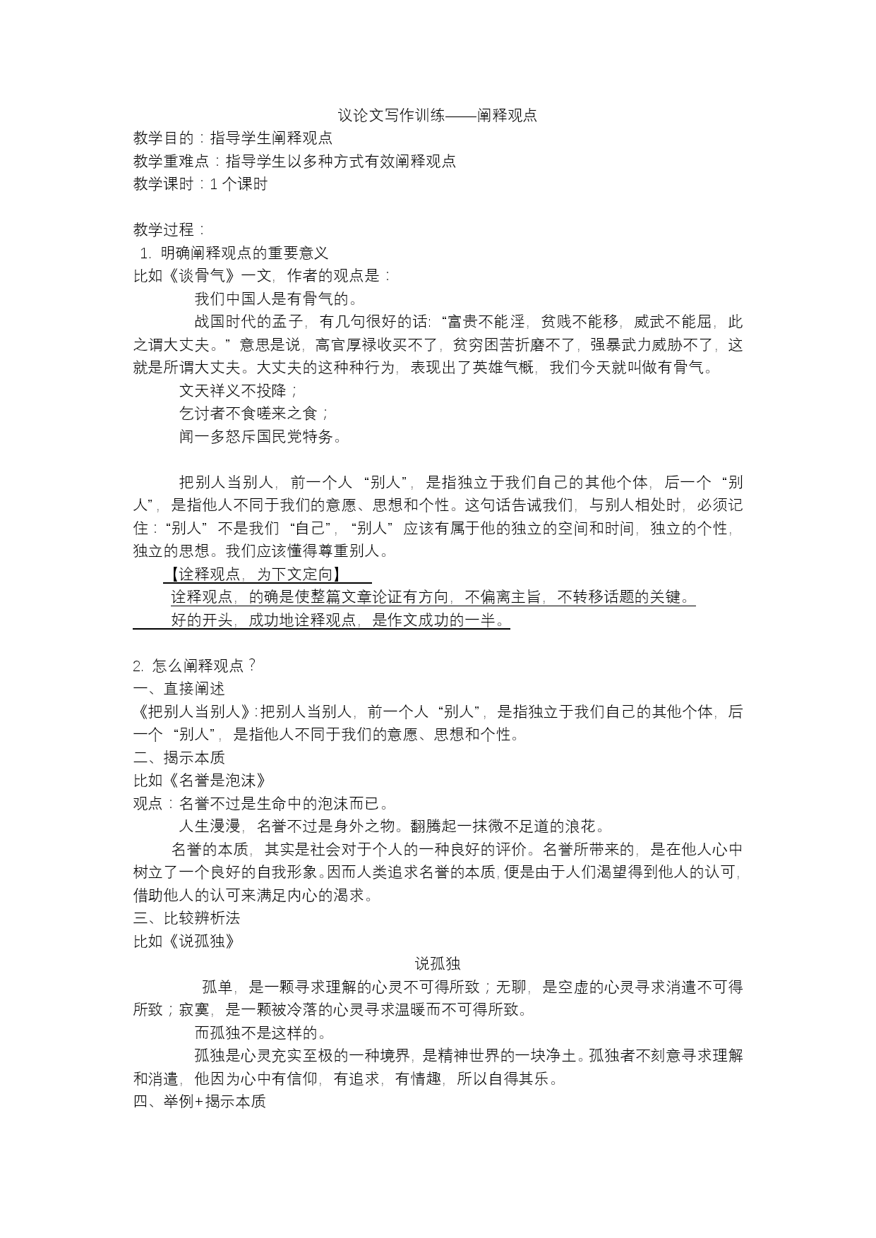 议论文写作训练——阐释观点 教学目的:指导学生阐释观点 教学重难点:指导学生以多种方式有效阐释观点 教学课时:1个课时 教学过程: 1.明确阐释观点的重要意义 比如《谈骨气》一文,作者的观点是: 我们中国人是有骨气的。 战国时代的孟子,有几句很好的话:“富贵不能淫,贫贱不能移,威武不能屈,此之谓大丈夫。”意思是说,高官厚禄收买不了,贫穷困苦折磨不了,强暴武力威胁不了,这就是所谓大丈夫。大丈夫的这种种行为,表现出了英雄气概,我们今天就叫做有骨气。 文天祥义不投降; 乞讨者不食嗟来之食; 闻一多怒斥国民党特务。 把别人当别人,前一个人“别人”,是指独立于我们自己的其他个体,后一个“别人”,是指他人不同于我们的意愿、思想和个性。这句话告诫我们,与别人相处时,必须记住:“别人”不是我们“自己”,“别人”应该有属于他的独立的空间和时间,独立的个性,独立的思想。我们应该懂得尊重别人。 【诠释观点,为下文定向】 诠释观点,的确是使整篇文章论证有方向,不偏离主旨,不转移话题的关键。 好的开头,成功地诠释观点,是作文成功的一半。 2.怎么阐释观点? 一、直接阐述 《把别人当别人》:把别人当别人,前一个人“别人”,是指独立于我们自己的其他个体,后一个“别人”,是指他人不同于我们的意愿、思想和个性。 二、揭示本质 比如《名誉是泡沫》 观点:名誉不过是生命中的泡沫而已。 人生漫漫,名誉不过是身外之物。翻腾起一抹微不足道的浪花。 名誉的本质,其实是社会对于个人的一种良好的评价。名誉所带来的,是在他人心中树立了一个良好的自我形象。因而人类追求名誉的本质,便是由于人们渴望得到他人的认可,借助他人的认可来满足内心的渴求。 三、比较辨析法 比如《说孤独》 说孤独 孤单,是一颗寻求理解的心灵不可得所致;无聊,是空虚的心灵寻求消遣不可得所致;寂寞,是一颗被冷落的心灵寻求温暖而不可得所致。 而孤独不是这样的。 孤独是心灵充实至极的一种境界,是精神世界的一块净土。孤独者不刻意寻求理解和消遣,他因为心中有信仰,有追求,有情趣,所以自得其乐。 四、举例+揭示本质 所谓“无规矩不成方圆”。这个圆使我想到了循规蹈矩,稳定,规范。有人认为这样就是死板,有人却偏爱这个图形,认为这才是个性张扬。 什么是个性张扬呢?周杰伦手舞双节棍唱着“哼哼哈嘿”是一种个性;女子十二乐坊站着拉二胡是一种个性;梵高的《向日葵》又是另外一种个性⋯⋯ 其实,个性就是展现与众不同的风格,展现与众不同的才华,展现与众不同的见解。 个性的特点是“与众不同”,个性张扬的核心是有真风采,有真才华,有真见解。它不同于…… 不同于刻意标新立异以哗众取宠; 五、比喻阐释法 比如《也要学会的另一课》 学会认输,就是摸到一手臭牌,要懂得放下重来;学会认输,就是掉进泥塘里了,要知道爬出来;学会认输,就是上错了车之后要知道及时下来。