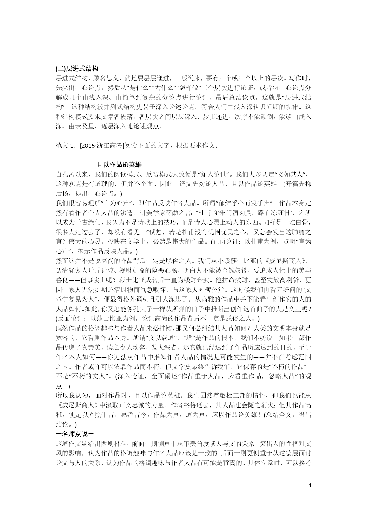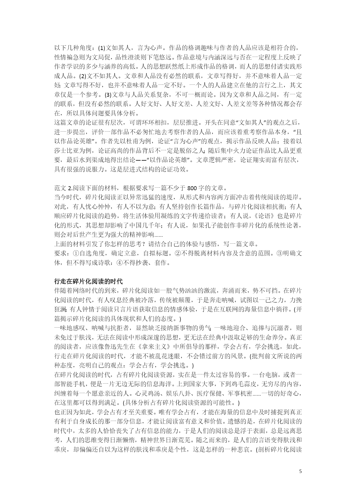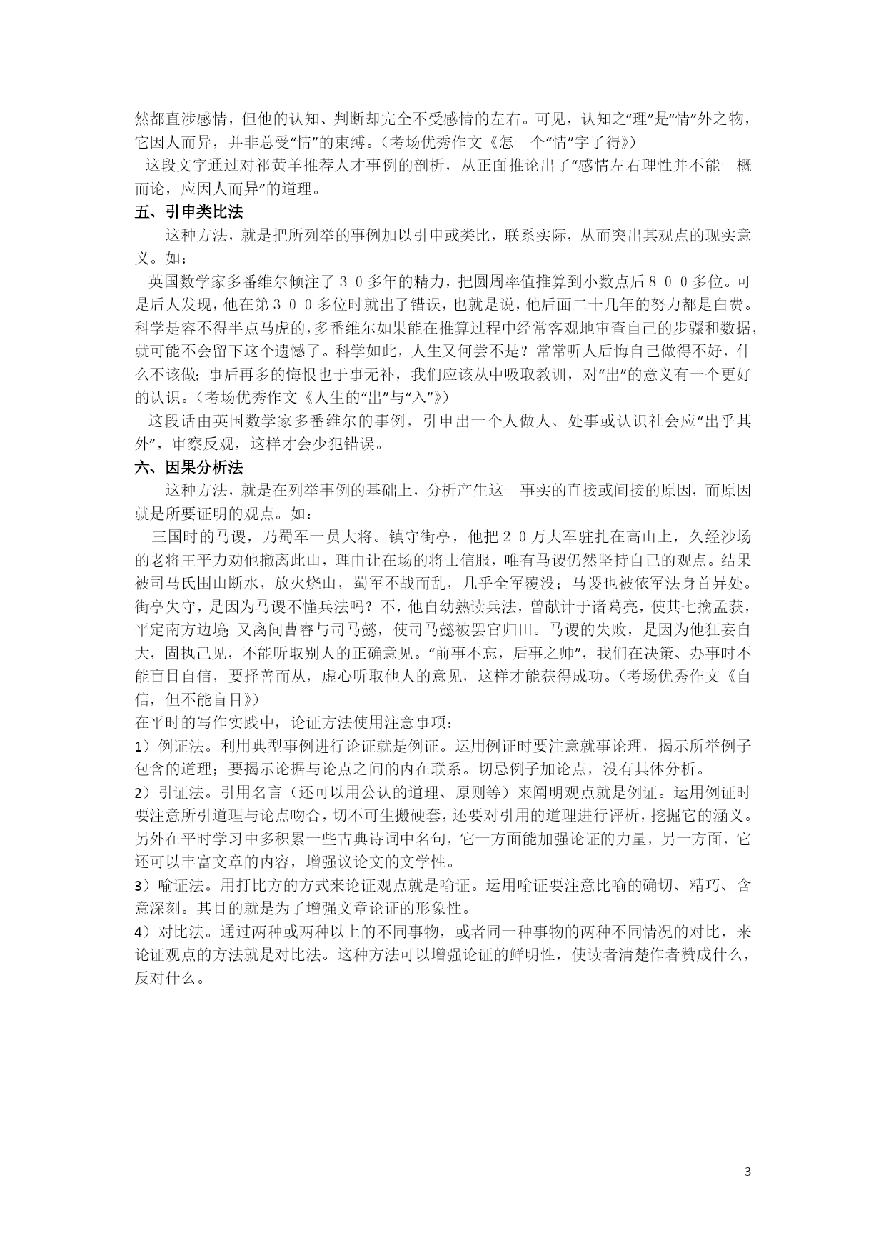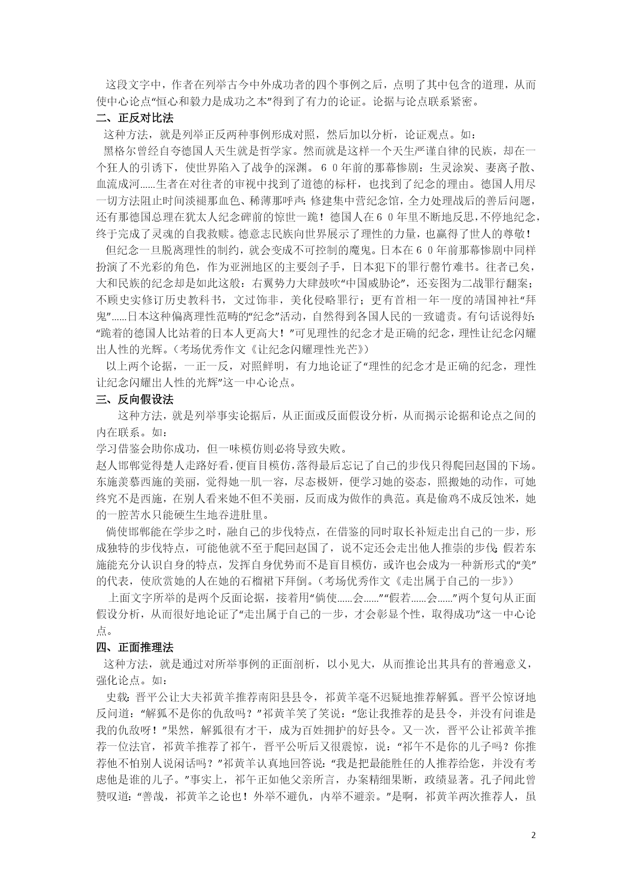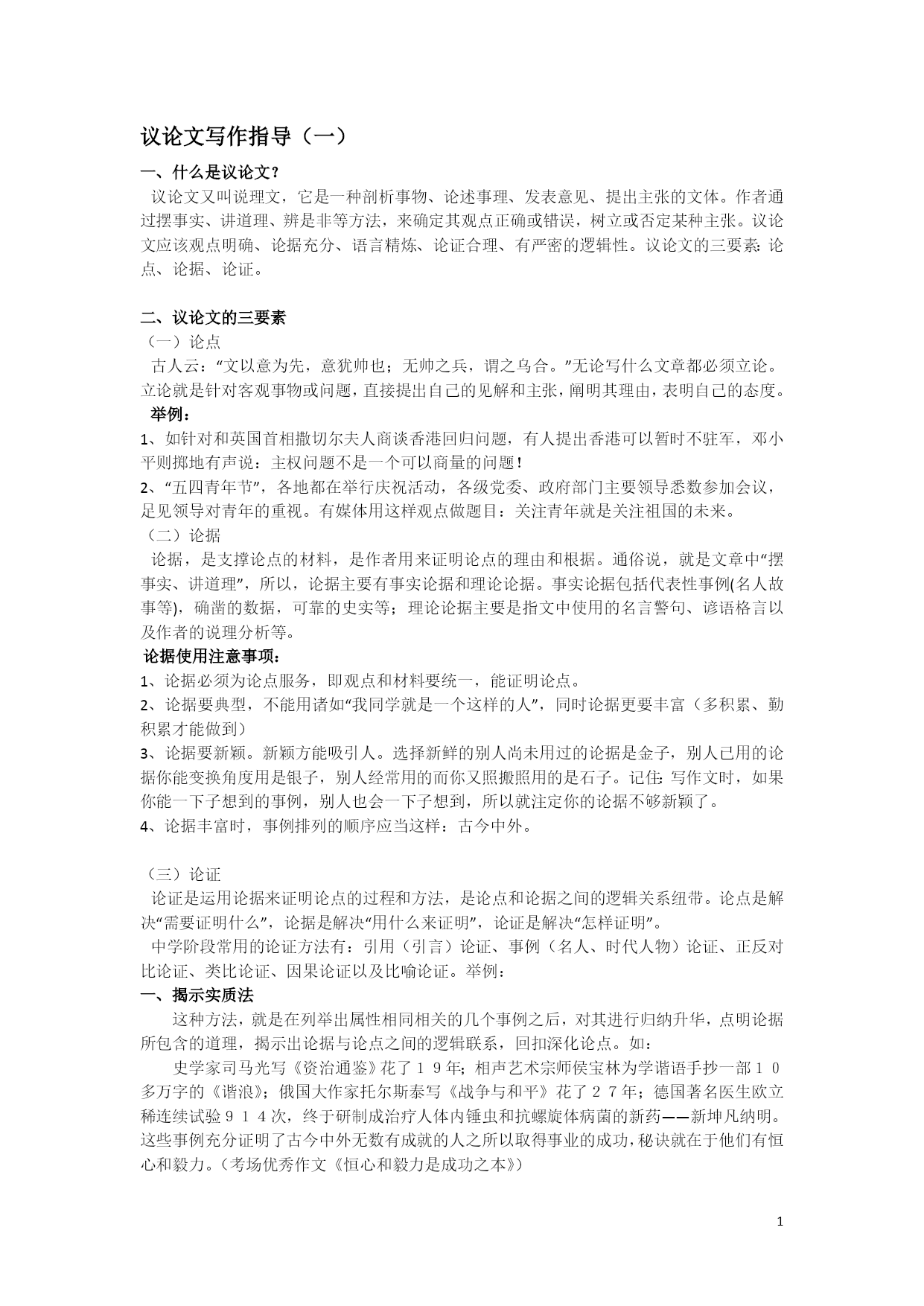 议论文写作指导(一) 一、什么是议论文? 议论文又叫说理文,它是一种剖析事物、论述事理、发表意见、提出主张的文体。作者通过摆事实、讲道理、辨是非等方法,来确定其观点正确或错误,树立或否定某种主张。议论文应该观点明确、论据充分、语言精炼、论证合理、有严密的逻辑性。议论文的三要素:论点、论据、论证。 二、议论文的三要素 (一)论点 古人云:“文以意为先,意犹帅也;无帅之兵,谓之乌合。”无论写什么文章都必须立论。立论就是针对客观事物或问题,直接提出自己的见解和主张,阐明其理由,表明自己的态度。 举例: 1、如针对和英国首相撒切尔夫人商谈香港回归问题,有人提出香港可以暂时不驻军,邓小平则掷地有声说:主权问题不是一个可以商量的问题! 2、“五四青年节”,各地都在举行庆祝活动,各级党委、政府部门主要领导悉数参加会议,足见领导对青年的重视。有媒体用这样观点做题目:关注青年就是关注祖国的未来。 (二)论据 论据,是支撑论点的材料,是作者用来证明论点的理由和根据。通俗说,就是文章中“摆事实、讲道理”,所以,论据主要有事实论据和理论论据。事实论据包括代表性事例(名人故事等),确凿的数据,可靠的史实等;理论论据主要是指文中使用的名言警句、谚语格言以及作者的说理分析等。 论据使用注意事项: 1、论据必须为论点服务,即观点和材料要统一,能证明论点。 2、论据要典型,不能用诸如“我同学就是一个这样的人”,同时论据更要丰富(多积累、勤积累才能做到) 3、论据要新颖。新颖方能吸引人。选择新鲜的别人尚未用过的论据是金子,别人已用的论据你能变换角度用是银子,别人经常用的而你又照搬照用的是石子。记住:写作文时,如果你能一下子想到的事例,别人也会一下子想到,所以就注定你的论据不够新颖了。 4、论据丰富时,事例排列的顺序应当这样:古今中外。 (三)论证 论证是运用论据来证明论点的过程和方法,是论点和论据之间的逻辑关系纽带。论点是解决“需要证明什么”,论据是解决“用什么来证明”,论证是解决“怎样证明”。 中学阶段常用的论证方法有:引用(引言)论证、事例(名人、时代人物)论证、正反对比论证、类比论证、因果论证以及比喻论证。举例: 一、揭示实质法 这种方法,就是在列举出属性相同相关的几个事例之后,对其进行归纳升华,点明论据所包含的道理,揭示出论据与论点之间的逻辑联系,回扣深化论点。如: 史学家司马光写《资治通鉴》花了19年;相声艺术宗师侯宝林为学谐语手抄一部10多万字的《谐浪》;俄国大作家托尔斯泰写《战争与和平》花了27年;德国著名医生欧立稀连续试验914次,终于研制成治疗人体内锤虫和抗螺旋体病菌的新药——新坤凡纳明。这些事例充分证明了古今中外无数有成就的人之所以取得事业的成功,秘诀就在于他们有恒心和毅力。(考场优秀作文《恒心和毅力是成功之本》) 这段文字中,作者在列举古今中外成功者的四个事例之后,点明了其中包含的道理,从而使中心论点“恒心和毅力是成功之本”得到了有力的论证。论据与论点联系紧密。 二、正反对比法 这种方法,就是列举正反两种事例形成对照,然后加以分析,论证观点。如: 黑格尔曾经自夸德国人天生就是哲学家。然而就是这样一个天生严谨自律的民族,却在一个狂人的引诱下,使世界陷入了战争的深渊。60年前的那幕惨剧:生灵涂炭、妻离子散、血流成河……生者在对往者的审视中找到了道德的标杆,也找到了纪念的理由。德国人用尽一切方法阻止时间淡褪那血色、稀薄那呼声:修建集中营纪念馆,全力处理战后的善后问题,还有那德国总理在犹太人纪念碑前的惊世一跪!德国人在60年里不断地反思,不停地纪念,终于完成了灵魂的自我救赎。德意志民族向世界展示了理性的力量,也赢得了世人的尊敬! 但纪念一旦脱离理性的制约,就会变成不可控制的魔鬼。日本在60年前那幕惨剧中同样扮演了不光彩的角色,作为亚洲地区的主要刽子手,日本犯下的罪行罄竹难书。往者已矣,大和民族的纪念却是如此这般:右翼势力大肆鼓吹“中国威胁论”,还妄图为二战罪行翻案;不顾史实修订历史教科书,文过饰非,美化侵略罪行;更有首相一年一度的靖国神社“拜鬼”……日本这种偏离理性范畴的“纪念”活动,自然得到各国人民的一致谴责。有句话说得好:“跪着的德国人比站着的日本人更高大!”可见理性的纪念才是正确的纪念,理性让纪念闪耀出人性的光辉。(考场优秀作文《让纪念闪耀理性光芒》) 以上两个论据,一正一反,对照鲜明,有力地论证了“理性的纪念才是正确的纪念,理性让纪念闪耀出人性的光辉”这一中心论点。 三、反向假设法 这种方法,就是列举事实论据后,从正面或反面假设分析,从而揭示论据和论点之间的内在联系。如: 学习借鉴会助你成功,但一味模仿则必将导致失败。 赵人邯郸觉得楚人走路好看,便盲目模仿,落得最后忘记了自己的步伐只得爬回赵国的下场。东施羡慕西施的美丽,觉得她一