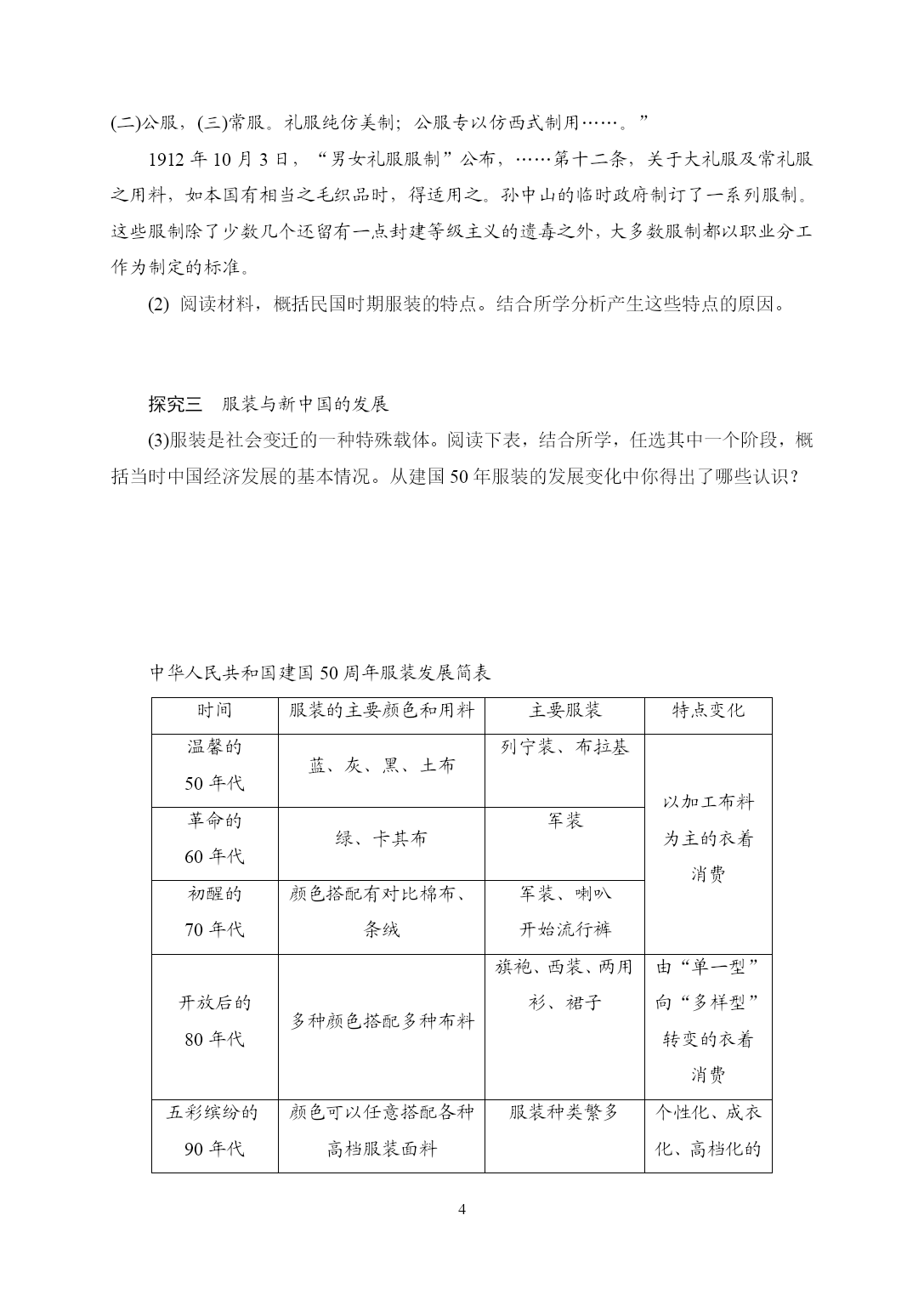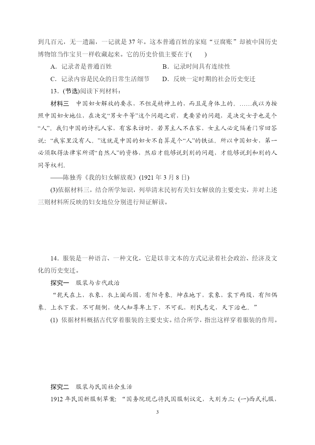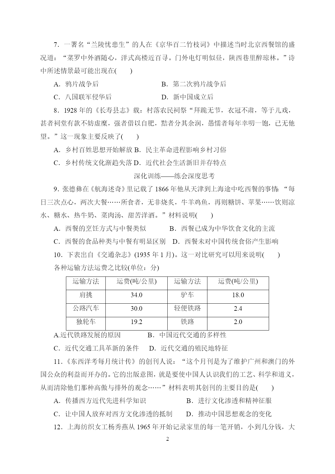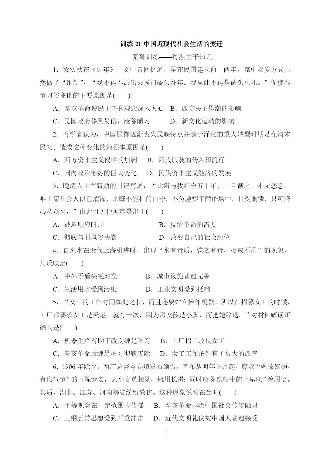 训练21中国近现代社会生活的变迁 基础训练——练熟主干知识 1.梁实秋在《过年》一文中曾回忆道,早在民国建立前一两年,家中除岁方式已然做了“维新”。“我不再奉派出去挨门磕头拜年。我从此不再是磕头虫儿。”促使春节习俗变化的主要原因是() A.辛亥革命使民主共和观念深入人心B.西方民主思潮的影响 C.民国政府移风易俗,废除陋习D.新文化运动的影响 2.有学者认为,中国服饰逐渐丧失民族特点并趋于洋化的重大转型时期是在清末民初。造成这种变化的最根本原因是() A.西方资本主义侵略的加剧B.西式服装的传入和流行 C.国内政治形势的巨大变化D.民族资本主义经济的发展 3.晚清人士恽毓鼎的日记写道:“此辫与我相守五十年,一旦截之,不无恋恋。唯上流社会人俱已濯濯,余既不能杜门自守,不免驰骤于酹酢场中,日受刺激,只可降心从众矣。”由此可见他剪辫是出于() A.被迫顺应时局 B.反清革命的需要 C.彻底与旧风俗决裂 D.改变自己的社会地位 4.自来水在近代上海引进时,出现“水有毒质,饮之有毒,相戒不用”的现象,其反映出() A.中外矛盾尖锐对立 B.城市设施普遍完善 C.生活用水受到污染 D.工业文明受到抵制 5.“女工的工作时间如此之长,而且还要站立操作机器,所以在招募女工的时候,工厂都要求女工是天足。就有一次,因为那女孩是小脚,而把她辞退。”对材料解读正确的是() A.机器生产有助于改变缠足陋习B.工厂招工歧视女工 C.辛亥革命后缠足陋习彻底废除D.女工工作条件有了很大的改善 6.1906年除夕,两广总督岑春煊发布谕告,宣布从明年正月起,废除“婢膝奴颜,有伤气节”的下跪请安,大小官员相见,概用长揖;同时废除禀帖中的“卑职”等用语。其后,湖北、江苏、河南等省纷纷效仿。这种现象说明在当时() A.平等观念在一定范围内传播B.辛亥革命革除中国社会传统陋习 C.三纲五常思想受到严重冲击D.近代文明礼仪被中国人普遍接受 7.一署名“兰陵忧患生”的人在《京华百二竹枝词》中描述当时北京西餐馆的盛况道:“菜罗中外酒随心,洋式高楼近百寻。门外电灯明似昼,陕西巷里醉琼林。”诗中所述情景最可能出现在() A.鸦片战争后 B.第二次鸦片战争后 C.八国联军侵华后 D.新中国成立后 8.1928年的《长寿县志》载:村落农民祠祭“拜跪无节,衣冠不肃,等于儿戏,甚者祠堂有款不妨虚糜,强者借以自肥,黠者分其余润,愚懦者每年幸叨一饱,已无他望。”这一现象主要反映了() A.乡村百姓思想开始解放B.民主革命进程影响乡村习俗 C.乡村传统文化渐趋失落D.近代社会生活新旧并存特点 深化训练——练会深度思考 9.张德彝在《航海述奇》里记载了1866年他从天津到上海途中吃西餐的事情:“每日三次点心,两次大餐……所食者,无非烧炙,牛羊鸡鱼,再则糖饼、苹果……饮则凉水、糖水、热牛奶、菜肉汤、甜苦洋酒。”材料说明() A.西餐的烹饪方式与中餐类似B.西餐已成为中华饮食文化的主流 C.西餐的食品种类与中餐有明显区别D.西餐未对中国传统食俗产生影响 10.下表出自《交通杂志》(1935年1月)。这一对比研究可以用来说明() 各种运输方法运费之比较(单位:分) 运输方法运费(吨/公里)运输方法运费(吨/公里)肩挑34.0驴车18.0公路汽车30.0轻便铁路2.4独轮车19.2铁路2.0A.近代铁路发展的原因B.中国近代交通的多样性 C.近代交通工具革新的条件D.近代交通的殖民地特征 11.《东西洋考每月统计传》的创刊人说:“这个月刊是为了维护广州和澳门的外国公众的利益而开办的。它的出版意图,就是要使中国人认识我们的工艺、科学和道义,从而清除他们那种高傲与排外的观念……”材料表明其创刊的主要目的是() A.传播西方近代先进科学知识B.进行文化渗透和精神征服 C.让中国人放弃对西方文化渗透的抵制D.推动中国思想观念的变化 12.上海纺织女工杨秀燕从1965年开始记录家里的每一笔开销,小到几分钱,大到几百元,无一遗漏,一记就是37年。这本普通百姓的家庭“豆腐账”却被中国历史博物馆当作宝贝一样收藏起来。它的历史价值主要在于() A.记录者是普通百姓B.记录时间具有连续性 C.记录内容是民众的日常生活细节D.反映一定时期的社会历史变迁 13.(节选)阅读下列材料: 材料三中国妇女解放的要求,不但是精神上的,而且是身体上的。……我以为按照中国妇女地位,在决定“男女平等”这个问题之前,更要紧的问题,是决定女子也是个“人”。我们中国的诗礼人家,有客来访时,若男主人不在家,女主人必定隔着门帘回答说:“我家里没有人。”这就是中国的妇女不自算是个“人”的铁证。所以中国妇女,第一必须取得法律家所谓“自然人”的资格,然后才能够说到别的问题,才能够说到和别的人同等权利。 ——陈独秀《我的妇