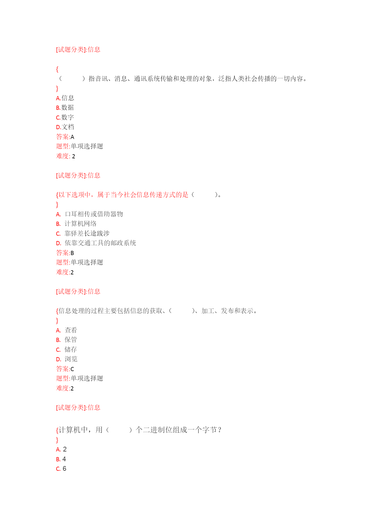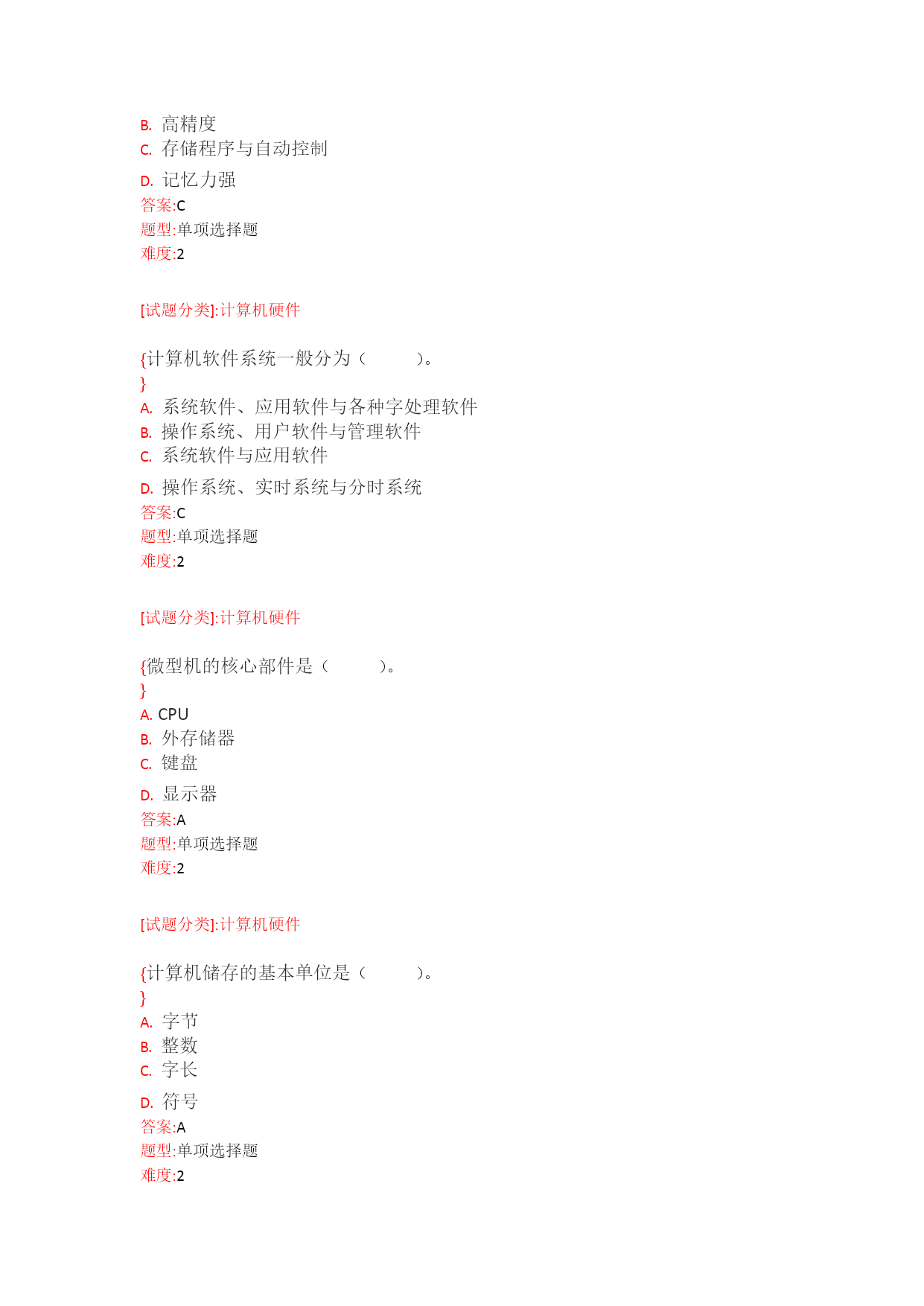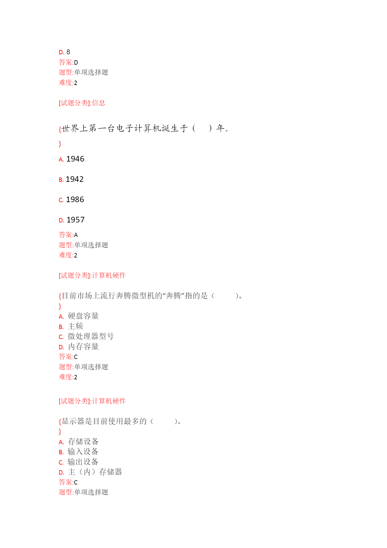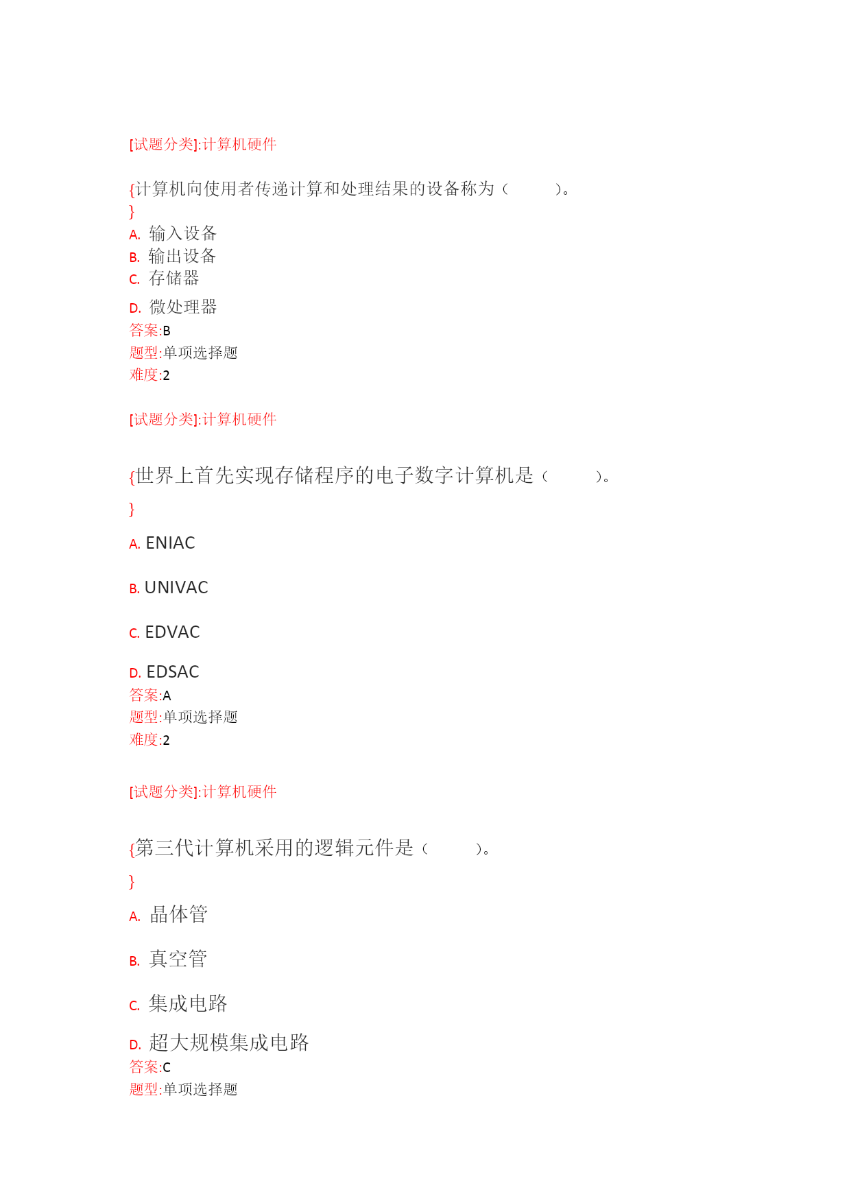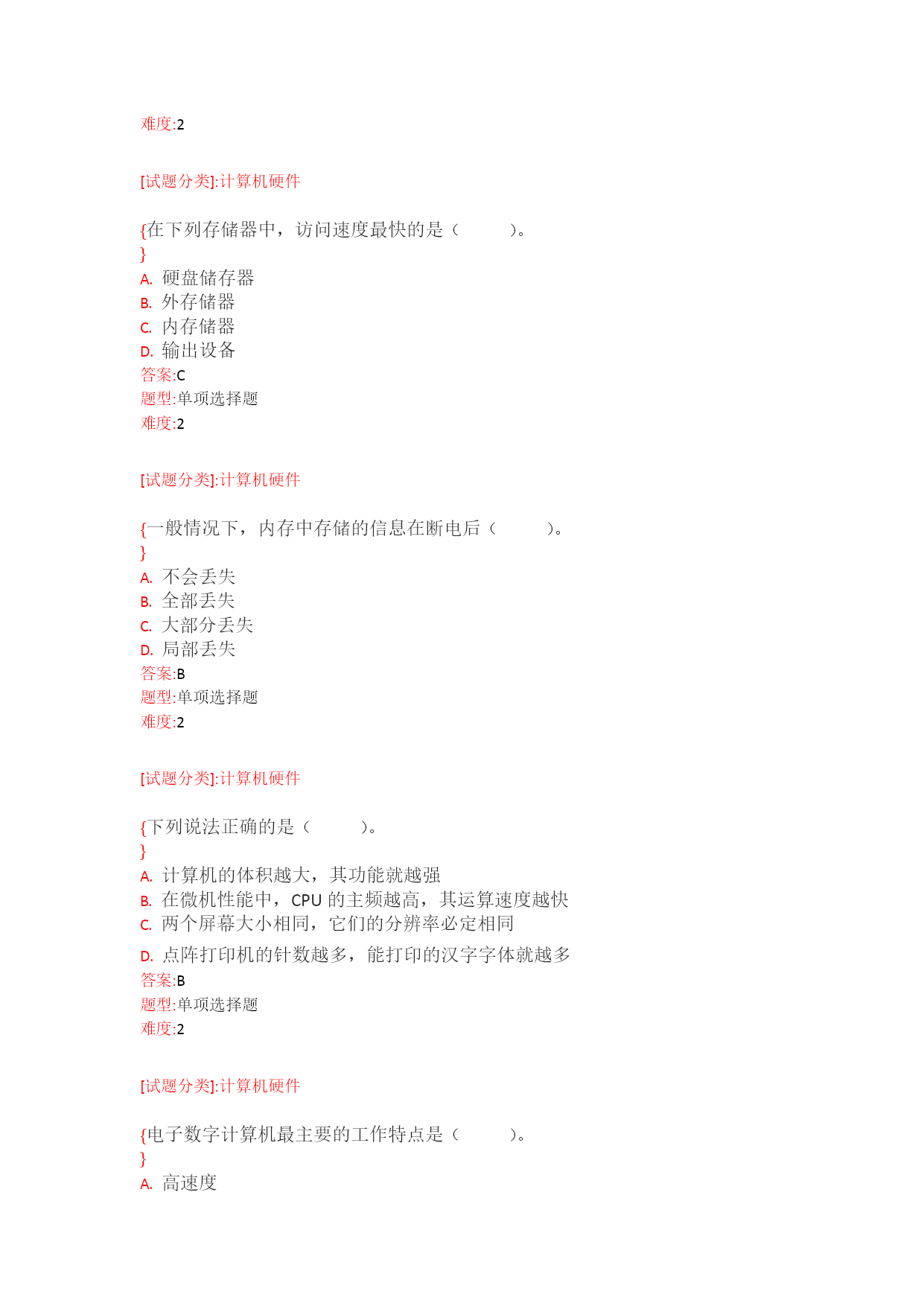 [试题分类]:信息 { ()指HYPERLINK"http://baike.baidu.com/view/1469390.htm"\t"_blank"音讯、HYPERLINK"http://baike.baidu.com/subview/89742/13091322.htm"\t"_blank"消息、HYPERLINK"http://baike.baidu.com/view/20429.htm"\t"_blank"通讯系统传输和HYPERLINK"http://baike.baidu.com/view/989420.htm"\t"_blank"处理的对象,泛指人类社会HYPERLINK"http://baike.baidu.com/view/69730.htm"\t"_blank"传播的一切HYPERLINK"http://baike.baidu.com/view/748656.htm"\t"_blank"内容。 } A.HYPERLINK"http://baike.baidu.com/view/1527.htm"\t"_blank"信息 B.数据 C.数字 D.文档 答案:A 题型:单项选择题 难度:2 [试题分类]:信息 {以下选项中,属于当今社会信息传递方式的是()。 } A.口耳相传或借助器物 B.计算机网络 C.靠驿差HYPERLINK"http://baike.baidu.com/view/626481.htm"\t"_blank"长途跋涉 D.依靠交通工具的邮政系统 答案:B 题型:单项选择题 难度:2 [试题分类]:信息 {信息处理的过程主要包括信息的获取、()、加工、发布和表示。 } A.查看 B.保管 C.储存 D.浏览 答案:C 题型:单项选择题 难度:2 [试题分类]:信息 {计算机中,用()个二进制位组成一个字节? } A.2 B.4 C.6 D.8 答案:D 题型:单项选择题 难度:2 [试题分类]:信息 {世界上第一台电子计算机诞生于()年。 } A.1946 B.1942 C.1986 D.1957 答案:A 题型:单项选择题 难度:2 [试题分类]:计算机硬件 {目前市场上流行奔腾微型机的“奔腾”指的是()。 } A.硬盘容量 B.主频 C.微处理器型号 D.内存容量 答案:C 题型:单项选择题 难度:2 [试题分类]:计算机硬件 {显示器是目前使用最多的()。 } A.存储设备 B.输入设备 C.输出设备 D.主(内)存储器 答案:C 题型:单项选择题 难度:2 [试题分类]:计算机硬件 {在下列存储器中,访问速度最快的是()。 } A.硬盘储存器 B.外存储器 C.内存储器 D.输出设备 答案:C 题型:单项选择题 难度:2 [试题分类]:计算机硬件 {一般情况下,内存中存储的信息在断电后()。 } A.不会丢失 B.全部丢失 C.大部分丢失 D.局部丢失 答案:B 题型:单项选择题 难度:2 [试题分类]:计算机硬件 {下列说法正确的是()。 } A.计算机的体积越大,其功能就越强 B.在微机性能中,CPU的主频越高,其运算速度越快 C.两个屏幕大小相同,它们的分辨率必定相同 D.点阵打印机的针数越多,能打印的汉字字体就越多 答案:B 题型:单项选择题 难度:2 [试题分类]:计算机硬件 {电子数字计算机最主要的工作特点是()。 } A.高速度 B.高精度 C.存储程序与自动控制 D.记忆力强 答案:C 题型:单项选择题 难度:2 [试题分类]:计算机硬件 {计算机软件系统一般分为()。 } A.系统软件、应用软件与各种字处理软件 B.操作系统、用户软件与管理软件 C.系统软件与应用软件 D.操作系统、实时系统与分时系统 答案:C 题型:单项选择题 难度:2 [试题分类]:计算机硬件 {微型机的核心部件是()。 } A.CPU B.外存储器 C.键盘 D.显示器 答案:A 题型:单项选择题 难度:2 [试题分类]:计算机硬件 {计算机储存的基本单位是()。 } A.字节 B.整数 C.字长 D.符号 答案:A 题型:单项选择题 难度:2 [试题分类]:计算机硬件 {计算机向使用者传递计算和处理结果的设备称为()。 } A.输入设备 B.输出设备 C.存储器 D.微处理器 答案:B 题型:单项选择题 难度:2 [试题分类]:计算机硬件 {世界上首先实现存储程序的电子数字计算机是()。 } A.ENIAC B.UNIVAC C.EDVAC D.EDSAC 答案:A 题型:单项选择题 难度:2 [试题分类]:计算机硬件 {第三代计算机采用的逻辑元件是()。 } A.晶体管 B.真