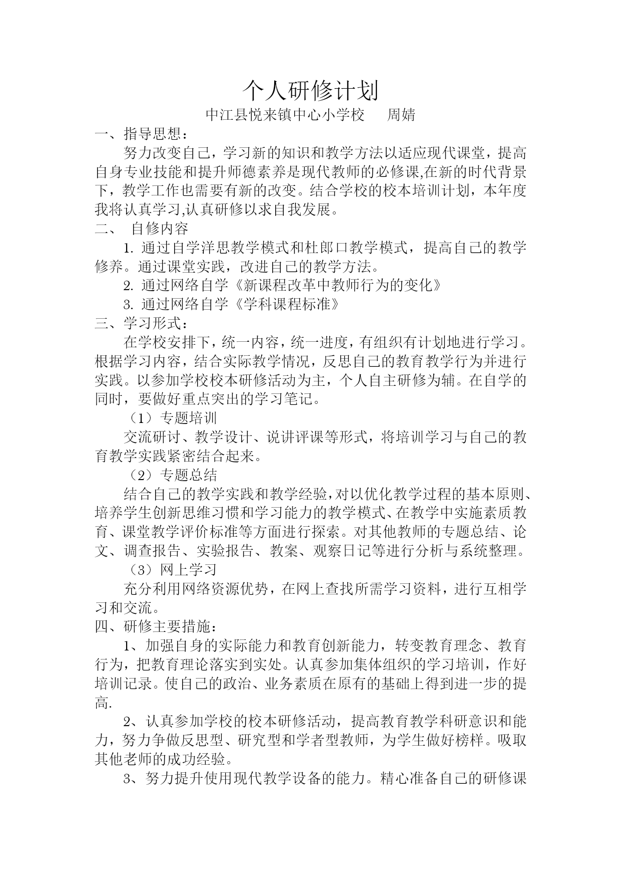 个人研修计划 中江县悦来镇中心小学校周婧 一、指导思想: 努力改变自己,学习新的知识和教学方法以适应现代课堂,提高自身专业技能和提升师德素养是现代教师的必修课,在新的时代背景下,教学工作也需要有新的改变。结合学校的校本培训计划,本年度我将认真学习,认真研修以求自我发展。 二、自修内容 1.通过自学洋思教学模式和杜郎口教学模式,提高自己的教学修养。通过课堂实践,改进自己的教学方法。 2.通过网络自学《新课程改革中教师行为的变化》 3.通过网络自学《学科课程标准》 三、学习形式: 在学校安排下,统一内容,统一进度,有组织有计划地进行学习。根据学习内容,结合实际教学情况,反思自己的教育教学行为并进行实践。以参加学校校本研修活动为主,个人自主研修为辅。在自学的同时,要做好重点突出的学习笔记。 (1)专题培训 交流研讨、教学设计、说讲评课等形式,将培训学习与自己的教育教学实践紧密结合起来。 (2)专题总结 结合自己的教学实践和教学经验,对以优化教学过程的基本原则、培养学生创新思维习惯和学习能力的教学模式、在教学中实施素质教育、课堂教学评价标准等方面进行探索。对其他教师的专题总结、论文、调查报告、实验报告、教案、观察日记等进行分析与系统整理。 (3)网上学习 充分利用网络资源优势,在网上查找所需学习资料,进行互相学习和交流。 四、研修主要措施: 1、加强自身的实际能力和教育创新能力,转变教育理念、教育行为,把教育理论落实到实处。认真参加集体组织的学习培训,作好培训记录。使自己的政治、业务素质在原有的基础上得到进一步的提高. 2、认真参加学校的校本研修活动,提高教育教学科研意识和能力,努力争做反思型、研究型和学者型教师,为学生做好榜样。吸取其他老师的成功经验。 3、努力提升使用现代教学设备的能力。精心准备自己的研修课程,掌握现代教育技术能力,熟练运用计算机备课,能借助网络查找有关教学资料,能应用软件制作课件,运用计算机辅助教学。 4、空余时间利用电脑进行网络研修。 5、崇高的使命感,乐于奉献,勇于吃苦,勤洁廉正的教师。