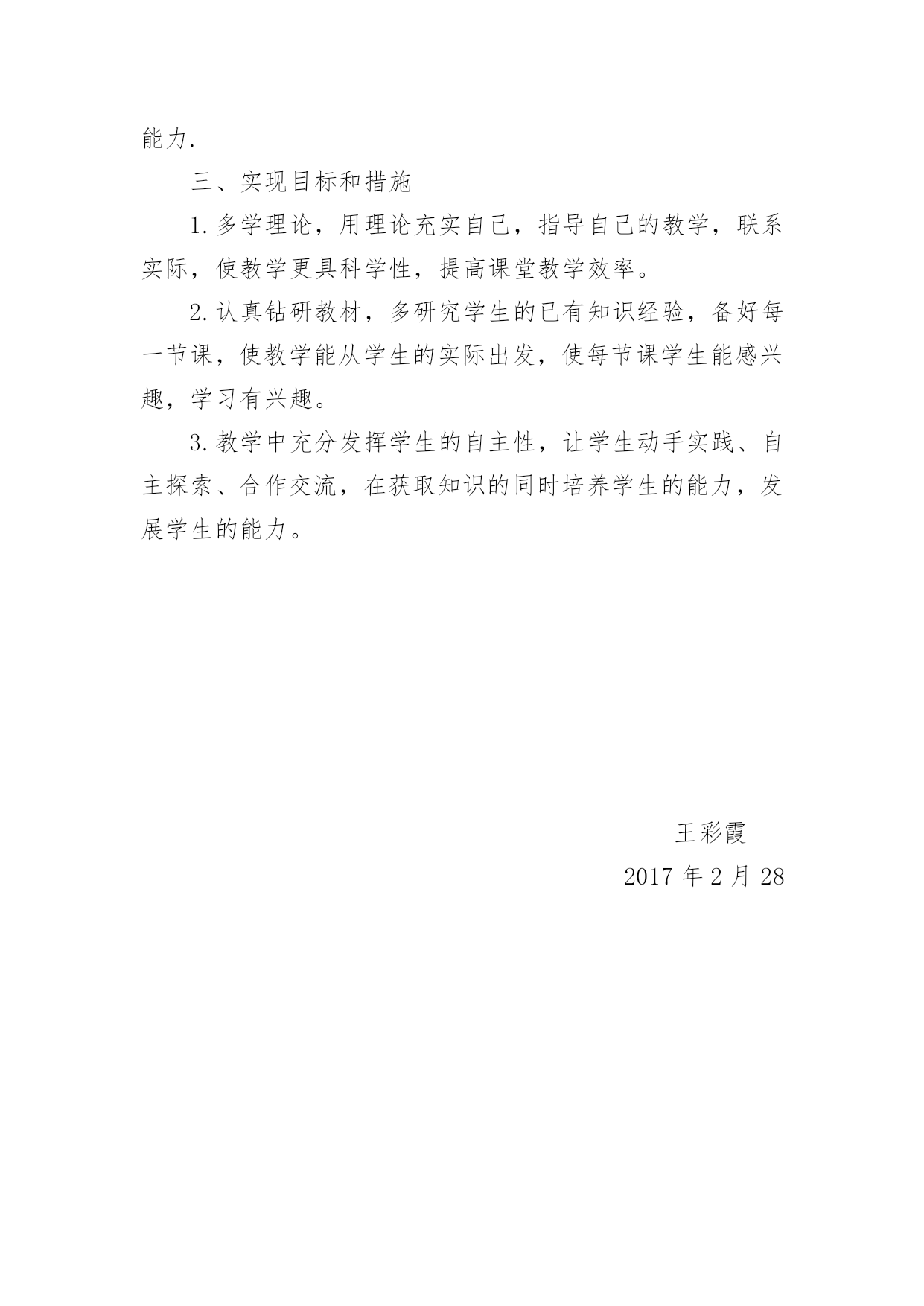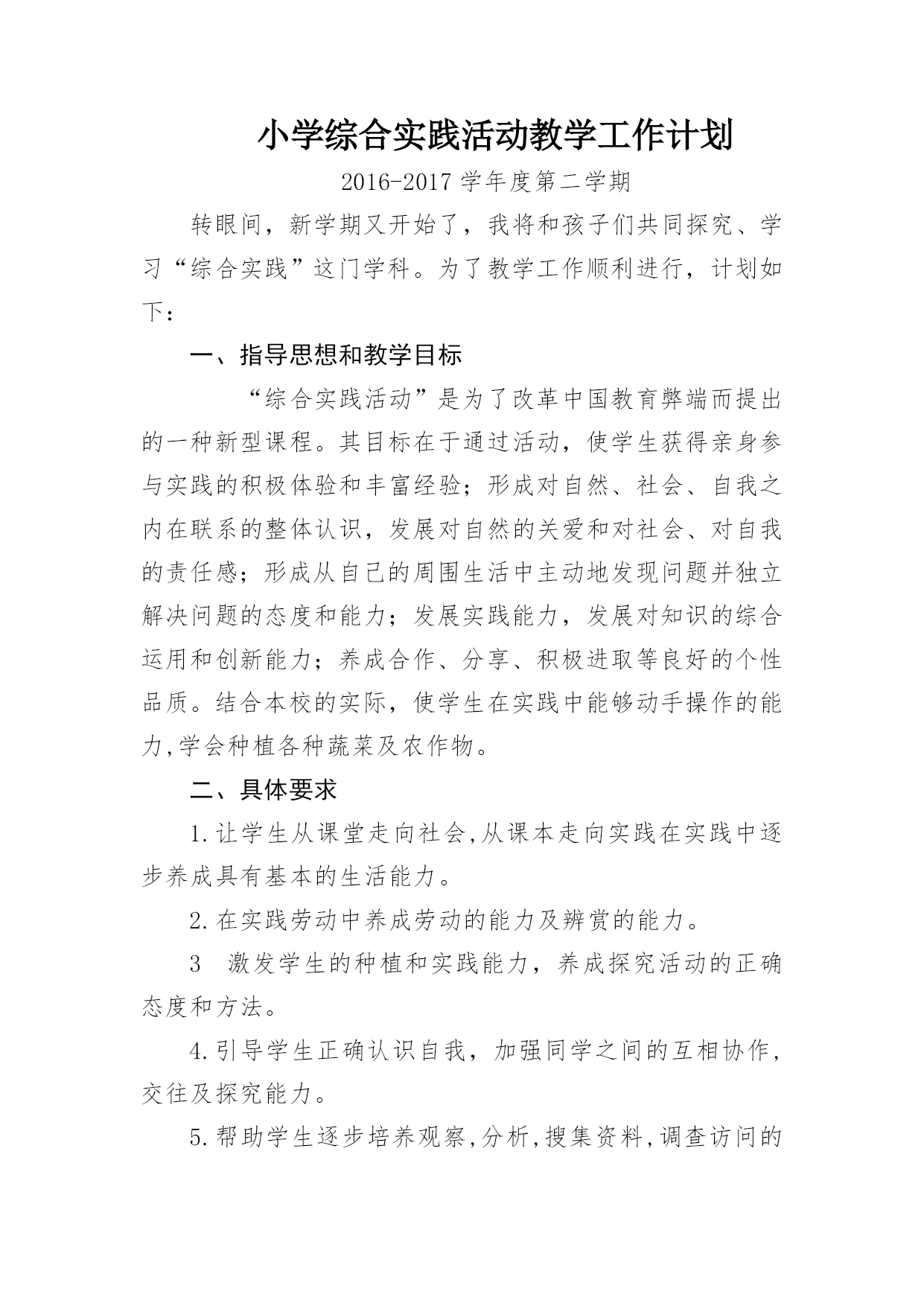 小学综合实践活动教学工作计划 2016-2017学年度第二学期 转眼间,新学期又开始了,我将和孩子们共同探究、学习“综合实践”这门学科。为了教学工作顺利进行,计划如下:一、指导思想和教学目标“综合实践活动”是为了改革中国教育弊端而提出的一种新型课程。其目标在于通过活动,使学生获得亲身参与实践的积极体验和丰富经验;形成对自然、社会、自我之内在联系的整体认识,发展对自然的关爱和对社会、对自我的责任感;形成从自己的周围生活中主动地发现问题并独立解决问题的态度和能力;发展实践能力,发展对知识的综合运用和创新能力;养成合作、分享、积极进取等良好的个性品质。结合本校的实际,使学生在实践中能够动手操作的能力,学会种植各种蔬菜及农作物。二、具体要求1.让学生从课堂走向社会,从课本走向实践在实践中逐步养成具有基本的生活能力。2.在实践劳动中养成劳动的能力及辨赏的能力。3激发学生的种植和实践能力,养成探究活动的正确态度和方法。4.引导学生正确认识自我,加强同学之间的互相协作,交往及探究能力。5.帮助学生逐步培养观察,分析,搜集资料,调查访问的能力. 三、实现目标和措施1.多学理论,用理论充实自己,指导自己的教学,联系实际,使教学更具科学性,提高课堂教学效率。2.认真钻研教材,多研究学生的已有知识经验,备好每一节课,使教学能从学生的实际出发,使每节课学生能感兴趣,学习有兴趣。3.教学中充分发挥学生的自主性,让学生动手实践、自主探索、合作交流,在获取知识的同时培养学生的能力,发展学生的能力。 王彩霞 2017年2月28