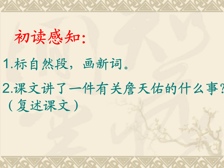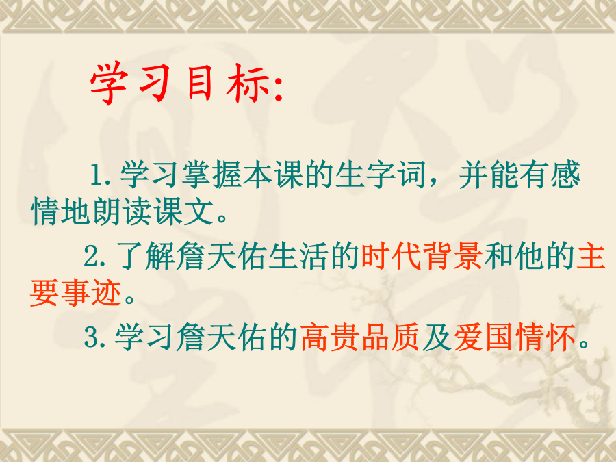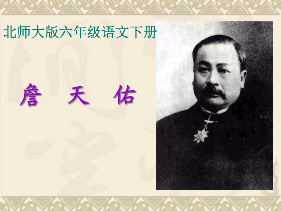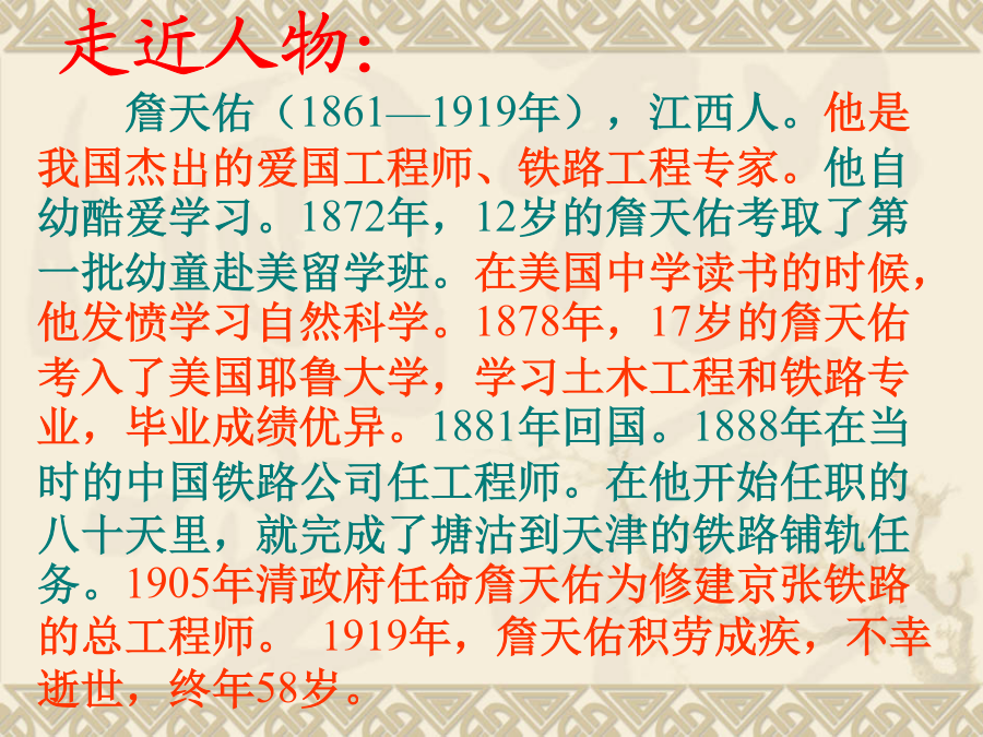 北师大版六年级语文下册 学习目标: 1.学习掌握本课的生字词,并能有感情地朗读课文。 2.了解詹天佑生活的时代背景和他的主要事迹。 3.学习詹天佑的高贵品质及爱国情怀。 1.标自然段,画新词。 2.课文讲了一件有关詹天佑的什么事?(复述课文)学习新字词:默读课文,思考这篇文章讲了一件有关詹天佑的什么事?细读感悟:(3)在勘测线路过程中詹天佑怎么说、怎么做、怎么想的?谈谈收获:从勘测线路过程中,体会詹天佑的所说、所做、所想,说一说你心目中的詹天佑?通过这节课的学习,你肯定有许多话想对詹天佑说,拿起你的笔,写出你想说的话吧!(也可用顺口溜、诗歌、歌曲的形式来表现人物的特点)我的观点