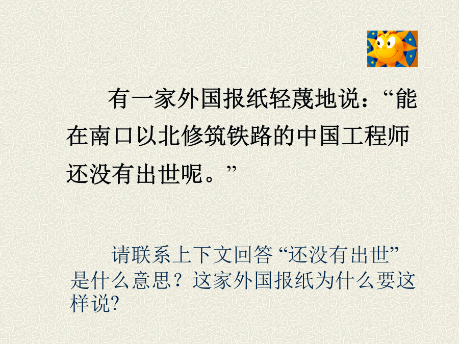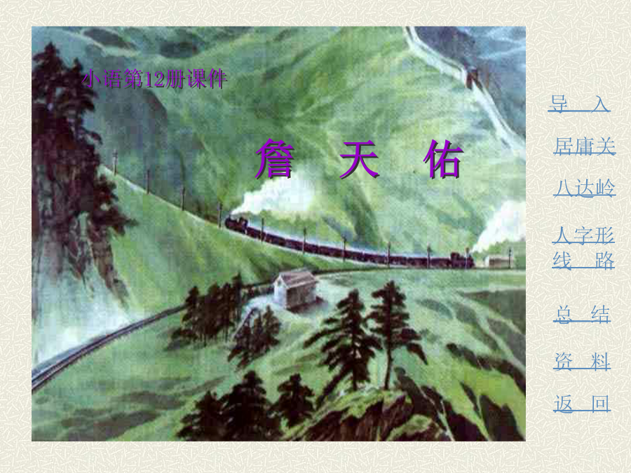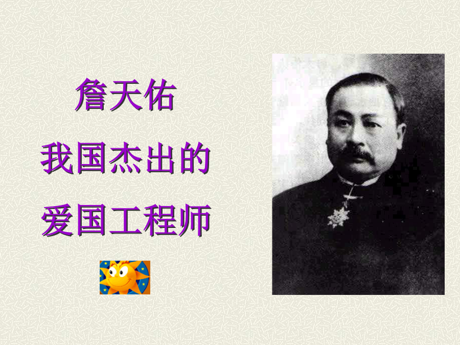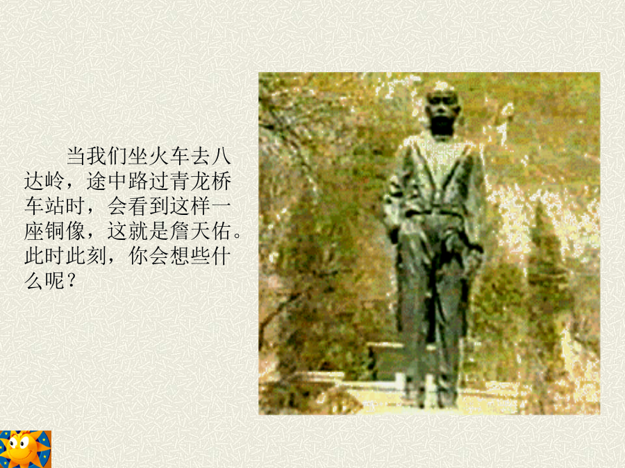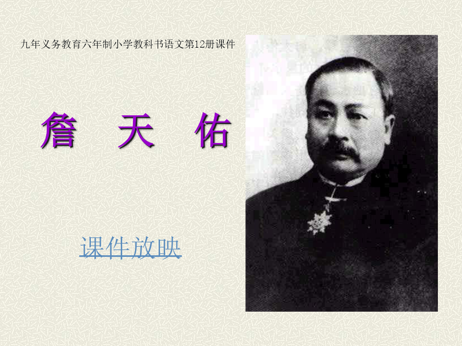 九年义务教育六年制小学教科书语文第12册课件詹天佑当我们坐火车去八达岭,途中路过青龙桥车站时,会看到这样一座铜像,这就是詹天佑。此时此刻,你会想些什么呢?詹天佑 我国杰出的 爱国工程师 有一家外国报纸轻蔑地说:“能火车是怎样过青龙桥的?为什么要把铁路设计为人字形?想一想,生活中哪些时候也用到这个办法?为国争光的爱国思想资料