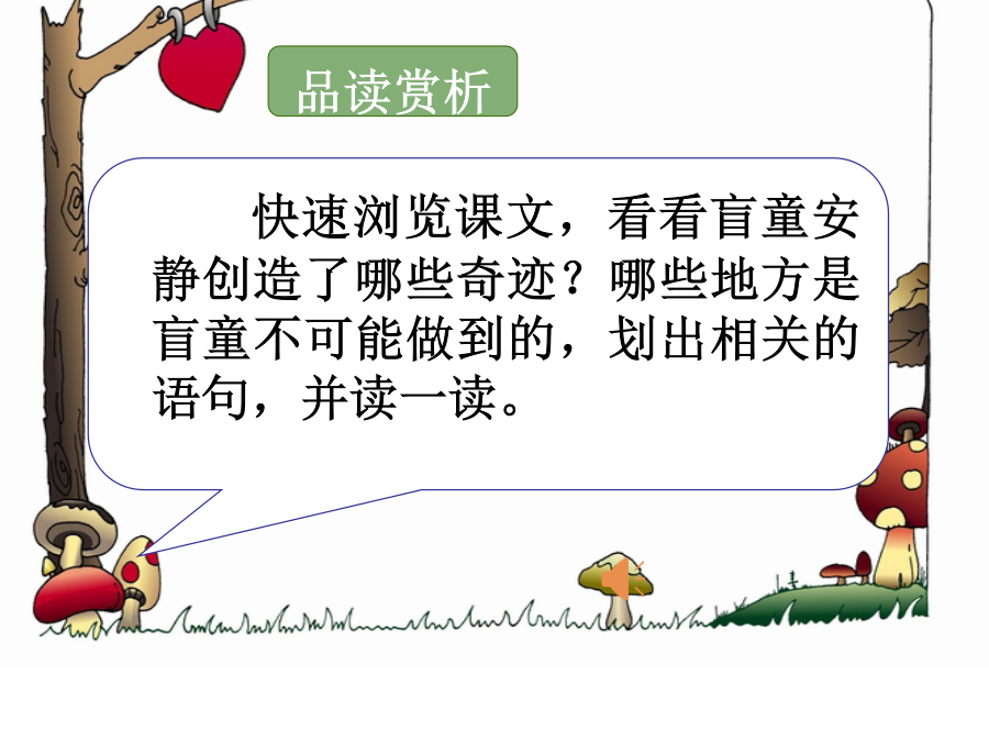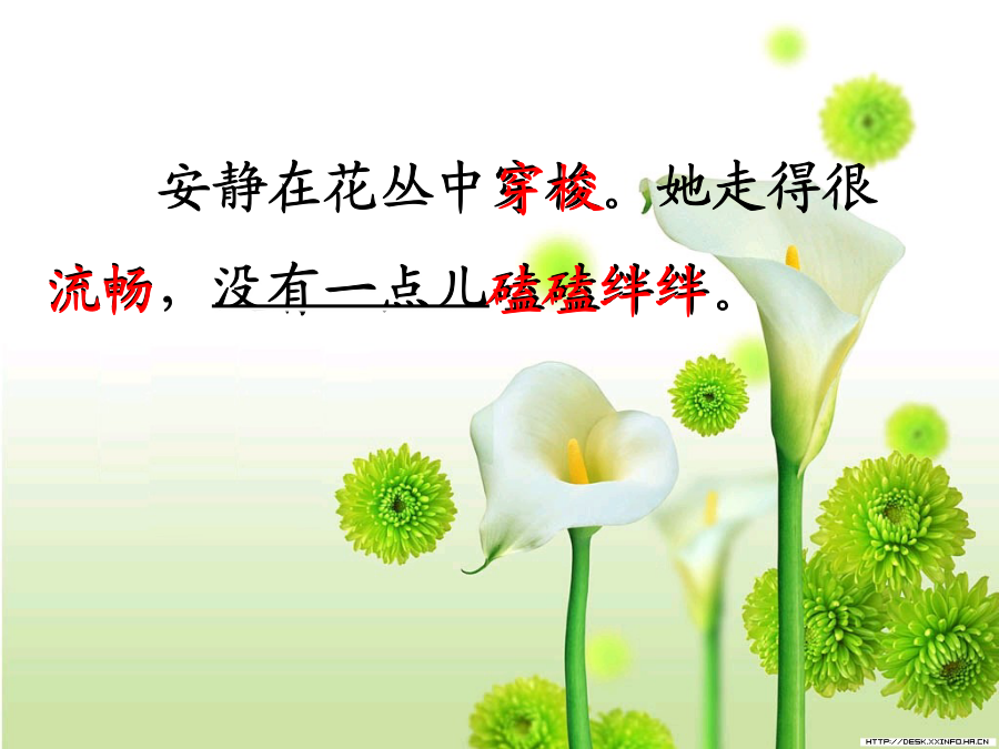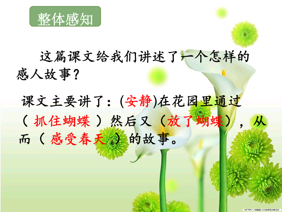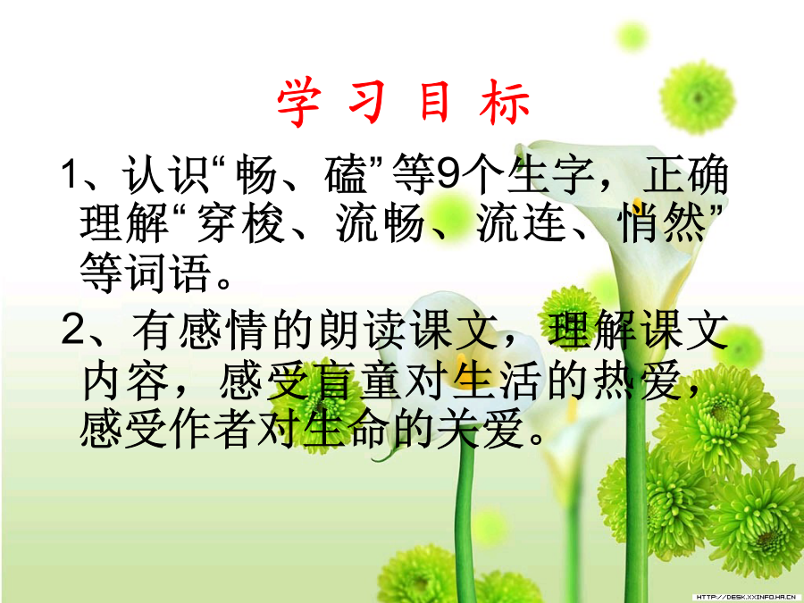 学习目标这篇课文给我们讲述了一个怎样的感人故事?安静在花丛中穿梭。她走得很 流畅,没有一点儿磕磕绊绊。安静的手指悄然合拢,竟然拢住了那 只蝴蝶,真是一个奇迹!睁着眼睛的蝴 蝶被这个盲女孩神奇的灵性抓住了。这个小女孩,整天在花香中流连。竟然能在花丛中穿梭,还走得那么流畅,没有一点儿磕磕绊绊。 蝴蝶在她的手指间扑腾,安静的脸上充满了惊讶。这是一次全新的经历,安静的心灵来到了一个她完全没有体验过的地方。 这是一次全新的经历,安静的心灵来到了一个她完全没有体验过的地方。在春天的深处,安静细细地感受着春光。许久,她张开手指,蝴蝶扑闪着翅膀飞走了,安静仰起头来张望。此刻安静的心上一定划过一条美丽的弧线,蝴蝶在她八岁的人生划过一道极其优美的曲线,述说着飞翔的概念。 谁都有生活的权利,谁 都可以创造一个属于自己的 缤纷世界。拓展练习: