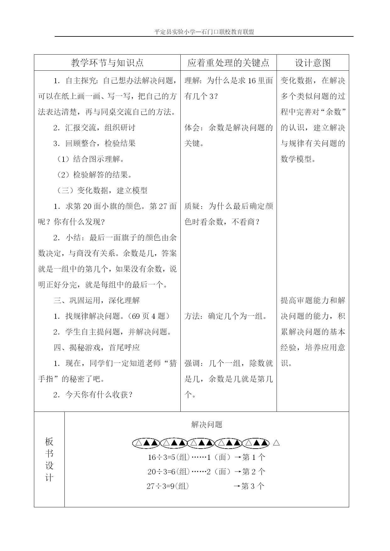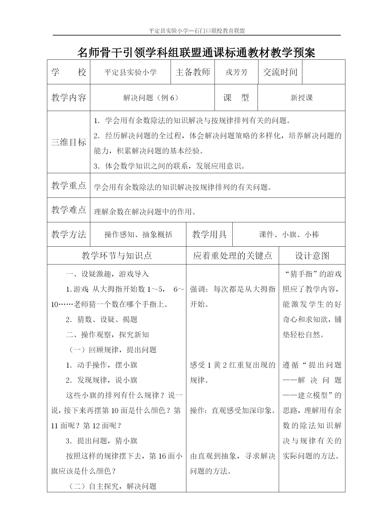 平定县实验小学—石门口联校教育联盟 名师骨干引领学科组联盟通课标通教材教学预案 学校平定县实验小学主备教师戎芳芳交流时间教学内容解决问题(例6)课型新授课三维目标1.学会用有余数除法的知识解决与按规律排列有关的问题。 2.经历解决问题的全过程,体会解决问题策略的多样化,培养解决问题的能力,积累解决问题的基本经验。 3.体会数学知识之间的联系,发展应用意识。 教学重点学会用有余数除法的知识解决按规律排列的有关问题。教学难点理解余数在解决问题中的作用。教学方法操作感知、抽象概括教学用具课件、小旗、小棒教学环节与知识点应着重处理的关键点设计意图一、设疑激趣,游戏导入 1.游戏:从大拇指开始数1~5,6~10……老师猜一个数在哪个手指上。 2.猜数、设疑、揭题 二、操作观察,探究新知 (一)回顾规律,提出问题 1.动手操作,摆小旗 2.发现规律,说小旗 这些小旗的排列有什么规律?说一说,接下来再摆第10面是什么颜色?第11面呢?第12面呢? 3.提出问题,猜小旗 按照这样的规律摆下去,第16面小旗应该是什么颜色? (二)自主探究,解决问题 强调:每次都是从大拇指开始。 感受1黄2红重复出现的规律。 操作:直观感受加深印象。 由直观到抽象,寻求解决问题的方法。“猜手指”的游戏照应了教学内容,能激发学生的好奇心和求知欲,铺垫轻松自然。 遵循“提出问题——解决问题——建立模型”的思路,理解用有余数的除法知识解决与规律有关的实际问题的方法。 教学环节与知识点应着重处理的关键点设计意图1.自主探究:自己想办法解决问题,可以在纸上画一画、写一写,把自己的方法表达清楚,再与同桌交流自己的方法。 2.汇报交流,组织研讨 3.回顾整合,检验结果 (1)结合图示理解。 (2)检验解答的结果。 (三)变化数据,建立模型 1.求第20面小旗的颜色。第27面呢?你有什么发现? 2.小结:最后一面旗子的颜色由余数决定,与商没有关系。余数是几,答案就是一组中的第几个,如果没有余数,说明正好分完,就是每组中的最后一个。 三、巩固运用,深化理解 1.找规律解决问题。(69页4题) 2.学生自主提问题,并解决问题。 四、揭秘游戏,首尾呼应 1.现在,同学们一定知道老师“猜手指”的秘密了吧。 2.今天你有什么收获?理解:为什么是求16里面有几个3? 体会:余数是解决问题的关键。 质疑:为什么最后确定颜色时看余数,不看商? 方法:确定几个为一组。 强调:几个一组,除数就是几,余数是几就是第几个。变化数据,在解决多个类似问题的过程中完善对“余数”的认识,建立解决与规律有关问题的数学模型。 提高审题能力和解决问题的能力,积累解决问题的基本经验,培养应用意识。 板 书 设 计 解决问题 △▲▲△▲▲△▲▲△▲▲△▲▲△ 16÷3=5(组)……1(面)→第1个 20÷3=6(组)……2(面)→第2个 27÷3=9(组)→第3个