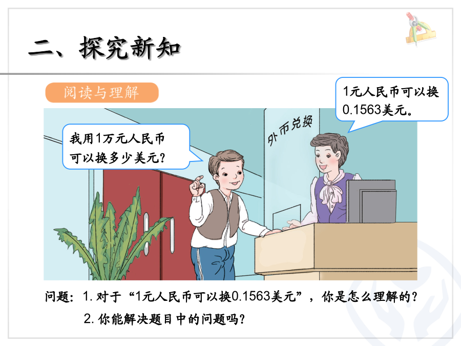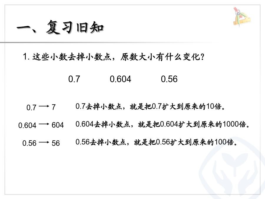 解决问题(例3)一、复习旧知我用1万元人民币 可以换多少美元?我用1万元人民币 可以换多少美元?预设②:可以根据小数点移动的规律来计算,乘10000 就要把小数点向右移动四位。预设:1563÷10000=0.1563,算对了。三、巩固练习0.85×100=85(kg) 0.85×1000=850(kg) 答:100kg小麦可以磨85kg面粉, 1000kg小麦可以磨850kg面粉。方法一: 82÷100=0.82(件) 0.82×10000=8200(件)四、布置作业