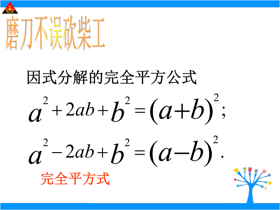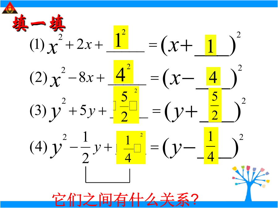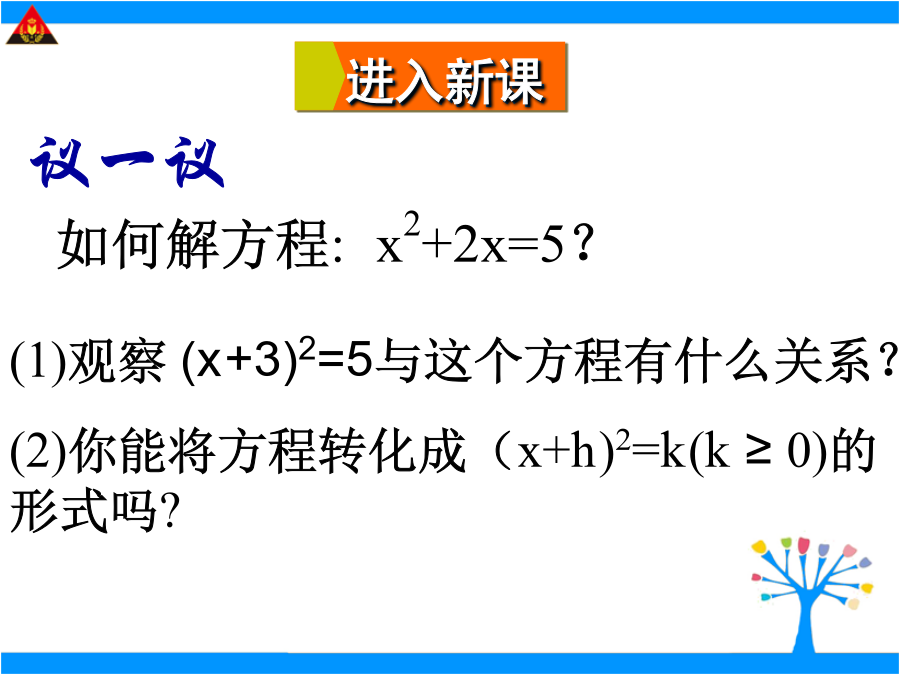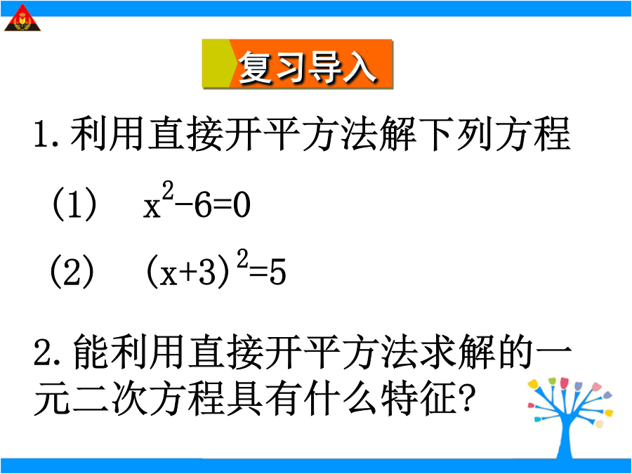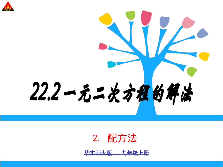 2.配方法1.利用直接开平方法解下列方程议一议磨刀不误砍柴工填一填总结归律:例:用配方法解方程4x2-12x-1=0用配方法解一元二次方程的步骤:课堂反馈:练习1:用配方法解下列方程 (1) 2.用配方法说明:不论k取何实数,多项式k2-3k+5的值必定大于零.配方的过程可以用拼图直观地表示。小结:解一元二次方程的基本思路拓展:1.从教材习题中选取, 2.完成练习册本课时的习题.