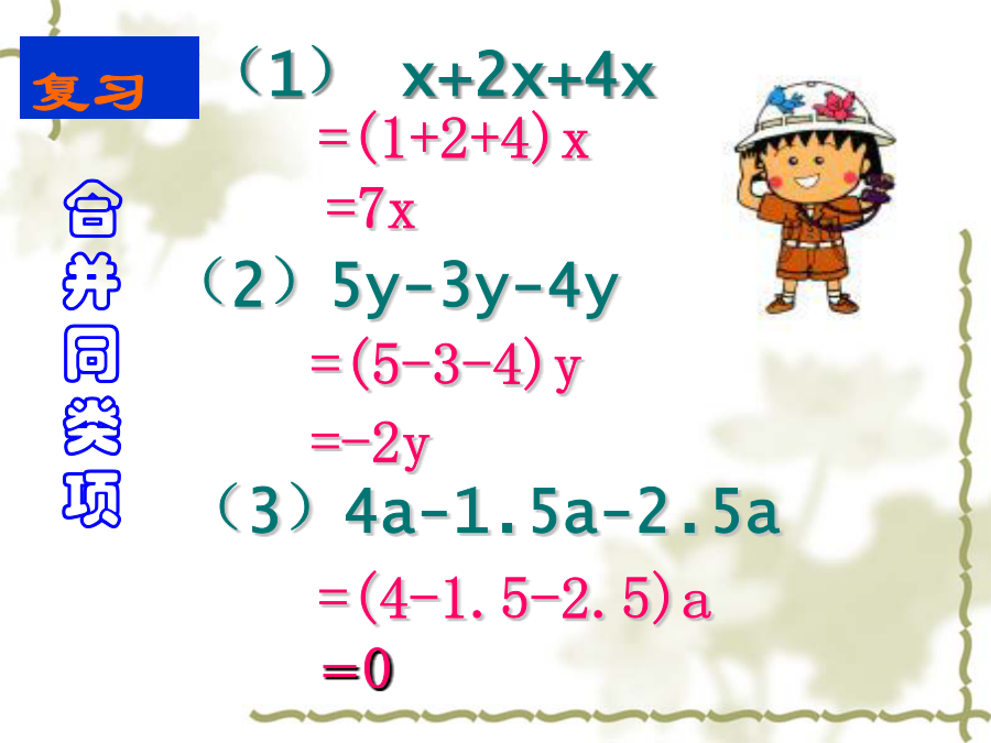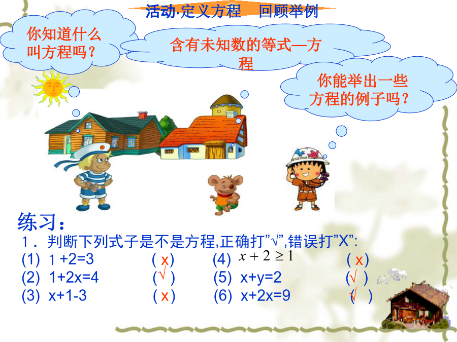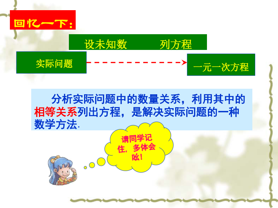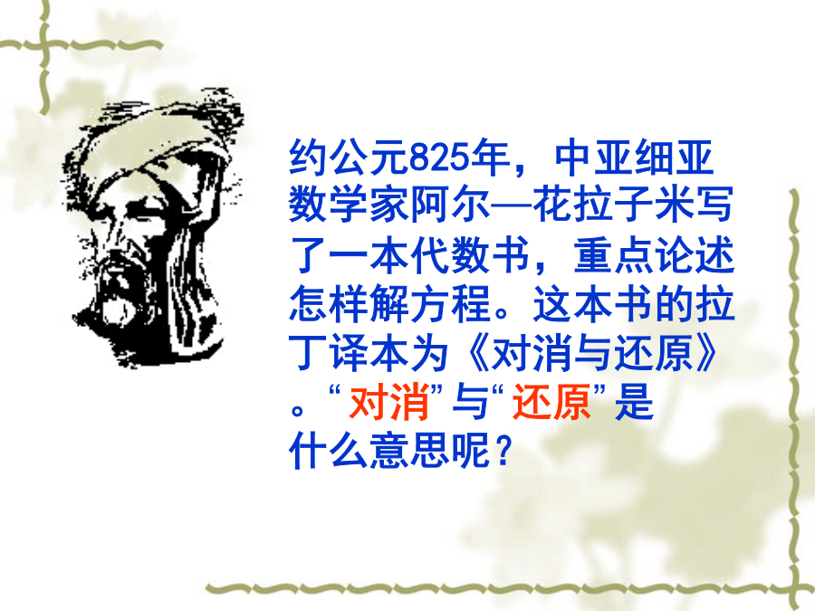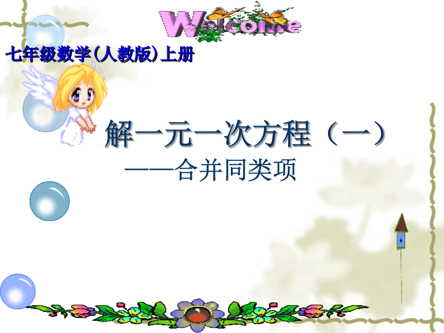 七年级数学(人教版)上册你知道什么叫方程吗?约公元825年,中亚细亚数学家阿尔—花拉子米写了一本代数书,重点论述怎样解方程。这本书的拉丁译本为《对消与还原》。“对消”与“还原”是什么意思呢?问题1:合并同类项起到了“化简”的作用,即把含有未知数的项合并,从而把方程转化为ax=b,使其更接近x=a的形式(其中a,b是常数).问题2: 洗衣厂今年计划生产洗衣机25500台,其中Ⅰ型,Ⅱ型,Ⅲ型三种洗衣机的数量之比为1:2:14,这三种洗衣机计划各生产多少台?例题:解方程解下列方程在一卷公元前1600年左右遗留下来的古埃及草卷中,记载着一些数学问题.其中一个翻译过来就是“啊哈,它的全部,它的七分之一,其和等于19”.你能求出问题中的“它”吗?请你能根据题意列出方程.请欣赏一首诗: 太阳下山晚霞红,我把鸭子赶回笼; 一半在外闹哄哄,一半的一半进笼中; 剩下十五围着我,共有多少请算清。 一个数,它的三分之二,它的一半,它的七分之一,它的全部,加起来总共是33。求这个数。 你今天学习的解方程有哪些步骤?作业:祝同学们学习进步!