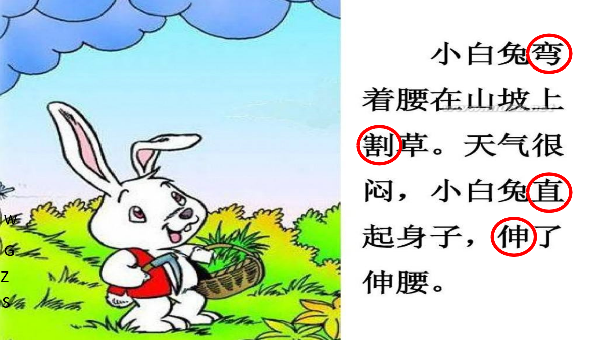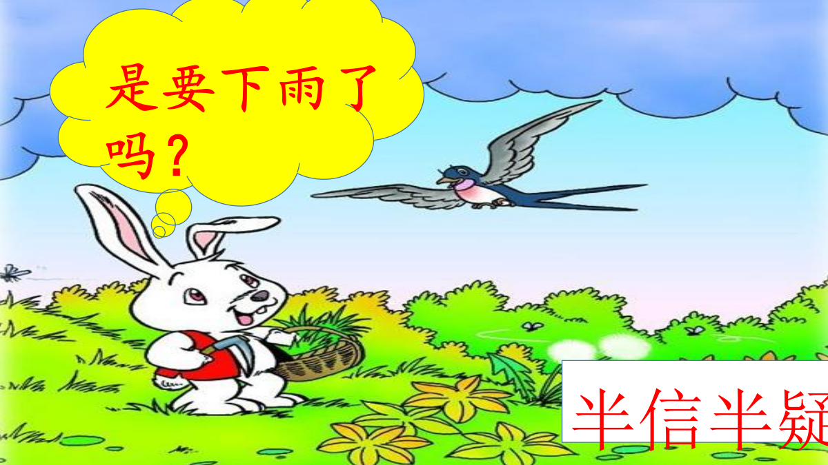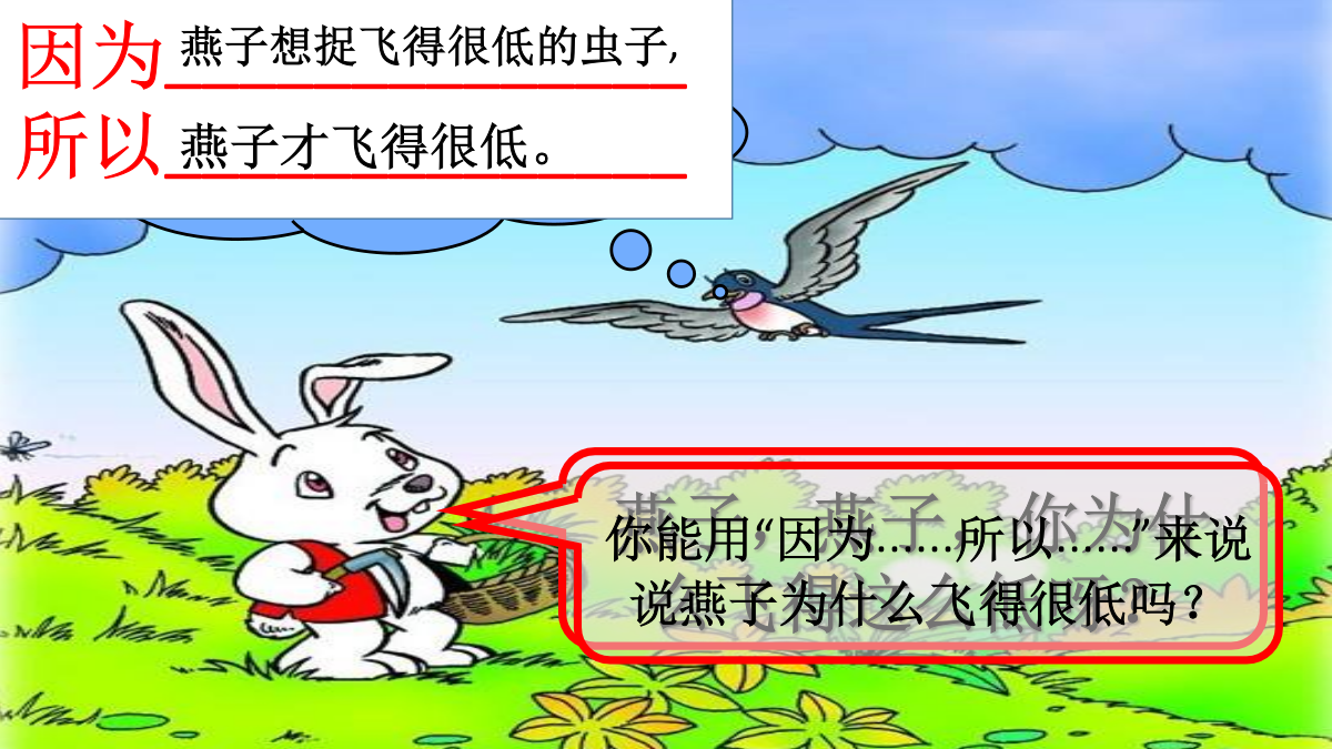 是要下雨了吗?小白兔往前边池子里一看,小鱼都游到水面上来了。④是要下雨了吗?小白兔往前边池子里一看,小鱼都游到水面上来了。 ⑤小白兔跑过去,问:“小鱼,小鱼,今天怎么有空出来呀?” ⑥小鱼说:“要下雨了,水里闷得很,我们到水面上来透透气。小白兔,你快回家吧,小心淋着雨。”⑦小白兔连忙挎起篮子往家跑。他看见路边有一群蚂蚁,就把要下雨的消息告诉了蚂蚁。一只大蚂蚁说:“是要下雨了,我们正忙着搬东西呢!”练练吧!作业: