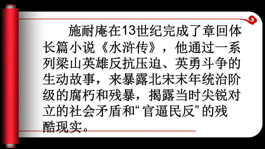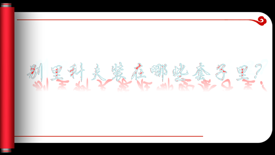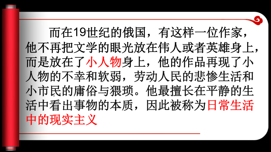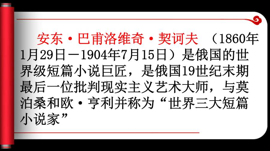 施耐庵在13世纪完成了章回体长篇小说《水浒传》,他通过一系列梁山英雄反抗压迫、英勇斗争的生动故事,来暴露北宋末年统治阶级的腐朽和残暴,揭露当时尖锐对立的社会矛盾和“官逼民反”的残酷现实。。安东·巴甫洛维奇·契诃夫(1860年1月29日-1904年7月15日)是俄国的世界级短篇小说巨匠,是俄国19世纪末期最后一位批判现实主义艺术大师,与莫泊桑和欧·亨利并称为“世界三大短篇小说家”《装在套子里的人》别里科夫装在哪些套子里?有形的套子:穿着、用具、住处套中人别里科夫的性格特点: 古怪保守、孤僻胆小、多疑封闭,极力维护旧秩序,惧怕任何新事物。死亡死亡别里科夫死因别里科夫死了,可是契诃夫却说“一个礼拜还没有过完,生活又恢复旧样子”,“装在套子里的人却还有许多”,你如何理解课文最后一段?别里科夫死了,可是契诃夫说“一个礼拜还没有过完,生活又恢复旧样子”,“局面并没有好一点”,你如何理解课文最后一段?小城中的三类人: “别里科夫”一样的套中人 “柯瓦连科”一样的套外人 心里住着“别里科夫”的中间人(绝大多数)小城中的三类人: 套中人是腐朽秩序的维护者,终将灭亡。 套外人是先进制度的急先锋,终成主流。 中间人对新事物不排斥,对旧事物表示妥协,斗争不彻底。小说的主题: 1.通过塑造别里科夫这一形象,抨击了沙皇制度及其维护者对自由压制、对民众专制的罪恶。 2.借助柯瓦连科等进步人物形象,寄托了新事物终将取代旧秩序,终成社会主流的美好期许。 3.借小城人的表现,揭露了绝大多数民众面对反动统治表现出来的妥协与软弱,而他们同样是新事物发展的重大阻碍。革新刻不容缓,却也任重道远!你我是否就是那个装在套子里的人?抑或是那个中间人?小说的艺术手法: 1、塑造小人物,洞察大社会 2、善讽刺,重夸张,有漫画风格。