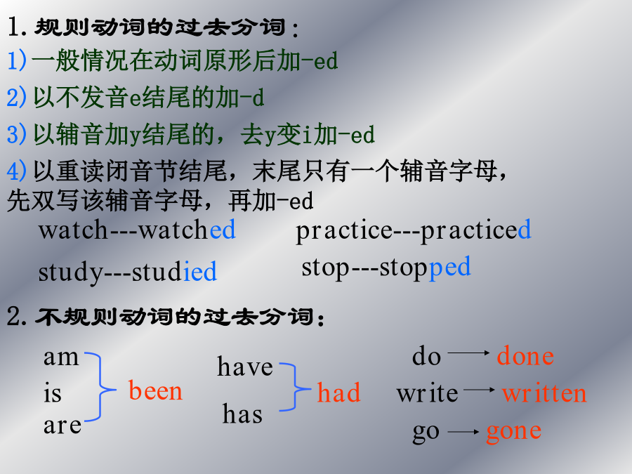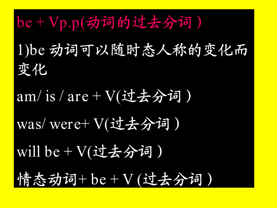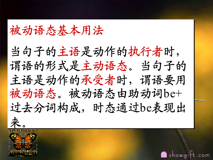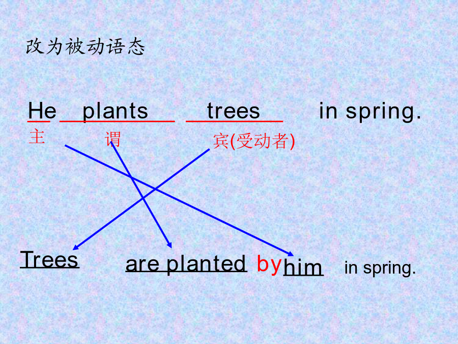 被动语态被动语态基本用法 当句子的主语是动作的执行者时,谓语的形式是主动语态。当句子的主语是动作的承受者时,谓语要用被动语态。被动语态由助动词be+过去分词构成,时态通过be表现出来。be+Vp.p(动词的过去分词) 1)be动词可以随时态人称的变化而变化 am/is/are+V(过去分词) was/were+V(过去分词) willbe+V(过去分词) 情态动词+be+V(过去分词)1.规则动词的过去分词:Heplantstreesinspring.主动语态变被动语态口诀: 宾语提前主语变, 原主变宾by后见, 时态人称be关键。Tomwillcleantheroomtomorrow.Hisbrotherwashesbowlseveryday.1.Theymakeshoesinthatfactory. 主语+及物动词+宾语 2.Theyboughttencomputerslastterm. 3.AmycantakegoodcareofGina.4.Theywillfinishtheworkintendays. 5. Someworkersarepaintingtheroomsnow.6.Wehavemadetwentymorekeys.7.Iwasdoingmyhomeworkat8:00lastnight. 各种时态的被动语态构成 1)一般现在时:Youareinvitedtodothis. 2)一般过去时:Thestorywastoldbyher. 3)一般将来时:Theproblemwillbediscussedtomorrow.4)情态动词:Therubbishcanbeputintothedustbinoverthere.时态各种时态的被动语态构成何时使用被动语态呢? 一、行为主体不明确,不必说出或者无法说出动作的执行者时。例如: Footballisplayedallovertheworld. 二、不易找到或根本就不可能找到动作的执行者时。例如: Mybikewasstolen.我的自行车被盗了。三、汉语中含有“据说”、“据悉”、“有人说”、“大家说”等时。例如: Itissaidthatonedayheclimbedtothetopofahouseand…… ItwasreportedthathermotherdiedofSARS. 众所周知……Itiswellknownthat… 据推测说……Itissupposedthat…四、汉语中含有“被”、“由”等词时。 例如: TinaisaskedtocomebyPaul. Tina是被Paul叫来的。 五、某些句子习惯上用被动语态。例如: HewasborninOctober,1989.1.Peopleuseknivesforcuttingthings. Knives____________forcuttingthings. 2.Thestudentscleanthewindowsoftheirclassroomtwiceamonth. Thewindowsoftheirclassroom_____________twiceamonth.3.Ifoundtheticketonthefloor. ________________________onthefloor. 4.Itoldhertoreturnthebookintime. She_____________toreturnthebookintime.5.Hisdoctormadehimhaveonlytwomealsaday. He___________________________onlytwomealsaday. 6.Nowpeoplecanusecomputerstohelpthem. Nowcomputers___________________tohelpthem.7.Didyouplantmanytreesatthistimelastyear? ___________________________atthistimelasttime? 8.Mustwefinishourworktoday? _______ourwork_____________today?9.Theforeignfriendsgaveussomewonderfulstamps. 1)____________________somewonderfulstamps. 2)Somewonderfulstamps_____________________________.10.TheteacheraskedTomtoturnonthecomputer. Tom_______________toturnonthecomputer.