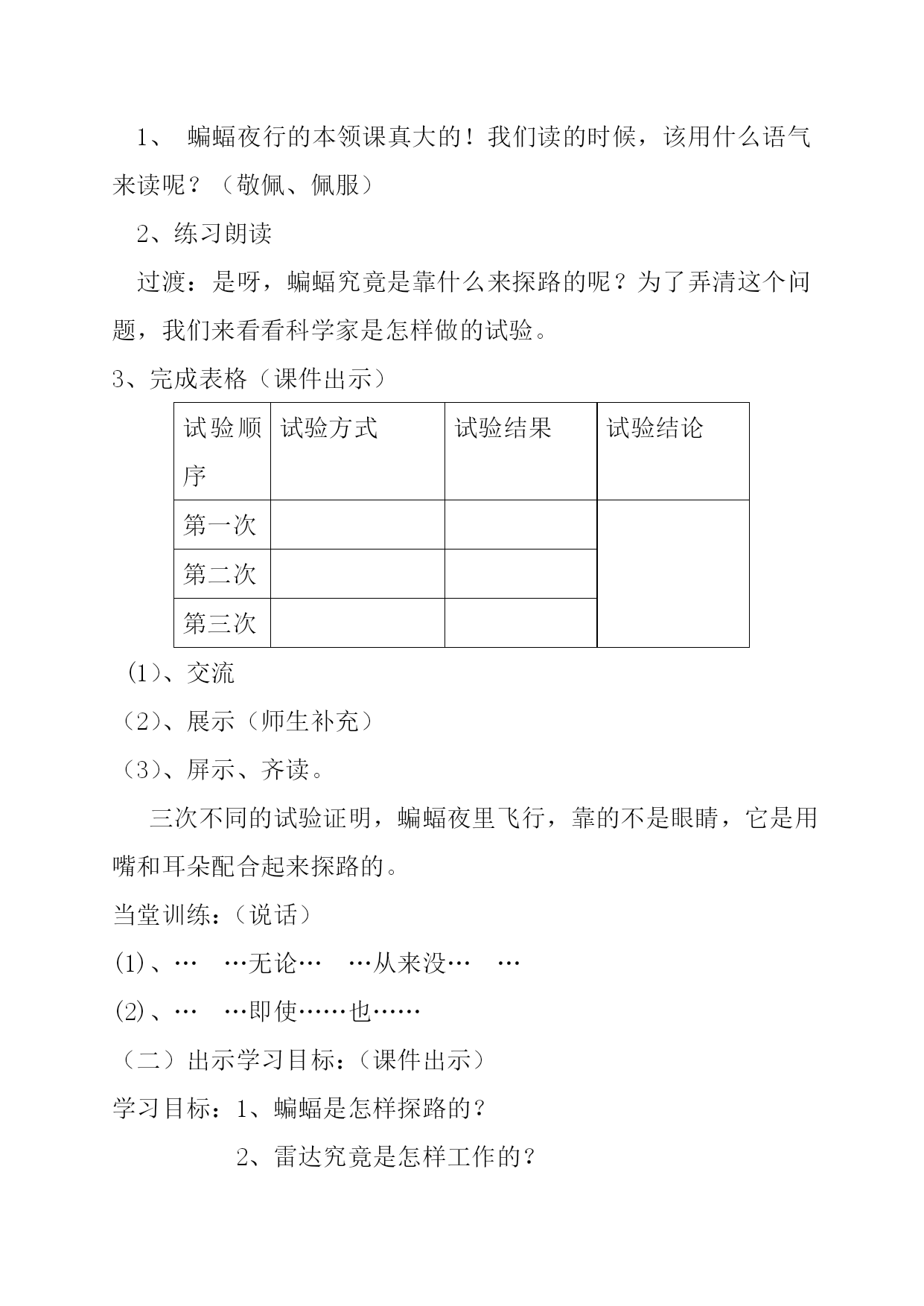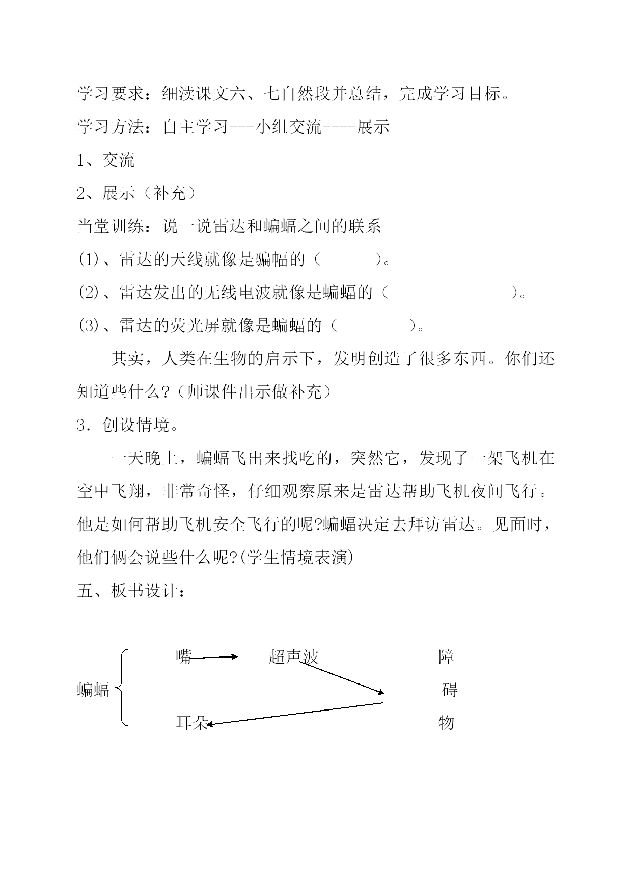 11.《蝙蝠和雷达》教学设计 汉东小学沈尚娟 教学目标: 知识与技能:1、认识7个生字,正确书写12个生字和“蝙蝠、清朗、捕捉、飞蛾、障碍物、荧光屏、横七竖八”等词语。 2、朗读课文,把握课文主要内容和要点,理解飞机夜间安全飞行与蝙蝠探路之间的联系。 过程与方法:1、采用朗读、默读、圈点勾画,质疑探究。 2、用填表法、填空法。 情感态度价值观:激发学生热爱科学,乐于观察与探究的兴趣。 教学重难点:理解飞机夜间安全飞行与蝙蝠探路之间的联系。 课前准备: 1、课件制作、教师搜集有关仿生学的图文资料。 2、学生搜集有关蝙蝠和雷达的资料以及有关仿生学的资料,提高信息搜集与处理能力。 教学过程 一、看图揭题1.(出示蝙蝠图片)认识它吗?关于它你们知道些什么? 2.(出示雷达图片)这是什么?知道雷达有什么作用吗? 过渡:同学们,蝙蝠是一种动物,而雷达则是人类发明的一种探测仪器。这两种截然不同的事物,课题中为什么用“和”(板书“和”)把它们连起来,它们之间究竟有什么联系呢? 二、初读课文了解课文主要内容 (一)出示学习目标:(课件出示) 学习目标:1、初读课文读准字音把课文读通顺,读流利。 2、了解课文内容 学习方法: 轻声读课文,看看课文中哪几句话直接写出了蝙蝠和雷达之间的关系。提示:看看哪一句话既写了蝙蝠又写了雷达。(完成目标2) 学习要求:自读—总结—展示 1.交流后展示 2.小结并质疑。 这就是课文的主要内容。围绕这个主要内容,你们还想知道些什么? 三、研读课文解决质疑 (一)出示学习目标:(课件出示) 学习目标:1、通过读文了解蝙蝠在夜间是怎么飞的? 2、蝙蝠夜间飞行是靠什么探路的?(科学家为了揭开蝙蝠夜间飞行的秘密,做了几次试验,是怎样做的) 学习要求:1、细读课文三自然段,用读、划、圈、批注学习目标1。 2、细读课文四、五自然段完成表格,学习目标2。 学习方法:自渎---自主理解---小组交流----展示 1、蝙蝠夜行的本领课真大的!我们读的时候,该用什么语气来读呢?(敬佩、佩服) 2、练习朗读 过渡:是呀,蝙蝠究竟是靠什么来探路的呢?为了弄清这个问题,我们来看看科学家是怎样做的试验。 3、完成表格(课件出示) 试验顺序试验方式试验结果试验结论第一次第二次第三次(1)、交流 (2)、展示(师生补充) (3)、屏示、齐读。 三次不同的试验证明,蝙蝠夜里飞行,靠的不是眼睛,它是用嘴和耳朵配合起来探路的。 当堂训练:(说话) (1)、……无论……从来没…… (2)、……即使……也…… (二)出示学习目标:(课件出示) 学习目标:1、蝙蝠是怎样探路的? 2、雷达究竟是怎样工作的? 学习要求:细渎课文六、七自然段并总结,完成学习目标。 学习方法:自主学习---小组交流----展示 1、交流 2、展示(补充) 当堂训练:说一说雷达和蝙蝠之间的联系 (1)、雷达的天线就像是骗幅的()。 (2)、雷达发出的无线电波就像是蝙蝠的()。 (3)、雷达的荧光屏就像是蝙蝠的()。 其实,人类在生物的启示下,发明创造了很多东西。你们还知道些什么?(师课件出示做补充) 3.创设情境。 一天晚上,蝙蝠飞出来找吃的,突然它,发现了一架飞机在空中飞翔,非常奇怪,仔细观察原来是雷达帮助飞机夜间飞行。他是如何帮助飞机安全飞行的呢?蝙蝠决定去拜访雷达。见面时,他们俩会说些什么呢?(学生情境表演) 五、板书设计: 嘴超声波障 蝙蝠碍 耳朵物 天线无线电波障 雷达碍 荧光屏物