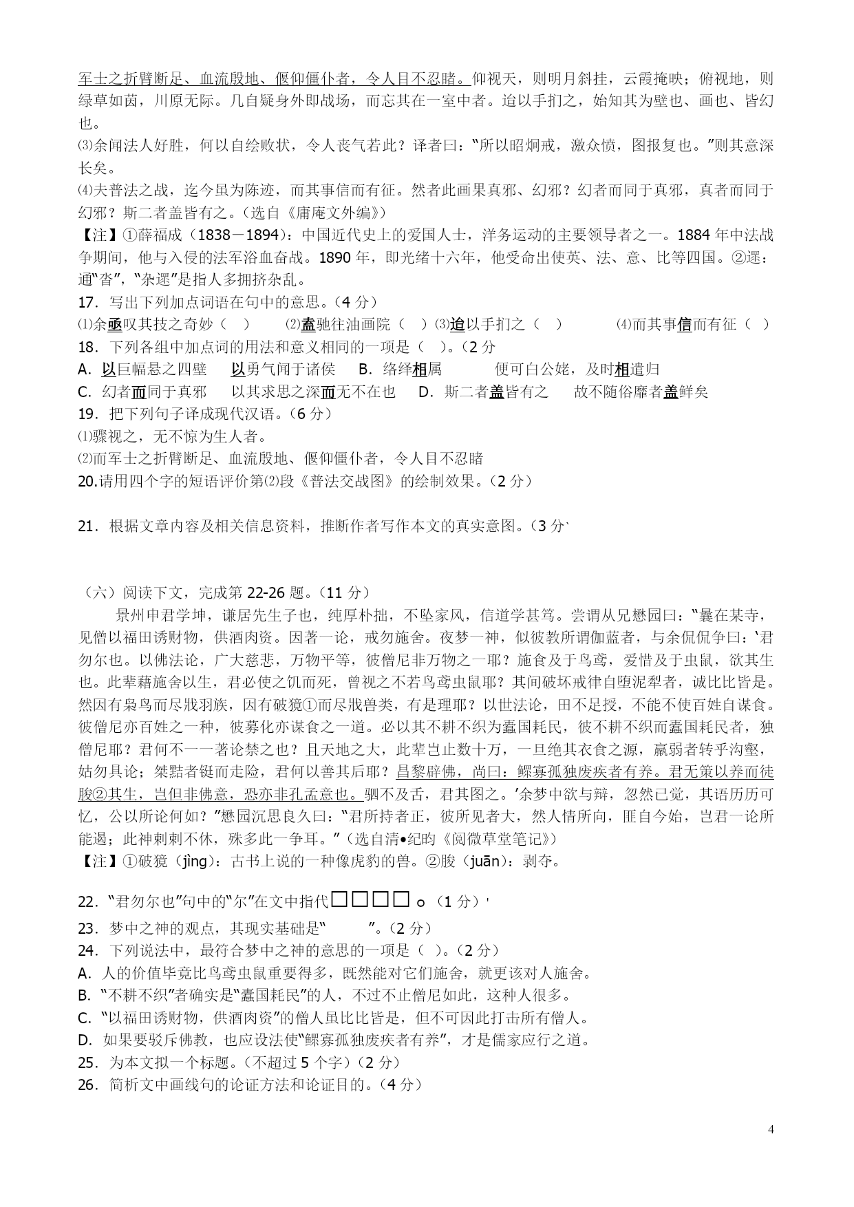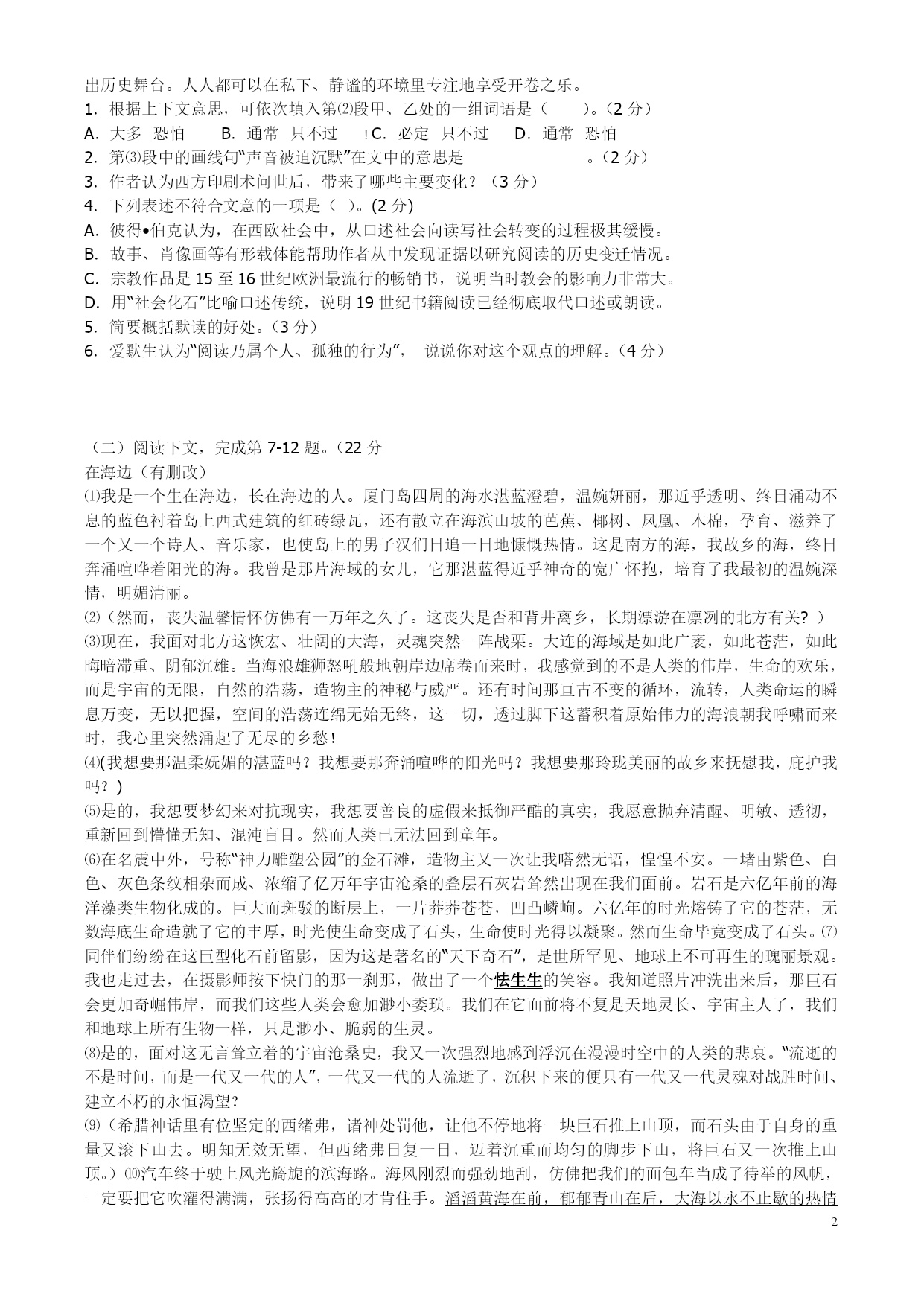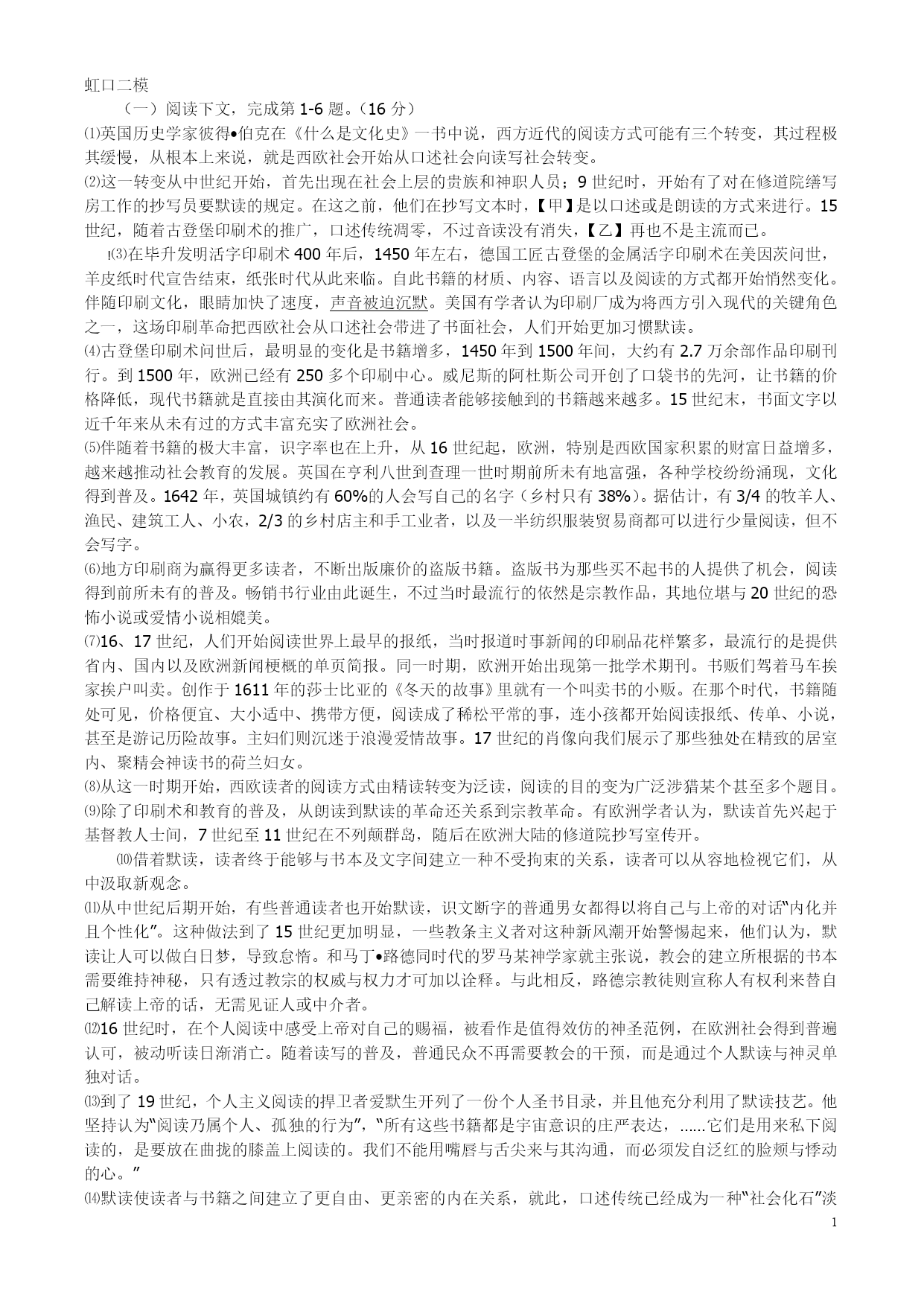 虹口二模 (一)阅读下文,完成第1-6题。(16分)⑴英国历史学家彼得•伯克在《什么是文化史》一书中说,西方近代的阅读方式可能有三个转变,其过程极其缓慢,从根本上来说,就是西欧社会开始从口述社会向读写社会转变。⑵这一转变从中世纪开始,首先出现在社会上层的贵族和神职人员;9世纪时,开始有了对在修道院缮写房工作的抄写员要默读的规定。在这之前,他们在抄写文本时,【甲】是以口述或是朗读的方式来进行。15世纪,随着古登堡印刷术的推广,口述传统凋零,不过音读没有消失,【乙】再也不是主流而已。 !⑶在毕升发明活字印刷术400年后,1450年左右,德国工匠古登堡的金属活字印刷术在美因茨问世,羊皮纸时代宣告结束,纸张时代从此来临。自此书籍的材质、内容、语言以及阅读的方式都开始悄然变化。伴随印刷文化,眼睛加快了速度,声音被迫沉默。美国有学者认为印刷厂成为将西方引入现代的关键角色之一,这场印刷革命把西欧社会从口述社会带进了书面社会,人们开始更加习惯默读。⑷古登堡印刷术问世后,最明显的变化是书籍增多,1450年到1500年间,大约有2.7万余部作品印刷刊行。到1500年,欧洲已经有250多个印刷中心。威尼斯的阿杜斯公司开创了口袋书的先河,让书籍的价格降低,现代书籍就是直接由其演化而来。普通读者能够接触到的书籍越来越多。15世纪末,书面文字以近千年来从未有过的方式丰富充实了欧洲社会。⑸伴随着书籍的极大丰富,识字率也在上升,从16世纪起,欧洲,特别是西欧国家积累的财富日益增多,越来越推动社会教育的发展。英国在亨利八世到查理一世时期前所未有地富强,各种学校纷纷涌现,文化得到普及。1642年,英国城镇约有60%的人会写自己的名字(乡村只有38%)。据估计,有3/4的牧羊人、渔民、建筑工人、小农,2/3的乡村店主和手工业者,以及一半纺织服装贸易商都可以进行少量阅读,但不会写字。⑹地方印刷商为赢得更多读者,不断出版廉价的盗版书籍。盗版书为那些买不起书的人提供了机会,阅读得到前所未有的普及。畅销书行业由此诞生,不过当时最流行的依然是宗教作品,其地位堪与20世纪的恐怖小说或爱情小说相媲美。⑺16、17世纪,人们开始阅读世界上最早的报纸,当时报道时事新闻的印刷品花样繁多,最流行的是提供省内、国内以及欧洲新闻梗概的单页简报。同一时期,欧洲开始出现第一批学术期刊。书贩们驾着马车挨家挨户叫卖。创作于1611年的莎士比亚的《冬天的故事》里就有一个叫卖书的小贩。在那个时代,书籍随处可见,价格便宜、大小适中、携带方便,阅读成了稀松平常的事,连小孩都开始阅读报纸、传单、小说,甚至是游记历险故事。主妇们则沉迷于浪漫爱情故事。17世纪的肖像向我们展示了那些独处在精致的居室内、聚精会神读书的荷兰妇女。⑻从这一时期开始,西欧读者的阅读方式由精读转变为泛读,阅读的目的变为广泛涉猎某个甚至多个题目。⑼除了印刷术和教育的普及,从朗读到默读的革命还关系到宗教革命。有欧洲学者认为,默读首先兴起于基督教人士间,7世纪至11世纪在不列颠群岛,随后在欧洲大陆的修道院抄写室传开。 ⑽借着默读,读者终于能够与书本及文字间建立一种不受拘束的关系,读者可以从容地检视它们,从中汲取新观念。⑾从中世纪后期开始,有些普通读者也开始默读,识文断字的普通男女都得以将自己与上帝的对话“内化并且个性化”。这种做法到了15世纪更加明显,一些教条主义者对这种新风潮开始警惕起来,他们认为,默读让人可以做白日梦,导致怠惰。和马丁•路德同时代的罗马某神学家就主张说,教会的建立所根据的书本需要维持神秘,只有透过教宗的权威与权力才可加以诠释。与此相反,路德宗教徒则宣称人有权利来替自己解读上帝的话,无需见证人或中介者。⑿16世纪时,在个人阅读中感受上帝对自己的赐福,被看作是值得效仿的神圣范例,在欧洲社会得到普遍认可,被动听读日渐消亡。随着读写的普及,普通民众不再需要教会的干预,而是通过个人默读与神灵单独对话。⒀到了19世纪,个人主义阅读的捍卫者爱默生开列了一份个人圣书目录,并且他充分利用了默读技艺。他坚持认为“阅读乃属个人、孤独的行为”,“所有这些书籍都是宇宙意识的庄严表达,……它们是用来私下阅读的,是要放在曲拢的膝盖上阅读的。我们不能用嘴唇与舌尖来与其沟通,而必须发自泛红的脸颊与悸动的心。”⒁默读使读者与书籍之间建立了更自由、更亲密的内在关系,就此,口述传统已经成为一种“社会化石”淡出历史舞台。人人都可以在私下、静谧的环境里专注地享受开卷之乐。1.根据上下文意思,可依次填入第⑵段甲、乙处的一组词语是()。(2分)A.大多恐怕B.通常只不过!C.必定只不过D.通常恐怕2.第⑶段中的画线句“声音被迫沉默”在文中的意思是。(2分)3.作者认为西方印刷术问世后,带来了哪些主要变化?(3分)4.下列表述不符合文意的一项是()。(2分)A.彼得
